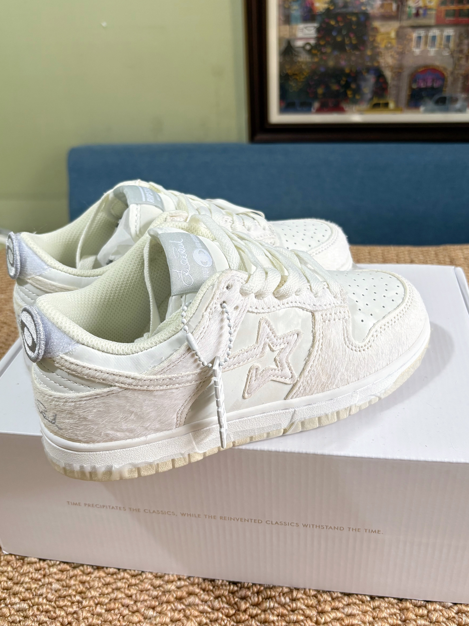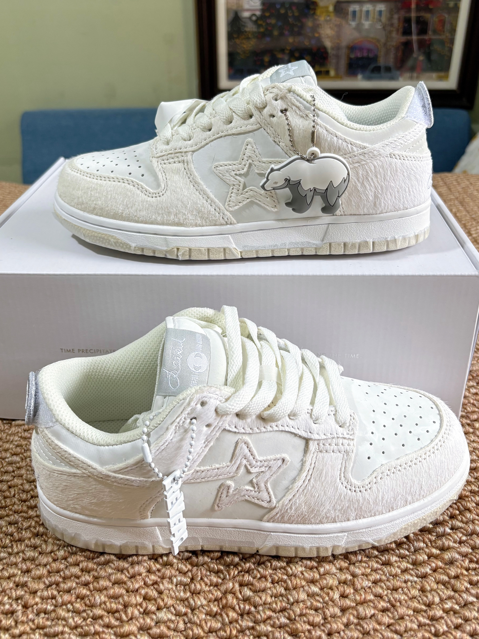这个鞋收到满惊喜的,上脚也很秀气,颜色是奶白色,插鞋面是毛绒绒的,上脚也很舒服!!