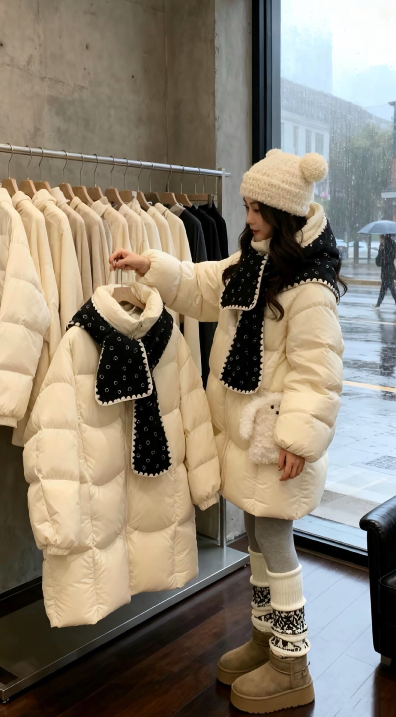 暖意从这件奶白棉服里漫出来。蓬松的中长版型裹住所有凉意,小熊针织帽的绒球跟着脚步轻轻晃,波点围巾的花边蹭过脸颊,还有靴筒上的针织花纹悄悄呼应。像把冬日的软萌与温柔都穿在身上,逛店时撞见镜里的自己,连雨幕都变得可爱起来 #冬日甜美女孩穿搭#宝藏棉服#秋冬ootd