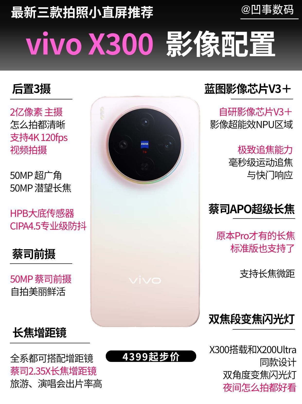 继9月果子与小米推出新机后,vivo X300系列也终于登场了。看完发布会,博主火速整理了这三款热门拍照小屏机型的参数对比,每一款都有自己独特的亮点,大家可以按喜好和需求来选择。 1️⃣ 来看刚刚发布的vivo X300,虽未命名Pro,但可以看作是上代爆款X200 Pro mini的完全升级版,实际配置堪称“小Pro”。除了继续保持轻薄手感和一流屏幕素质,影像上更有显著突破,搭载蔡司2亿像素主...