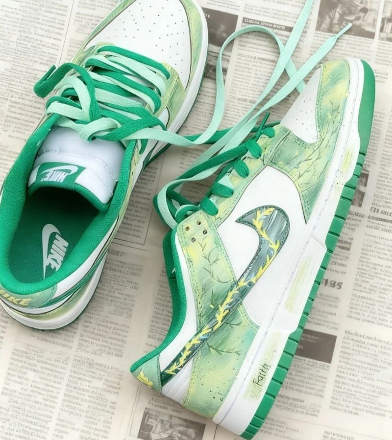 入手这双定制绿调球鞋有一阵了~先说穿着感,鞋型偏瘦,我平时穿42码,这双得选42.5,不然前掌有点挤脚😅。鞋面的绿白纹理是真的特别,上街回头率挺高,但也因为是定制款,打理得小心,沾了灰得及时擦,不然纹理容易显脏。 脚感嘛,日常走路还可以,但是长时间站着或者快走,就觉得缓震一般般,脚底会有点酸。不过胜在设计独特,配运动裤、工装裤都挺搭,算是在颜值和实用性之间找了个平衡。要是脚宽或者追求极致舒适...