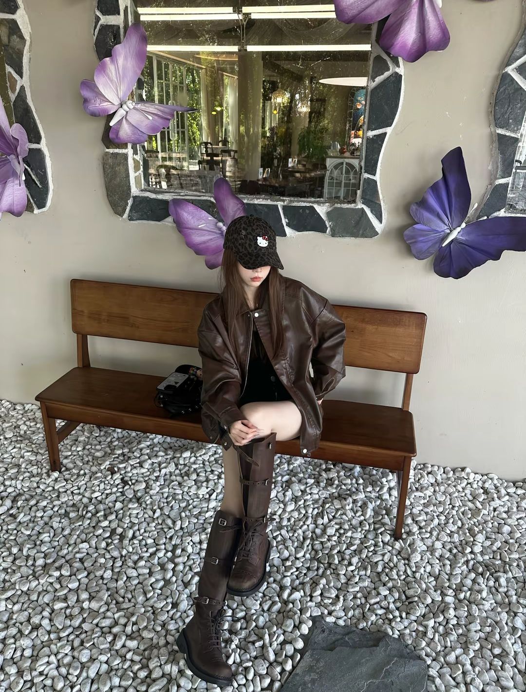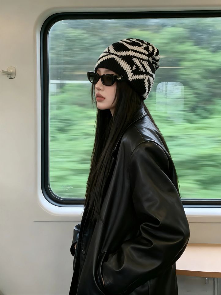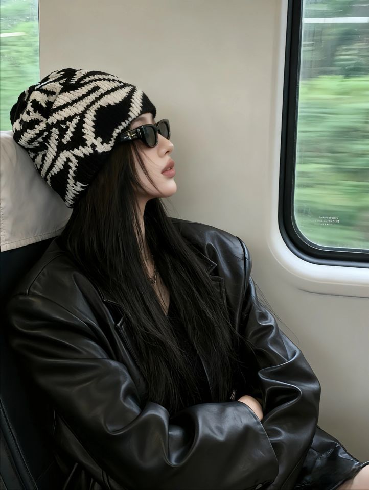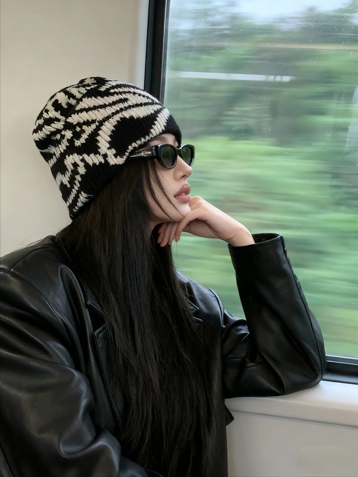 黑白花纹针织冷帽自带潮酷buff,把慵懒随性狠狠拿捏;搭配一副窄框墨镜,瞬间拉满拽姐气场,还能悄咪咪修饰脸型~oversize黑色皮西装是整个造型的灵魂,宽松版型慵懒又显瘦,皮质质感高级到不行,不管是单穿还是叠搭都很绝! 这套穿搭把甜酷平衡得刚刚好,坐高铁、逛街头都能轻松hold住,早秋想走酷飒风的姐妹,直接抄作业就完事儿!