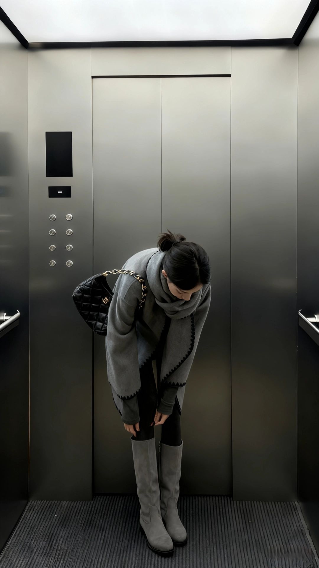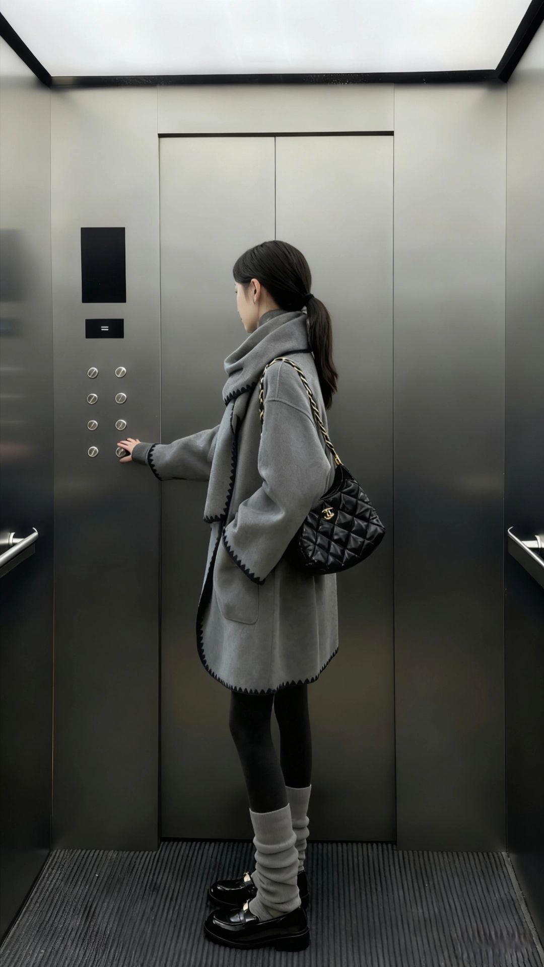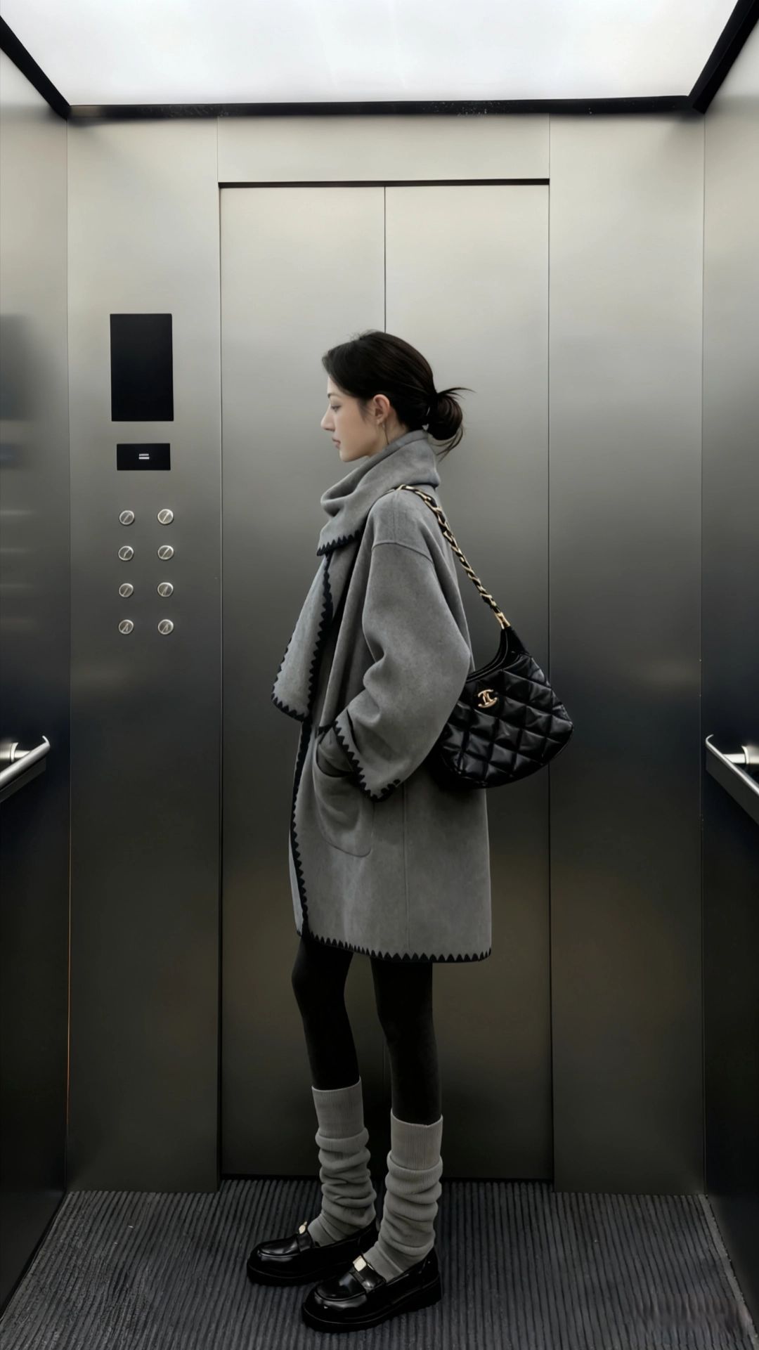 这件灰调麂皮大衣真的是秋冬天菜——毛边细节自带随性滤镜,同色系围巾一裹,冷感氛围直接拉满;内搭紧身黑裤+堆堆靴,上宽下窄的“藏肉公式”谁穿谁懂,小个子也能穿出利落腿长! 最妙的是这只菱格链条包,冷调里掺点精致感,甜酷平衡得刚好。往电梯间一站,不用露脸都自带“不好惹但很好看”的气场,通勤/出街都能直接封神~ 这套“大衣+紧身下装+精致配饰”的公式,秋冬辣妹直接抄作业!