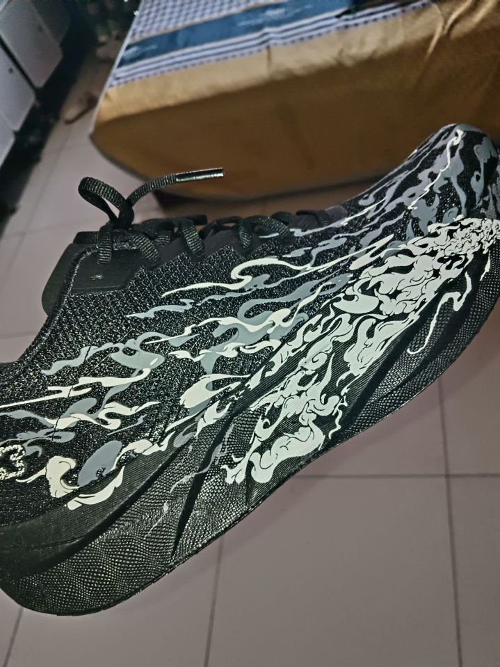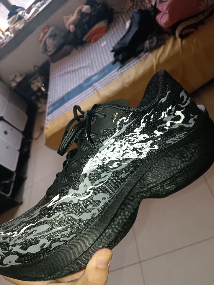 实物非常帅 《踏焰而行,快过风》 上翘科技蹬地即弹射,波动碳板撑出每步锋芒 6mm强差踩碎阻力,云纹覆面—— 脚边是焰,脚下是风,跑赢下一秒的自己。
