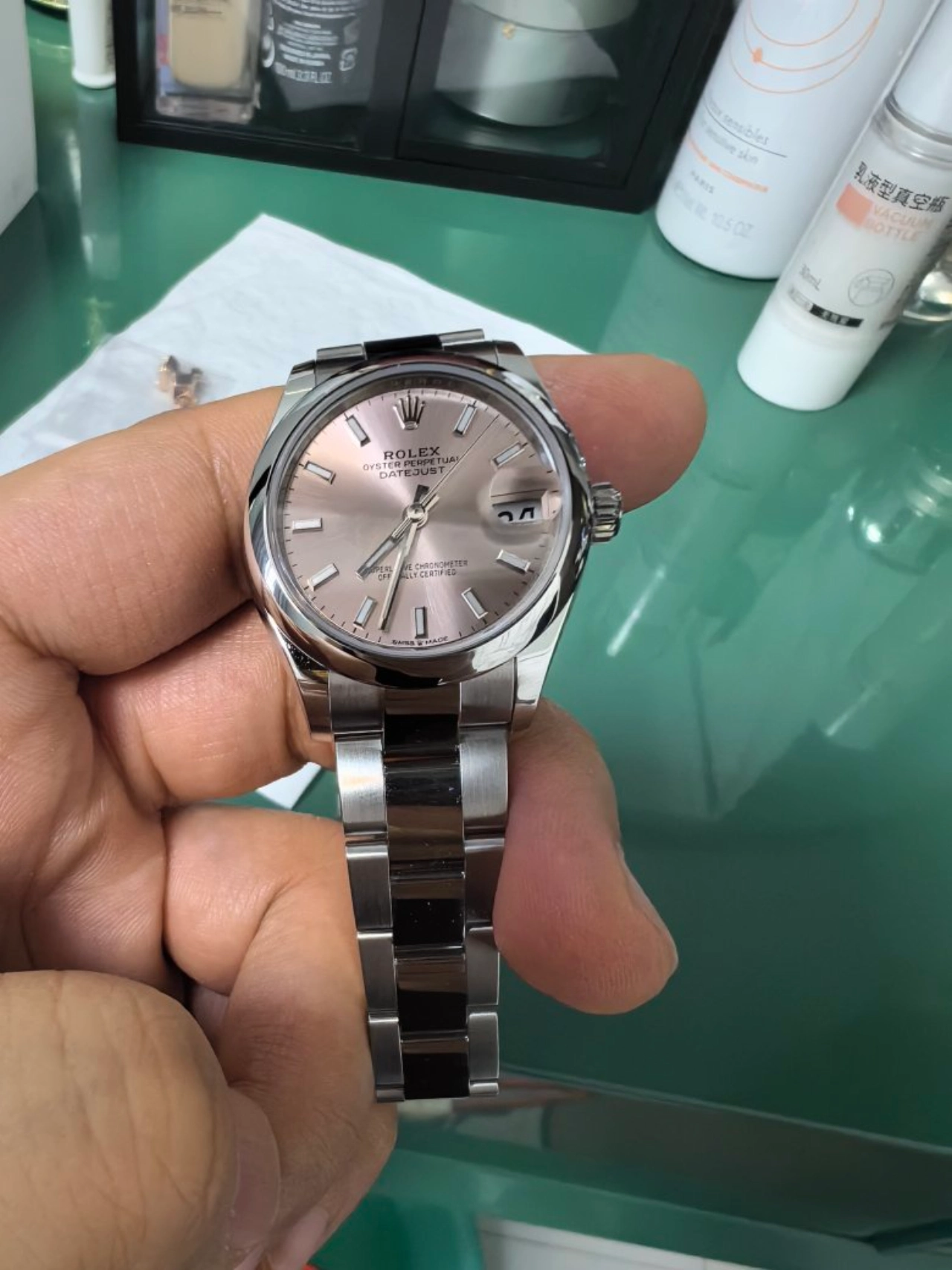 我选礼物可太纠结了,之前考虑过卡地亚、肖邦,最后还是选了劳力士日志型这块表送老婆当纪念日礼物~粉盘很柔和自然,31mm尺寸对女生很友好,蚝式钢表带质感棒,我还去给她取了两截表带,调整后贴合手腕超合适~自动机械机芯走时稳定,100米防水日常也不用担心碰水损坏。现在她戴出去朋友都夸好看,说显贵气还实用!不过要是预算有限的话,入手前得再掂量掂量,毕竟价格不低~但用来记录重要时刻,我觉得值!我自己都种草了...