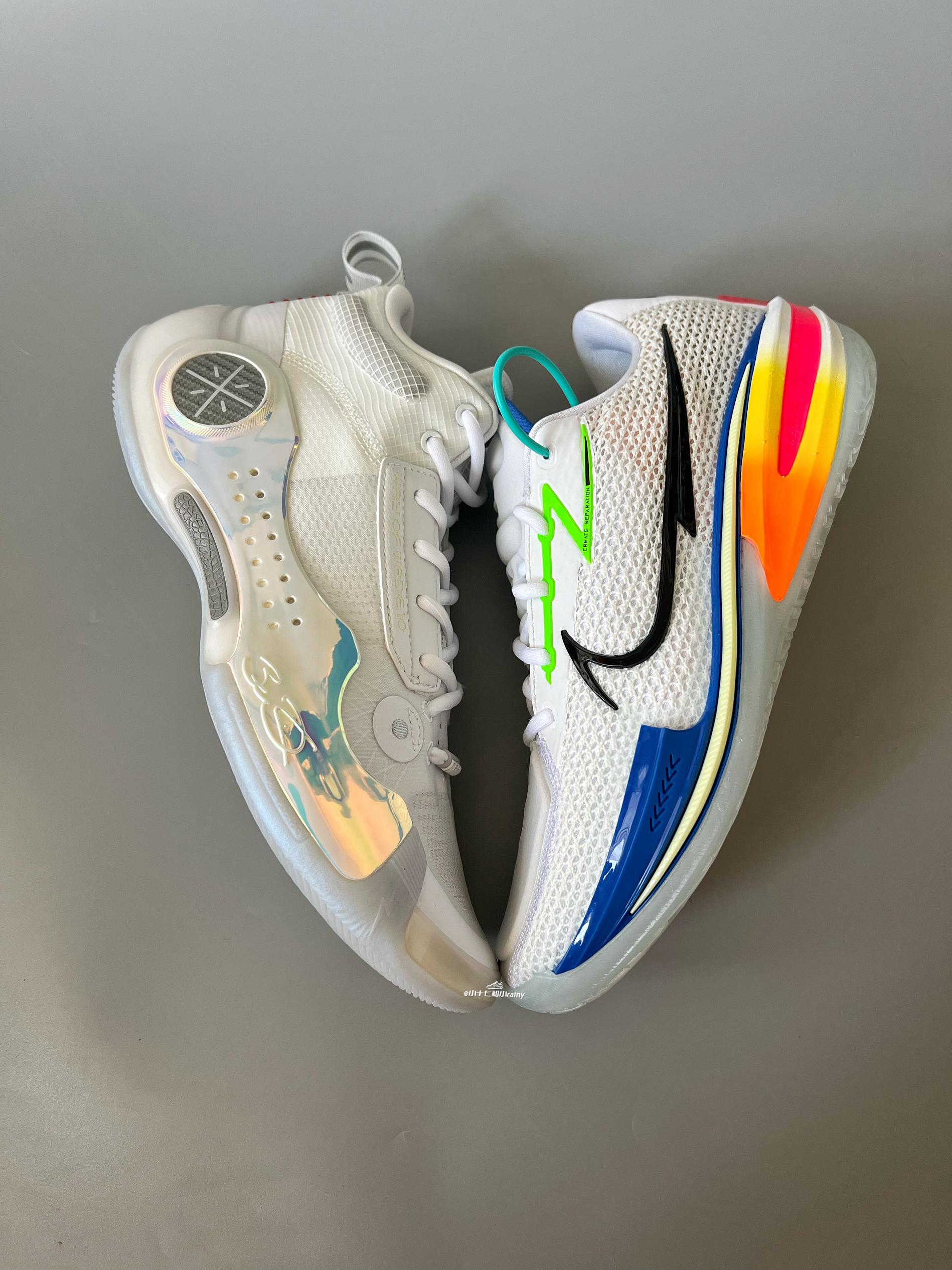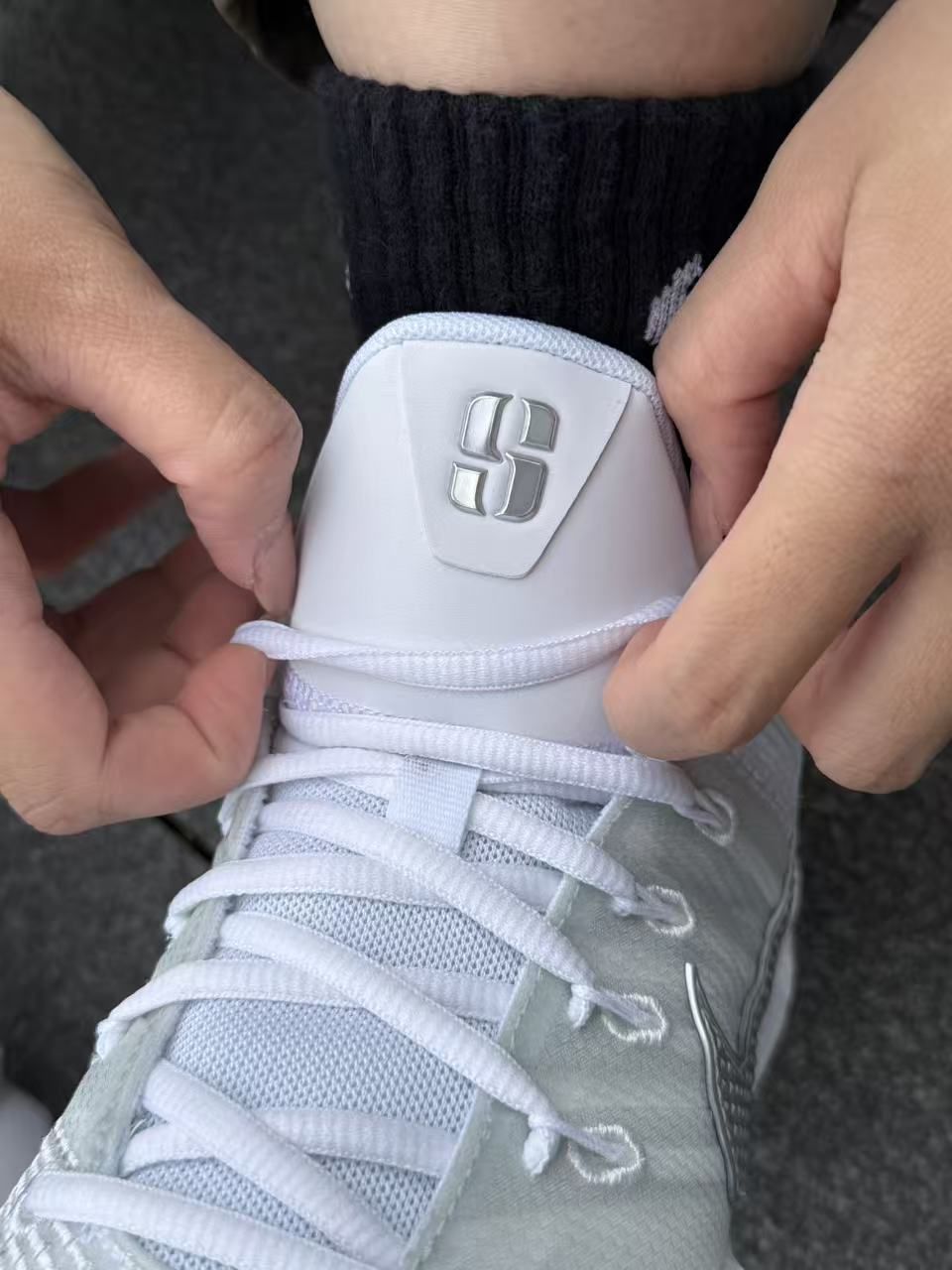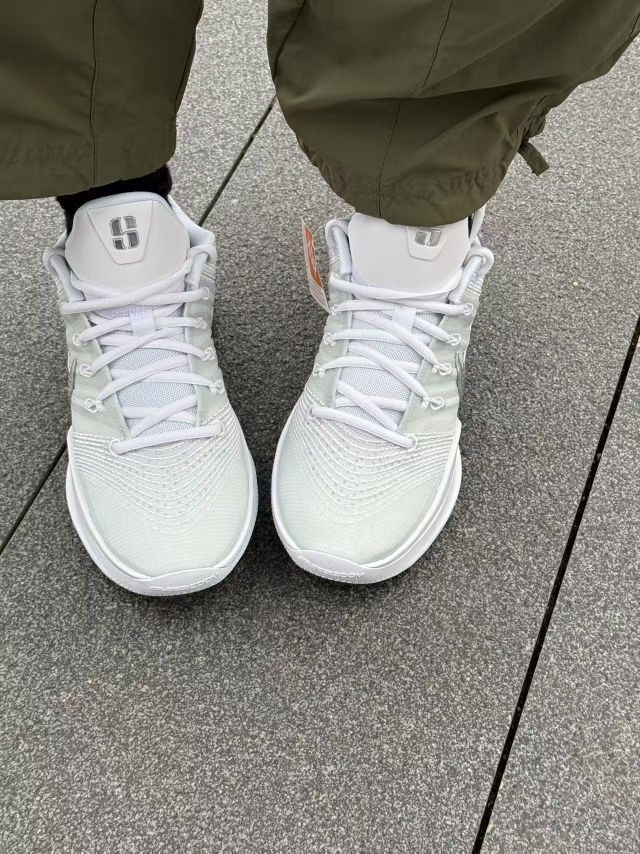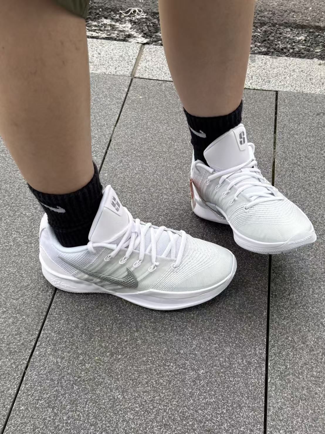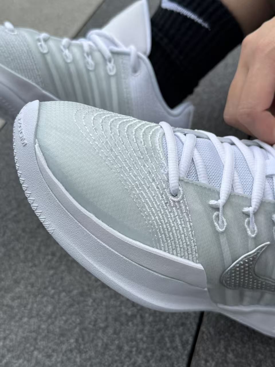 鞋子整体以白色为主,鞋面由纱线编制而成,最吸引眼球的,当然是这次的Nikelogo,银色加上一颗颗的凸点,光照的反射下,有种镶钻的感觉,这个配色用到的是xdr的大底,终于不是那种非常容易发黄的水晶底。初上脚感觉包裹很好,缓震也足够,抗扭方面虽然没有碳板但还是足够的,尺码也是正常。
