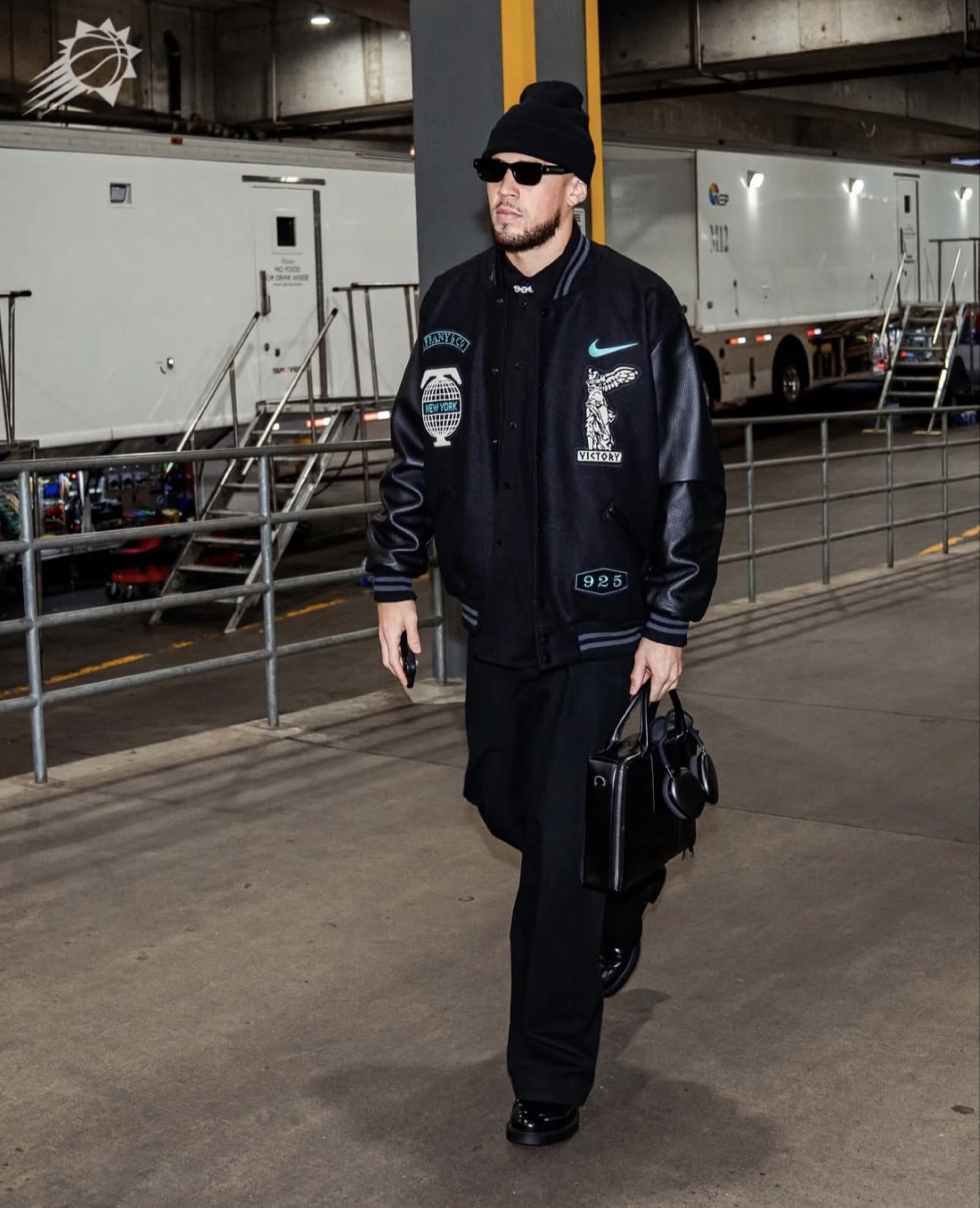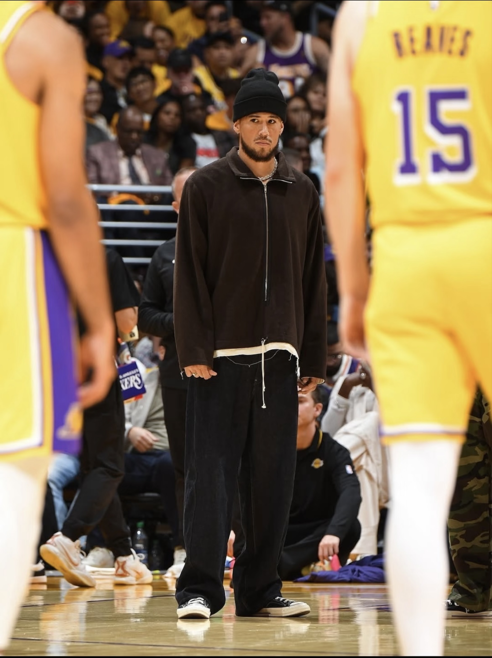 看德文·布克在湖人主场的这一身,直接把“慵懒潮酷”焊在身上!深棕拉链外套+黑色阔腿裤,再叠戴冷帽与银链,松弛感拉满还带点暗黑质感,脚下匡威一踩,球场边秒变时尚秀场~ 从赛场得分王到穿搭模板,布克这套“随性不随便”的公式太绝了——宽松廓形+基础款叠穿,把街头风与高级感玩得明明白白,男生想走潮男路线?跟布克学就对了!