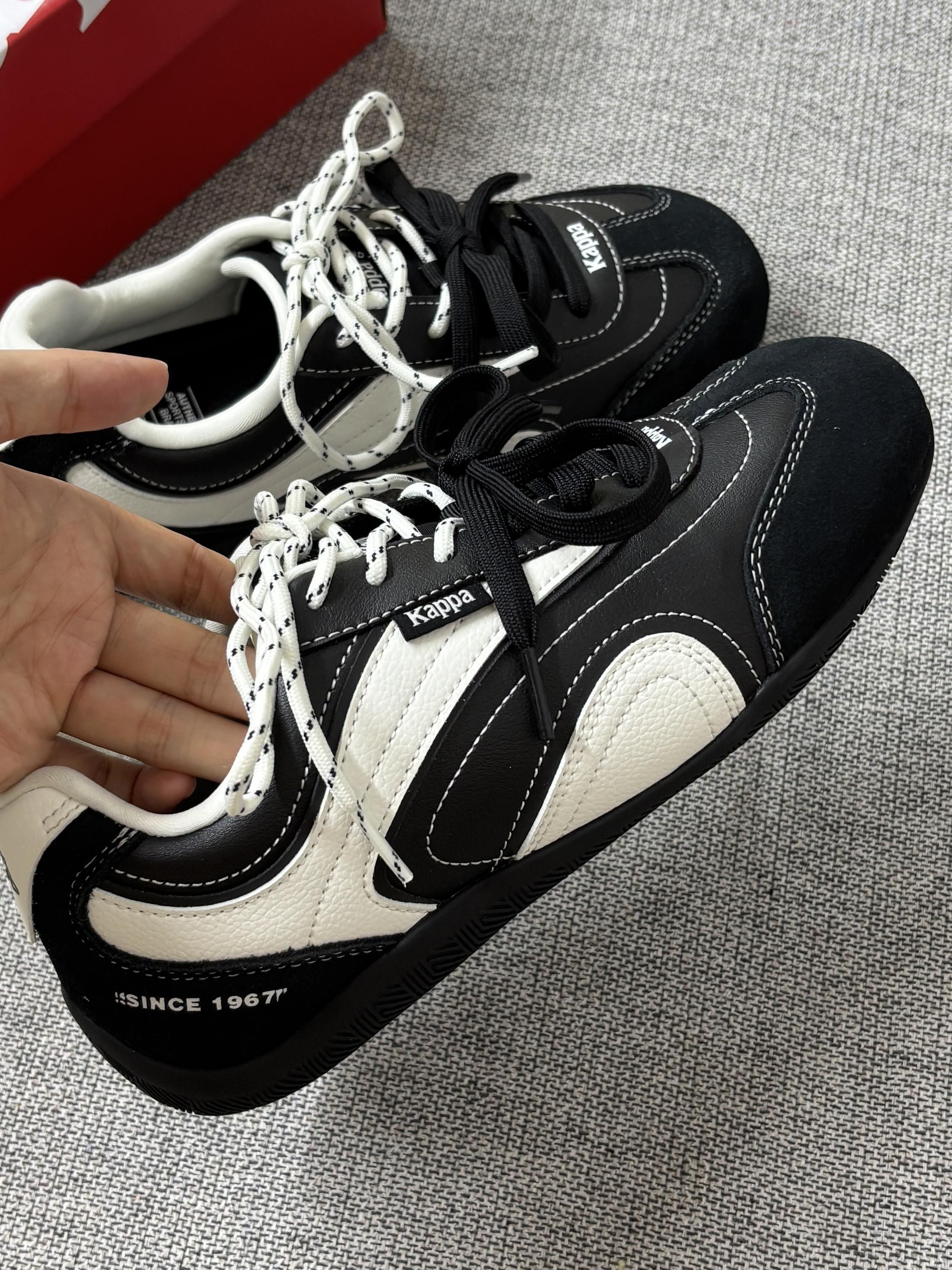 经典黑白撞色+皮质拼接,鞋身走线细节全是高级感!鞋侧的Kappa标低调又有辨识度,圆头鞋型把脚裹得巨秀气,完全没有运动鞋的笨重感~自带的双鞋带(黑+白纹)还能DIY甜酷/复古风,配裙子、牛仔裤都能搭出“不费力的时髦”!
