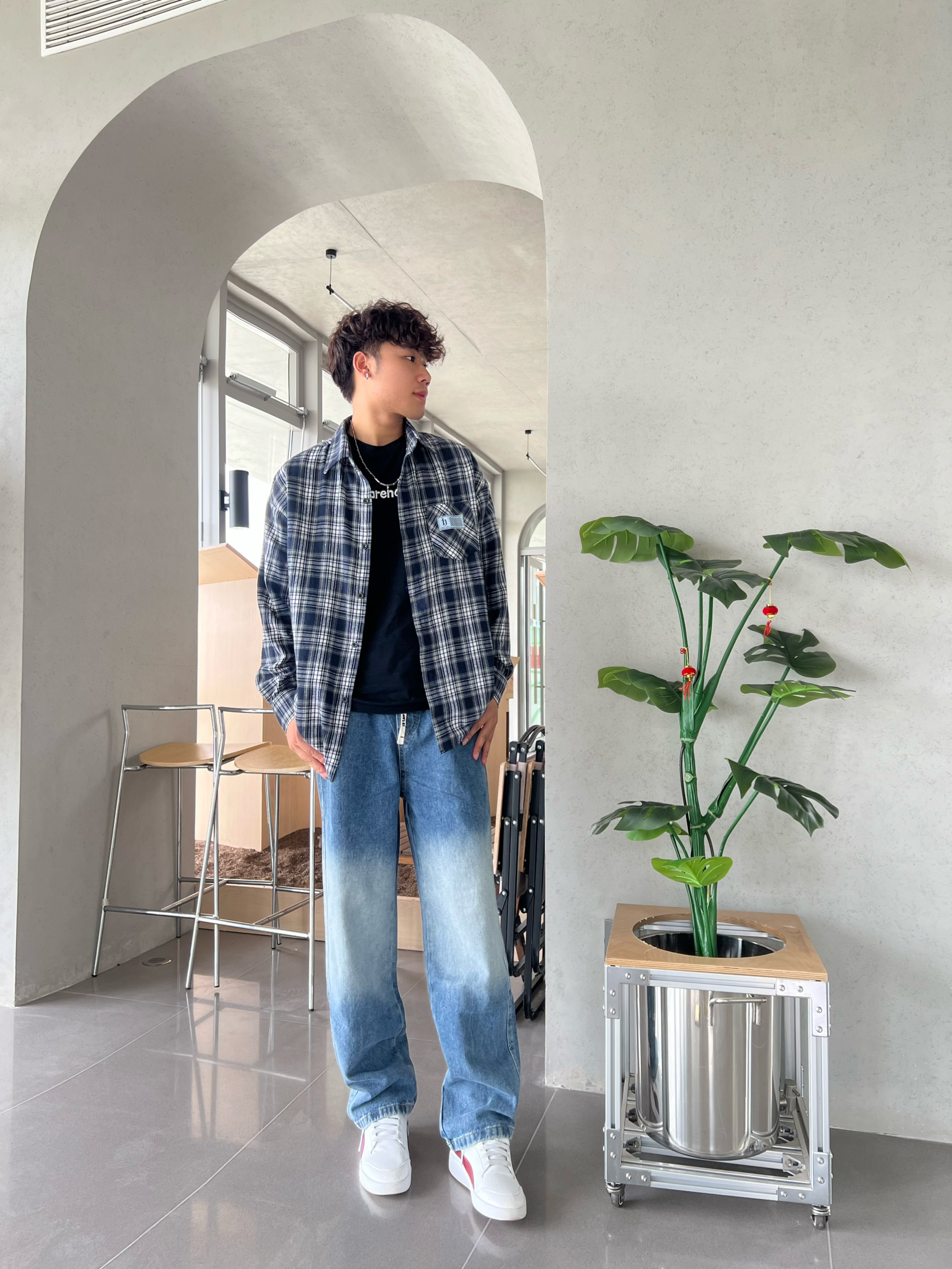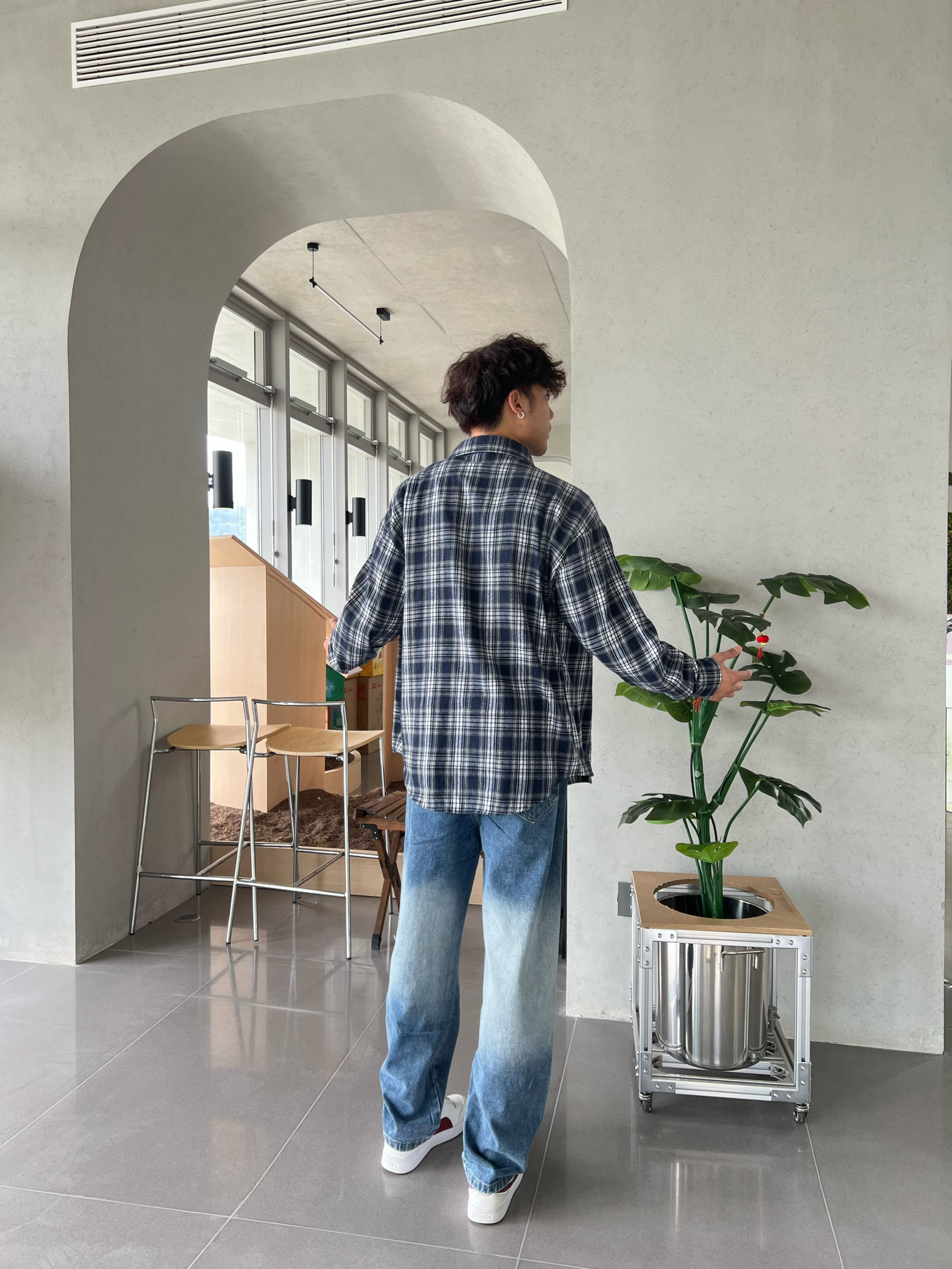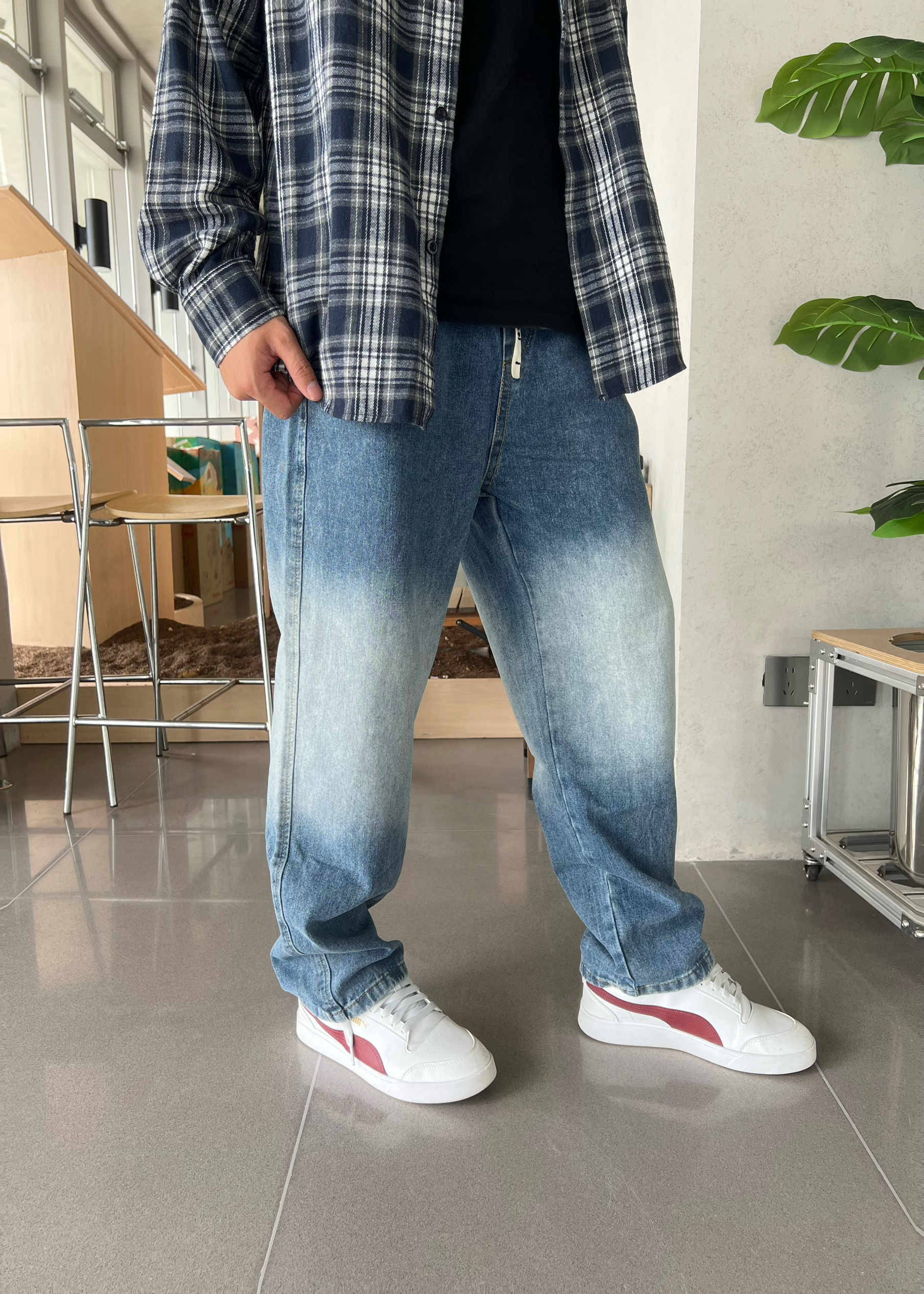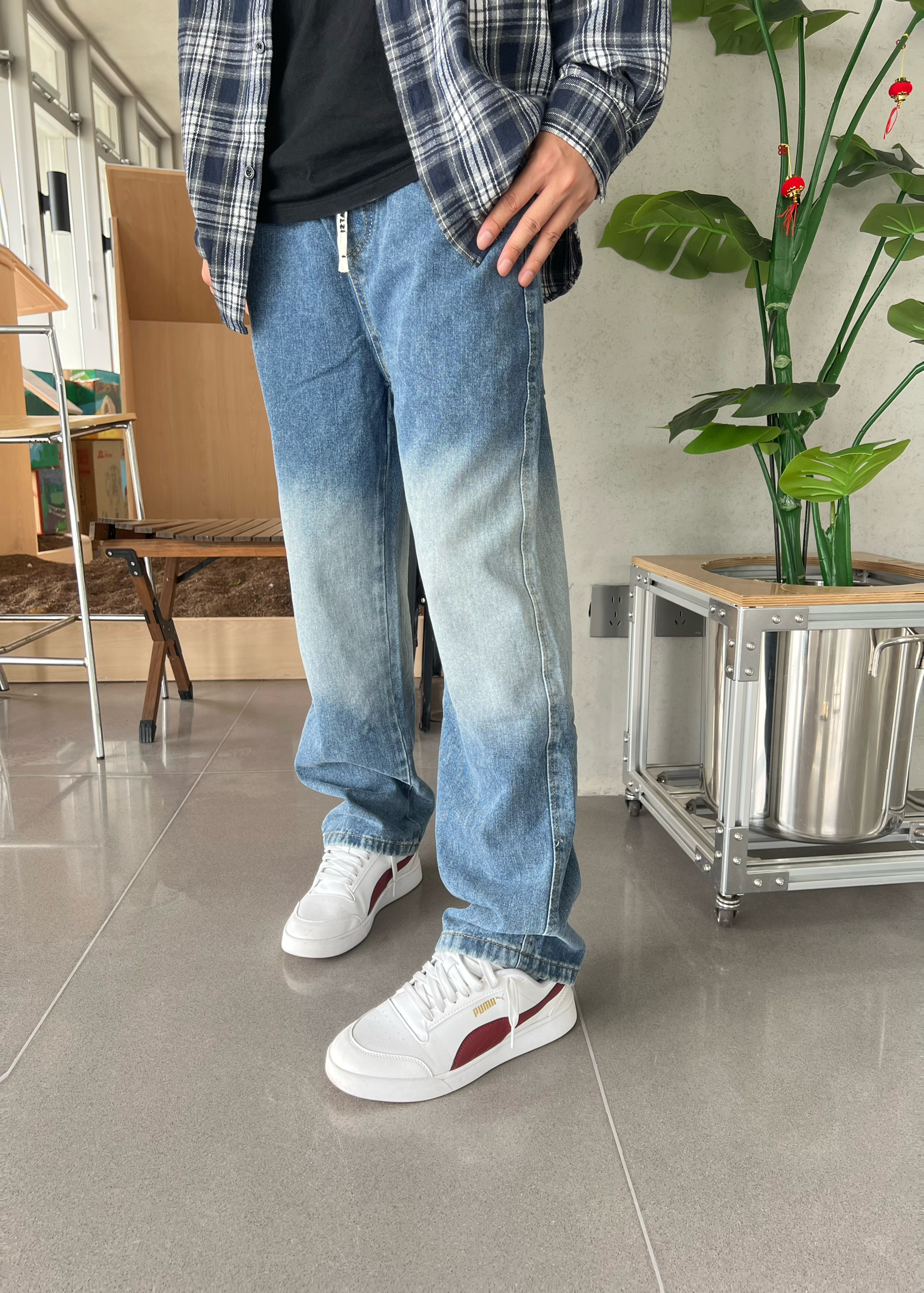 这裤子拿到手是软乎乎的牛仔料,不是那种硬邦邦硌腿的款,贴腿裹得舒服但不绷。渐变做的是从腰到裤脚慢慢浅下来的,不是那种生硬的色块,搭宽松衬衫刚好能露出裤型的垂感,走起来裤脚晃荡着也不拖沓,属于“随便穿穿但镜头里特出片”的类型~
