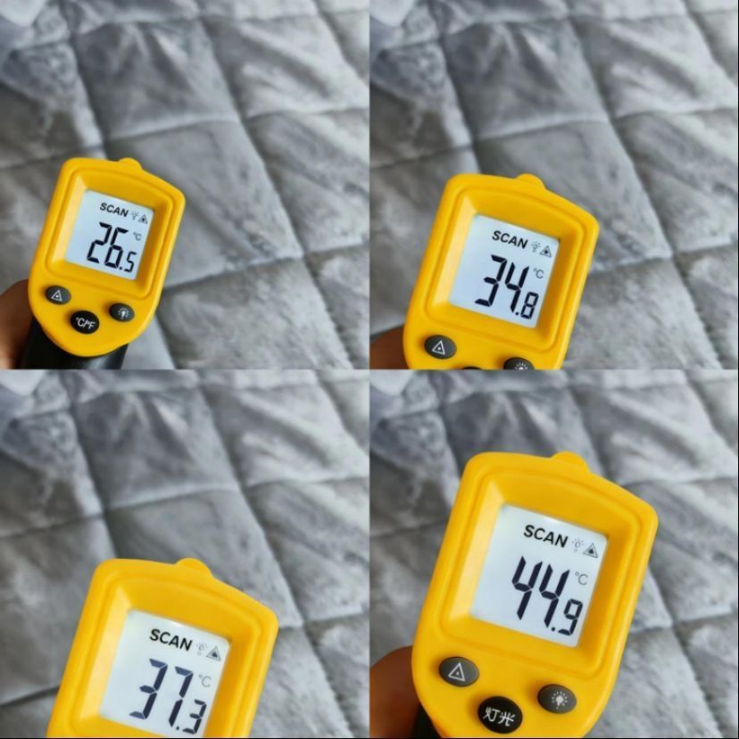 打开以后温45度°等待1/3/5分钟后,没想到升温迅速,从26.5°/34.8°/37.3°,仅需5分钟左右,床面整体温度即可升至37.3℃,10分钟后温度升至44.9°,无论翻身还是调整睡姿,都能感受到一致的温暖。