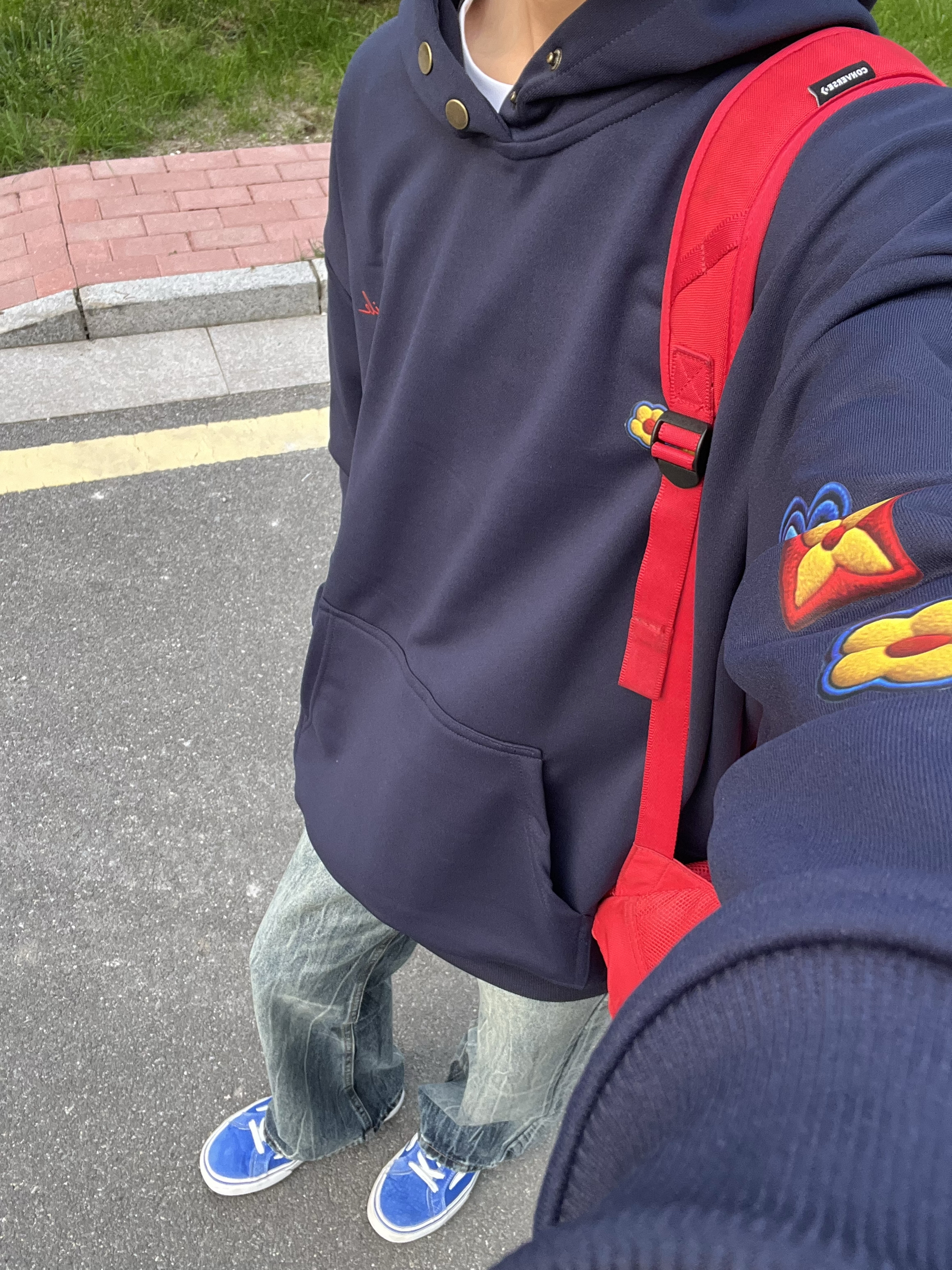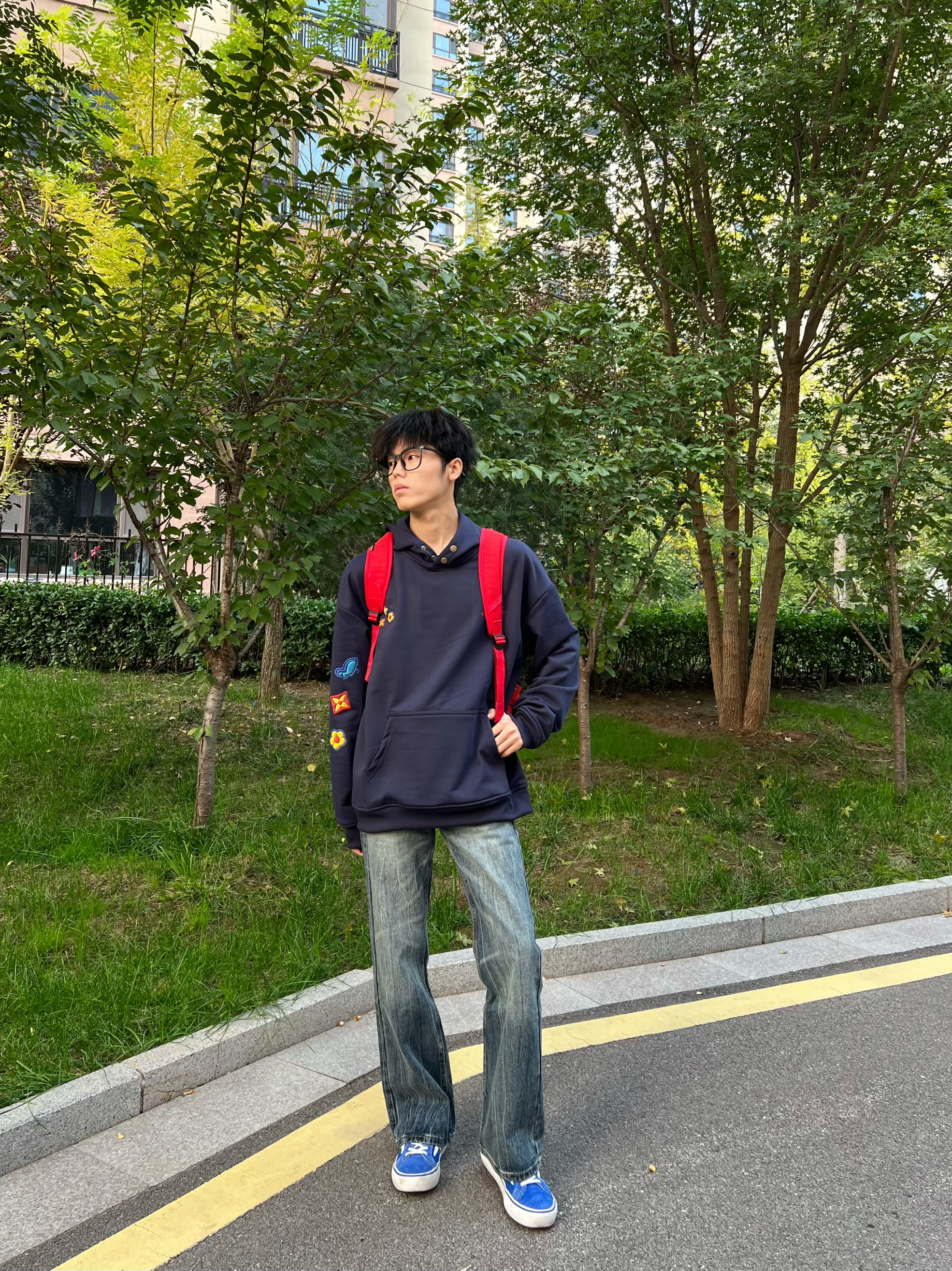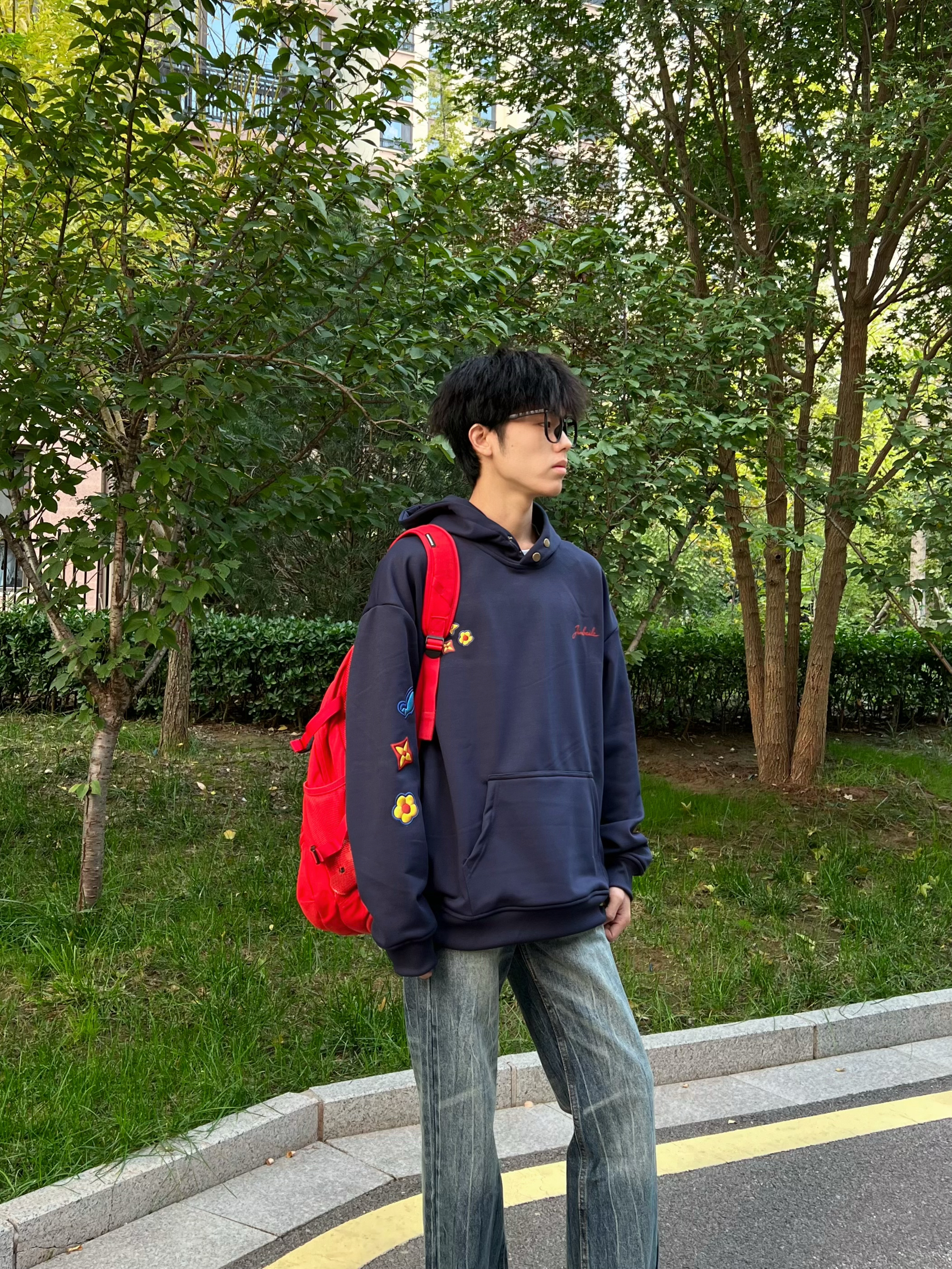 很喜欢这件花朵卫衣呀~ 藏青色上身超显白的 带帽设计出去玩就很方便 搭配牛仔裤小板鞋简单帅气!