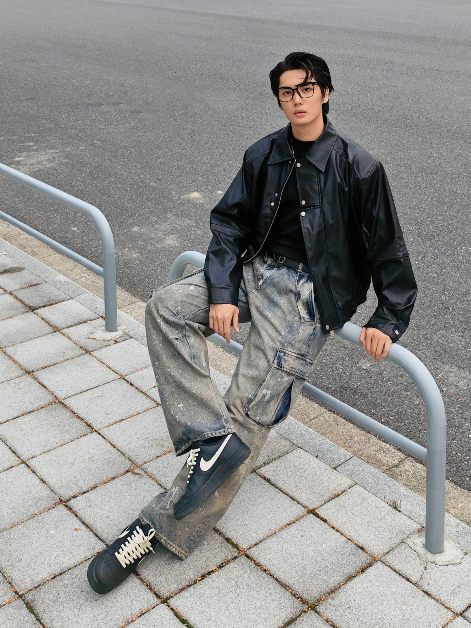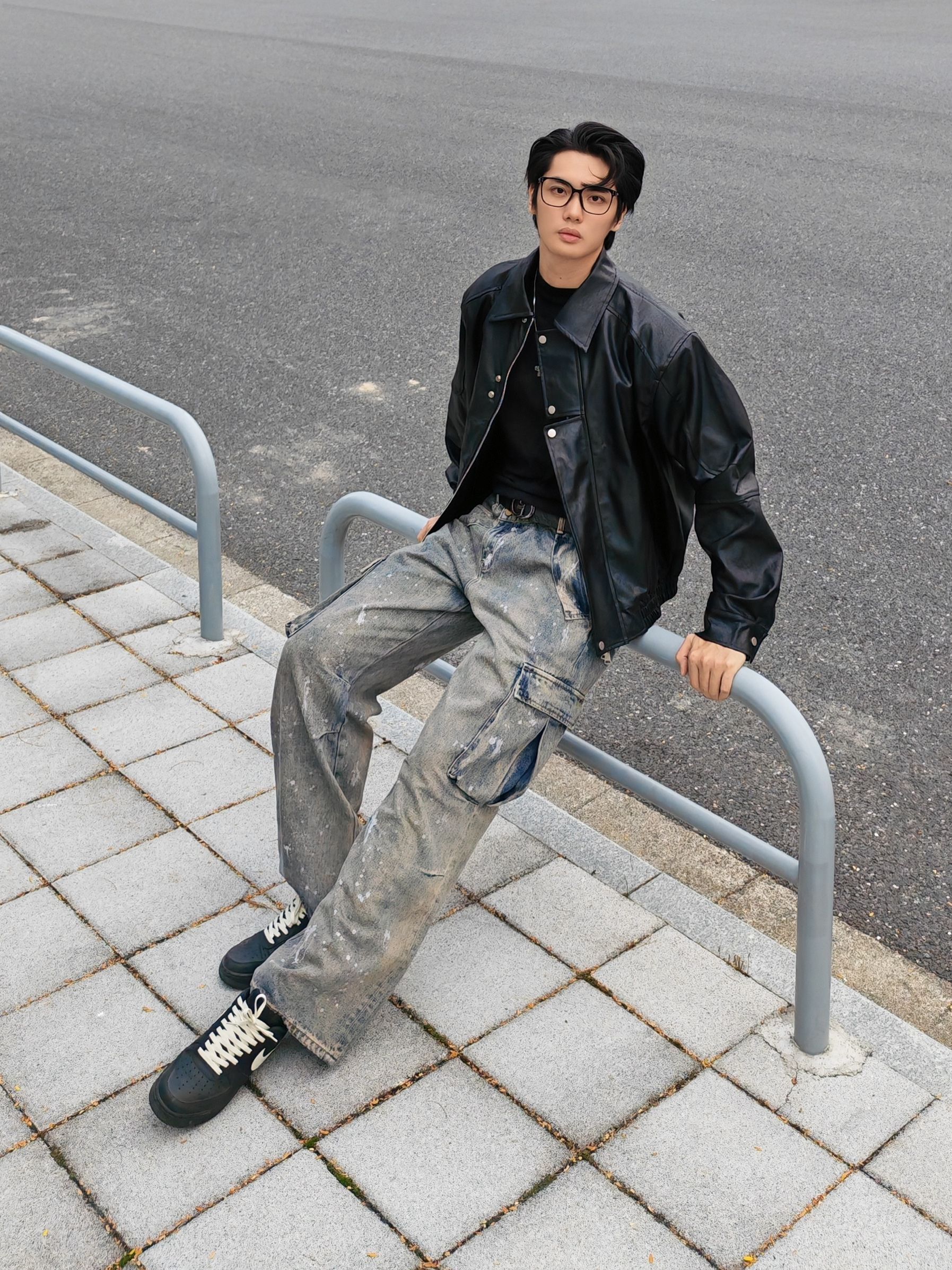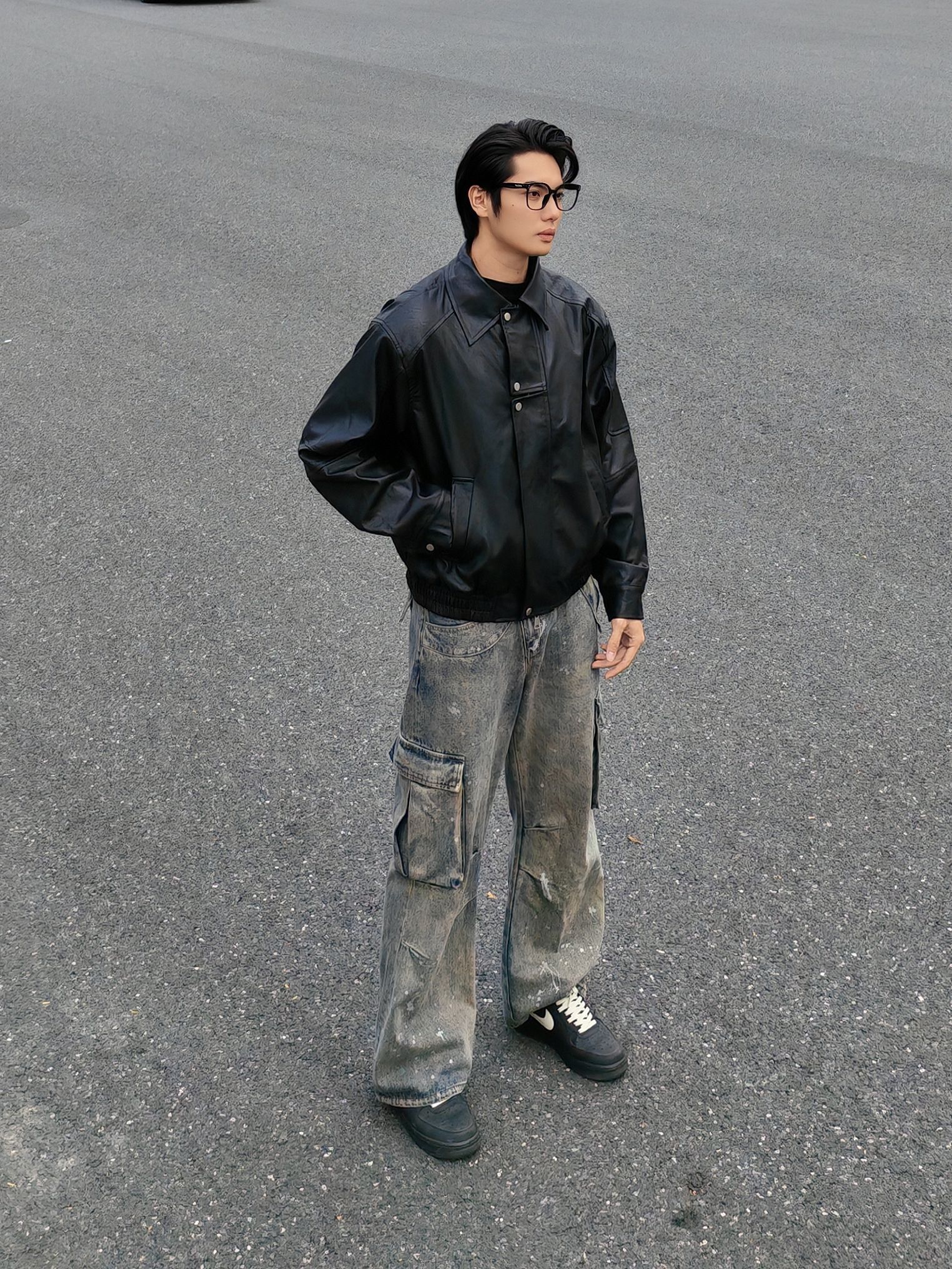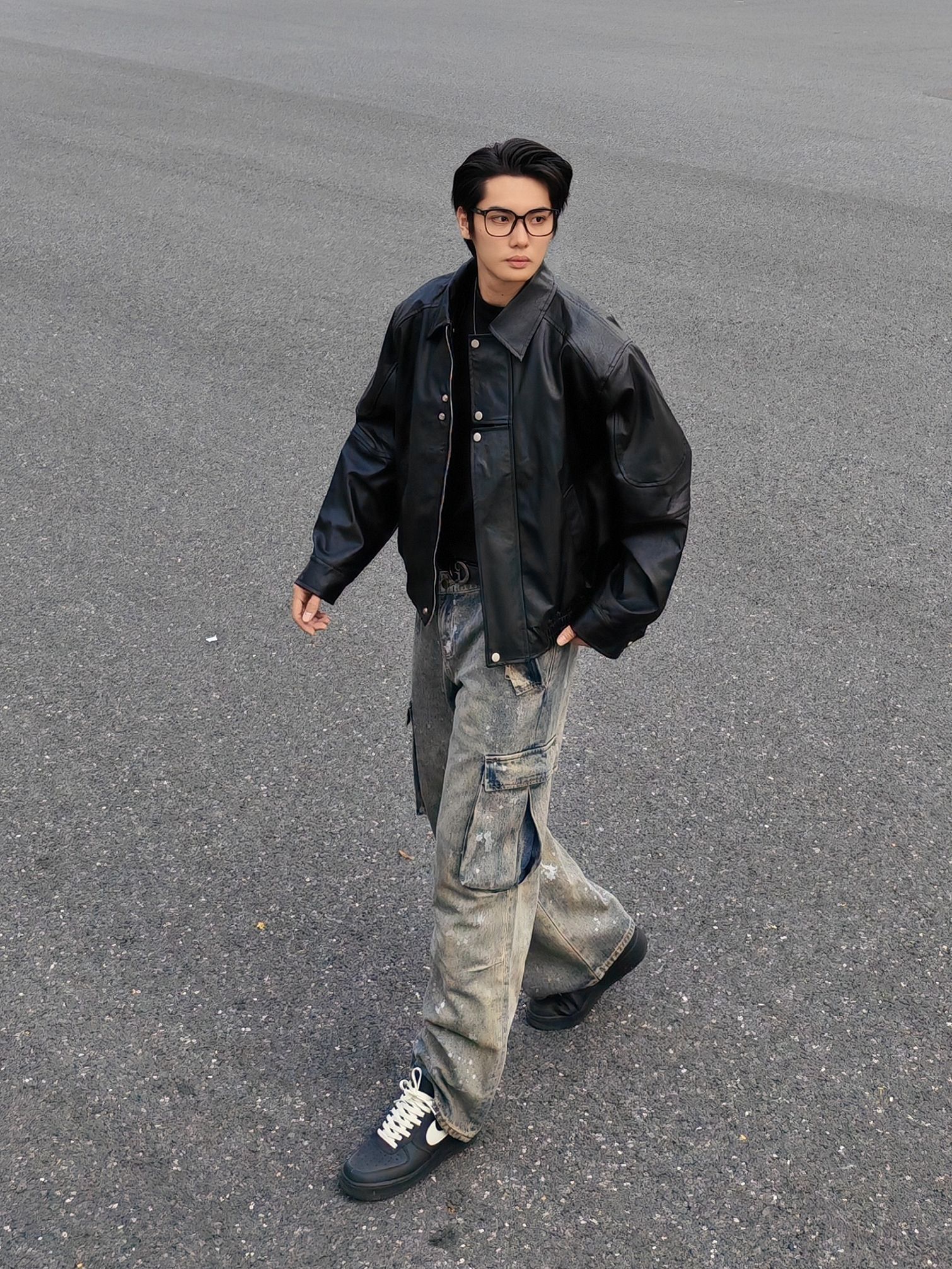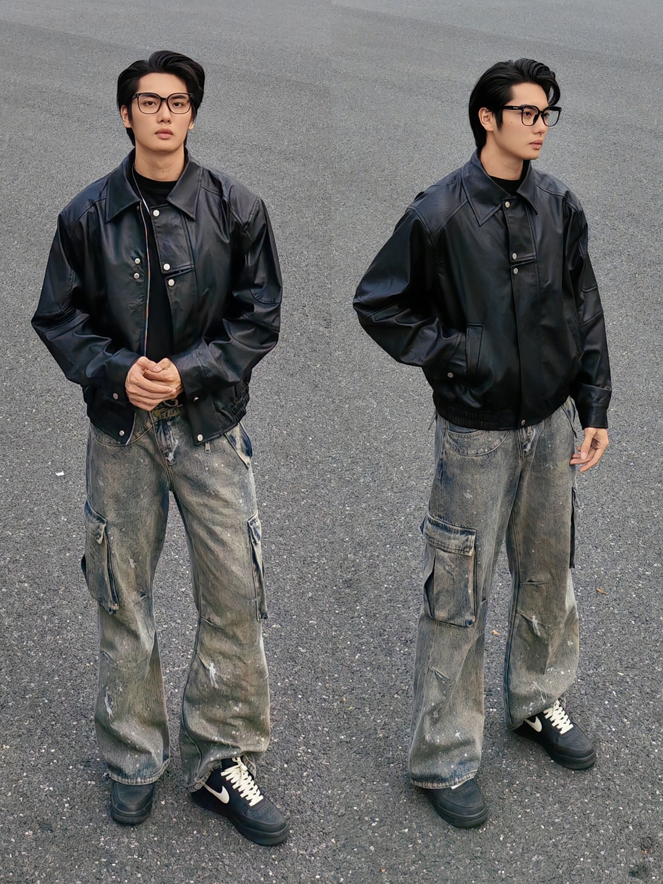 今天是暗黑街头复古风 外套:黑色机车皮夹克,硬朗有质感,美式翻领阔版设计,立挺有型。 内搭:黑色高领打底衫,简约百搭 下装:做旧泼墨工装牛仔裤,自带复古滤镜 鞋子:定制nike板鞋,经典又舒适。
