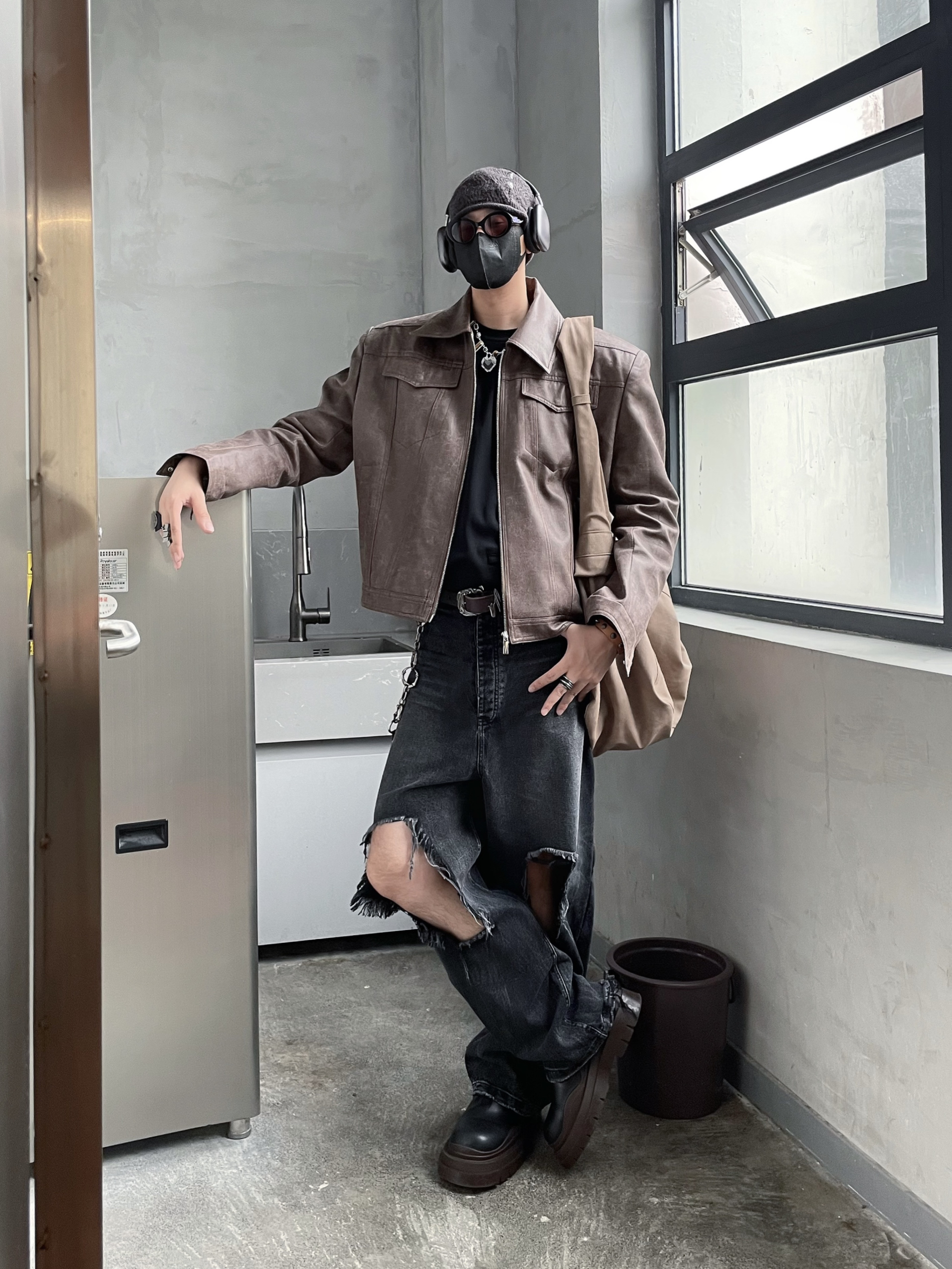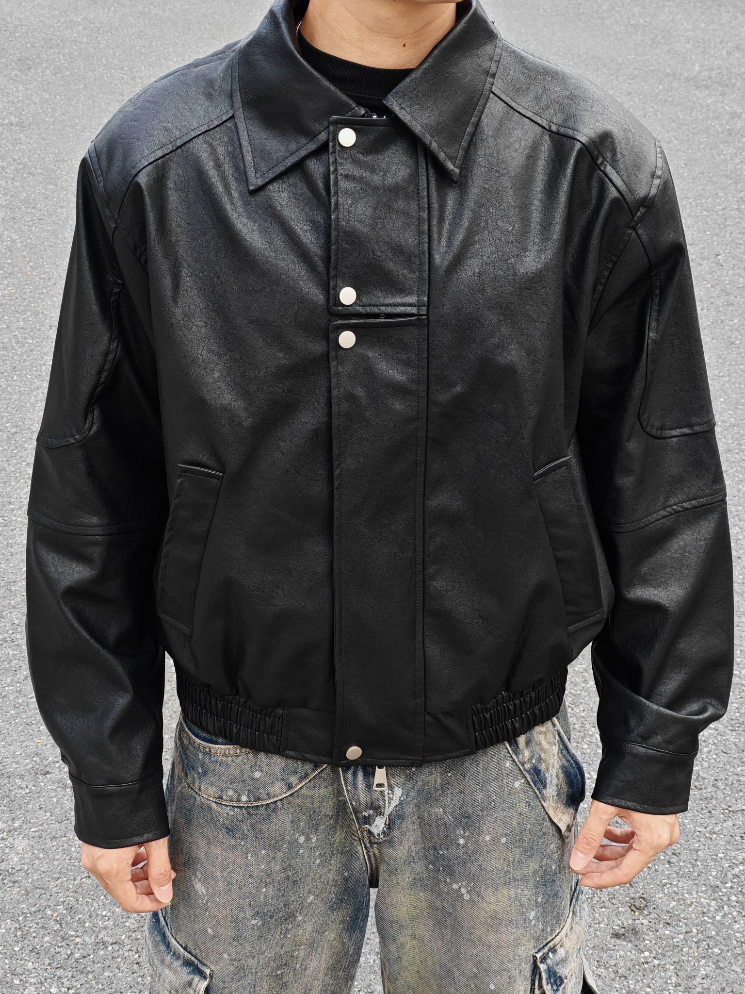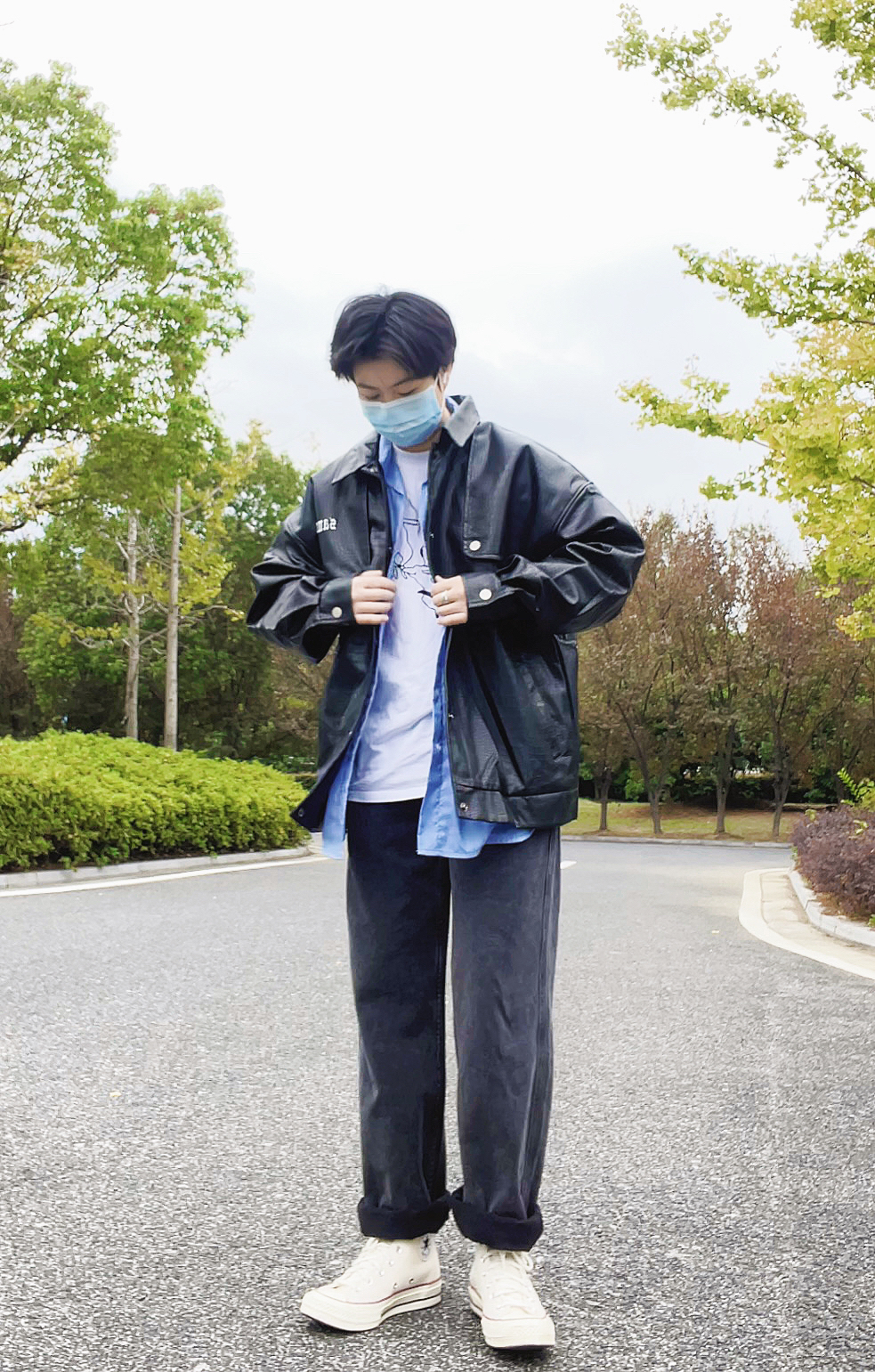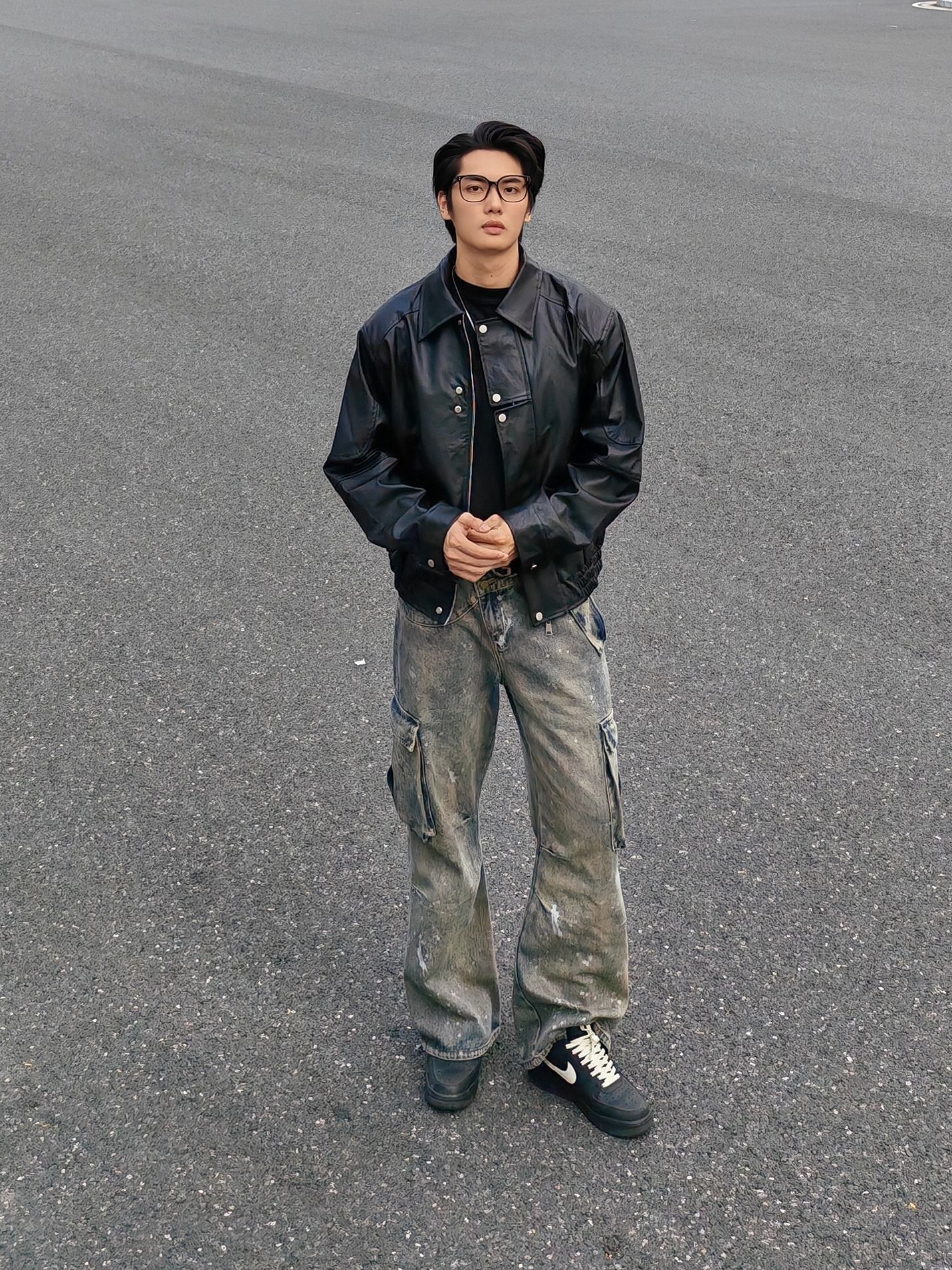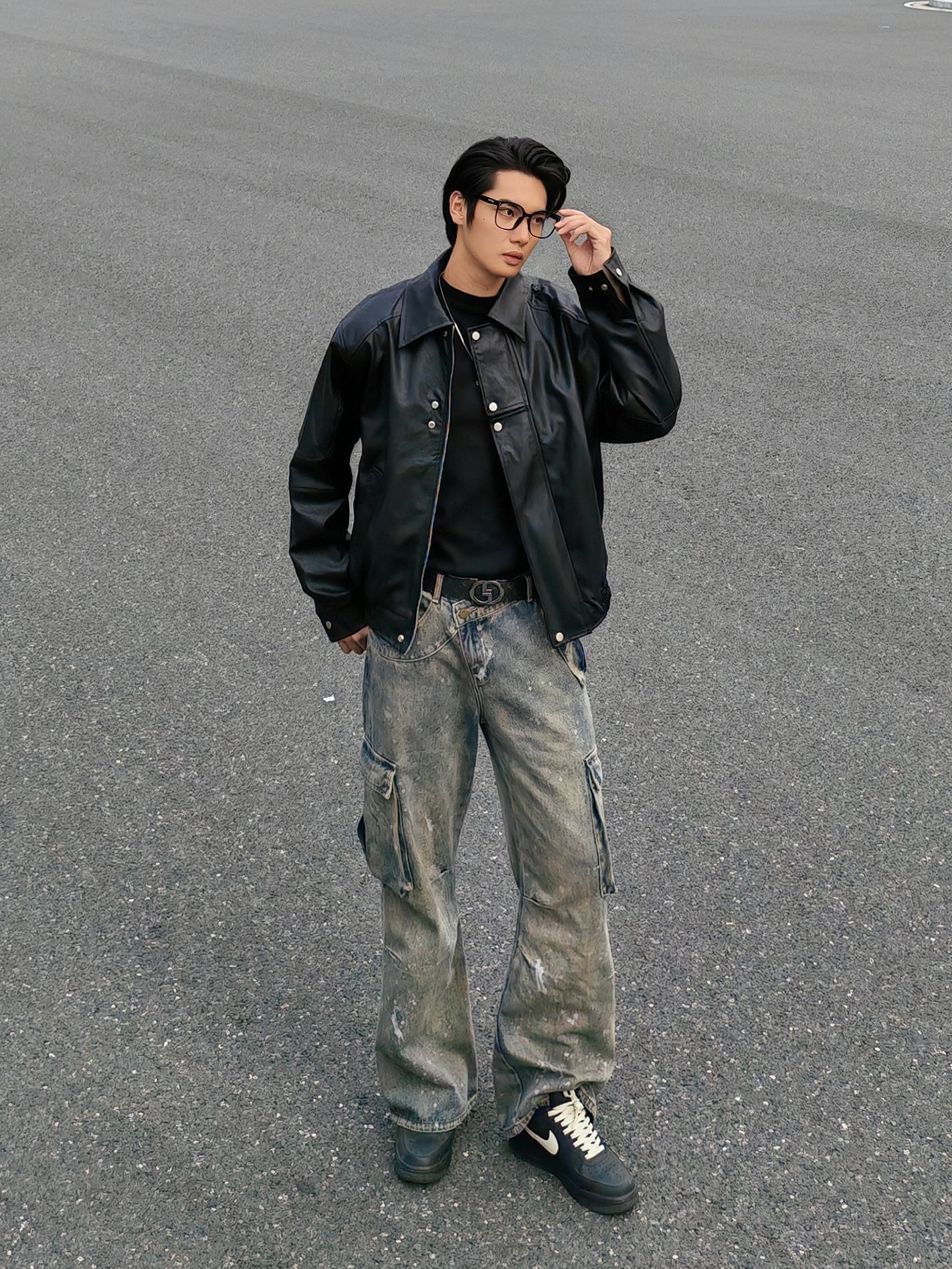 今天是暗黑街头复古风 外套:黑色机车皮夹克,硬朗有质感,美式翻领阔版设计,立挺有型。 内搭:黑色高领打底衫,简约百搭 下装:做旧泼墨工装牛仔裤,自带复古滤镜 鞋子:定制nike板鞋,经典又舒适。