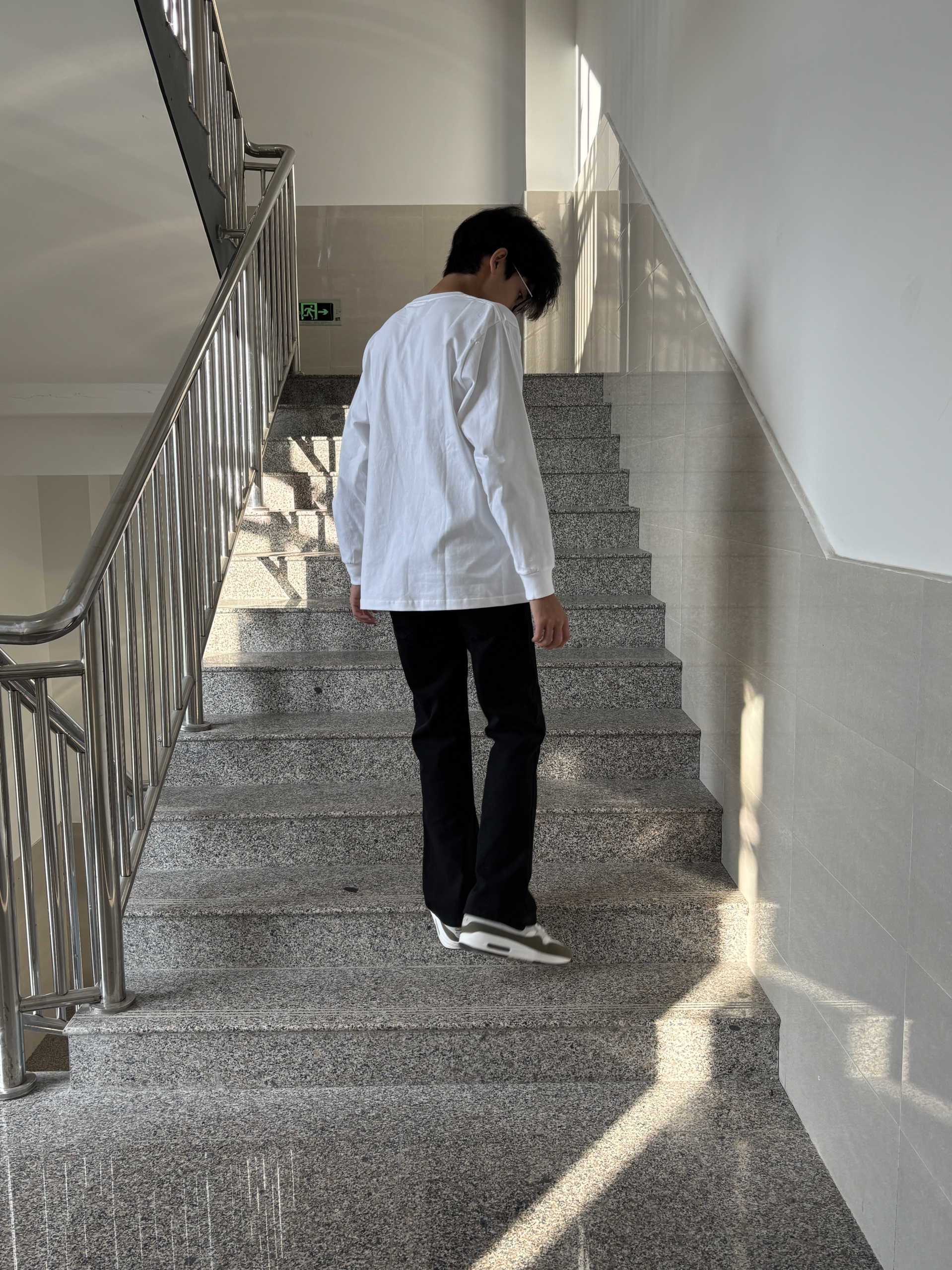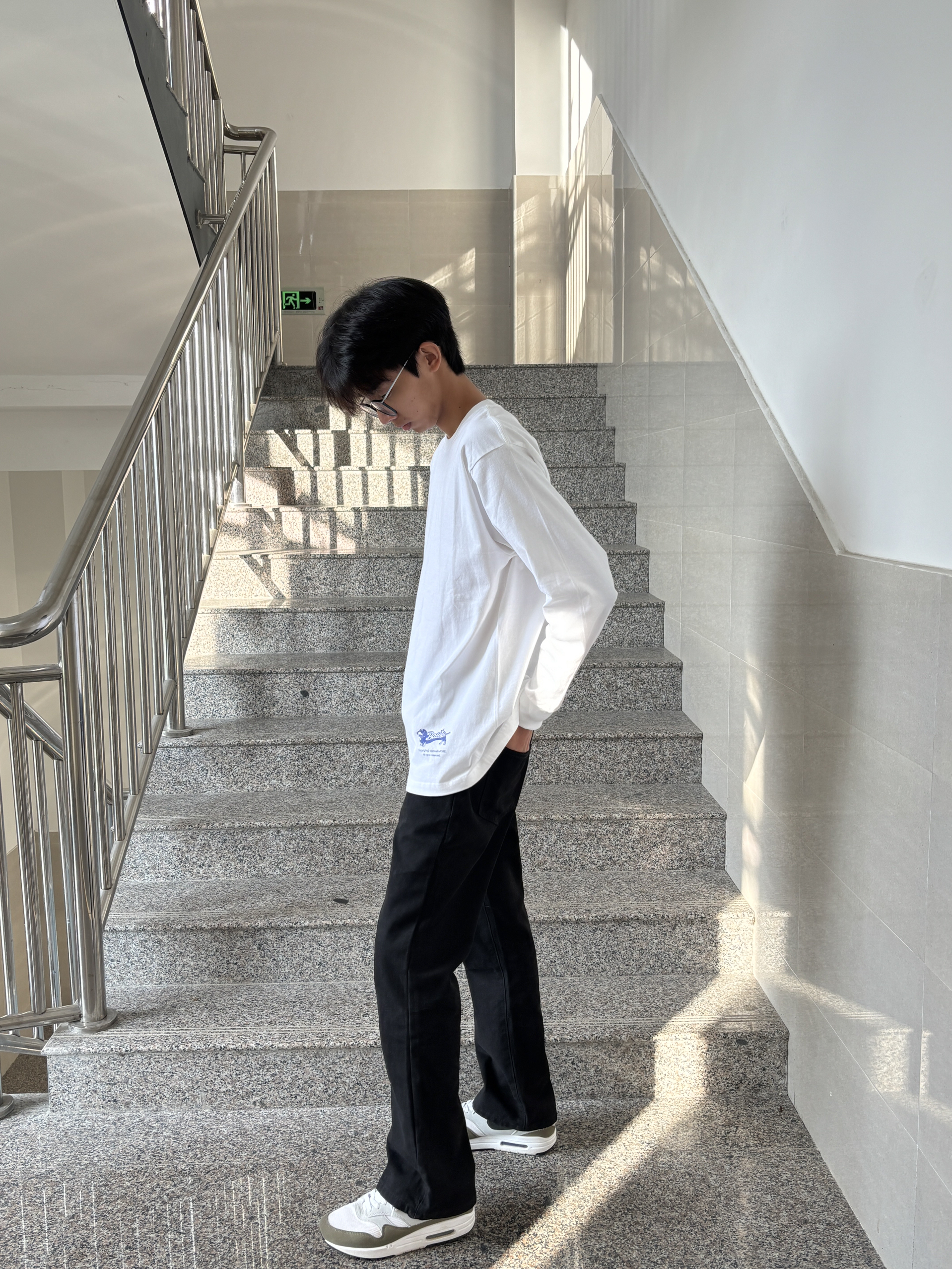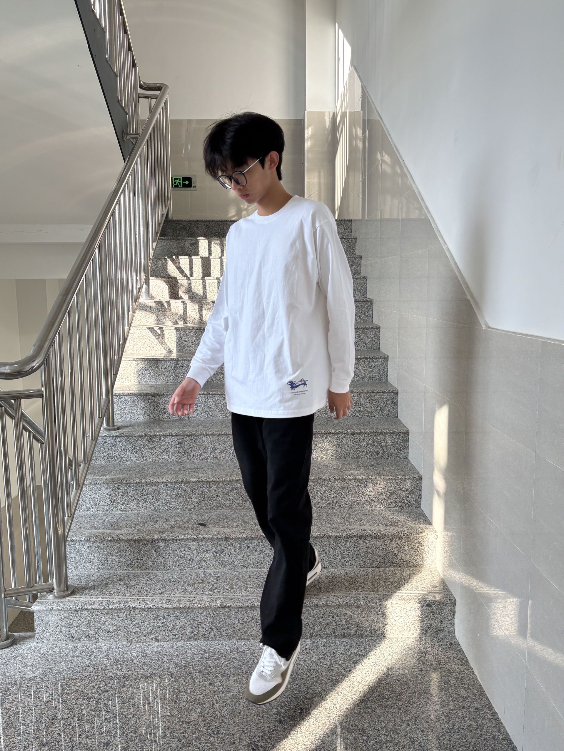 上衣是基础款白色长袖T恤,简约百搭,这种单品不容易出错,还能轻松营造出清爽的感觉