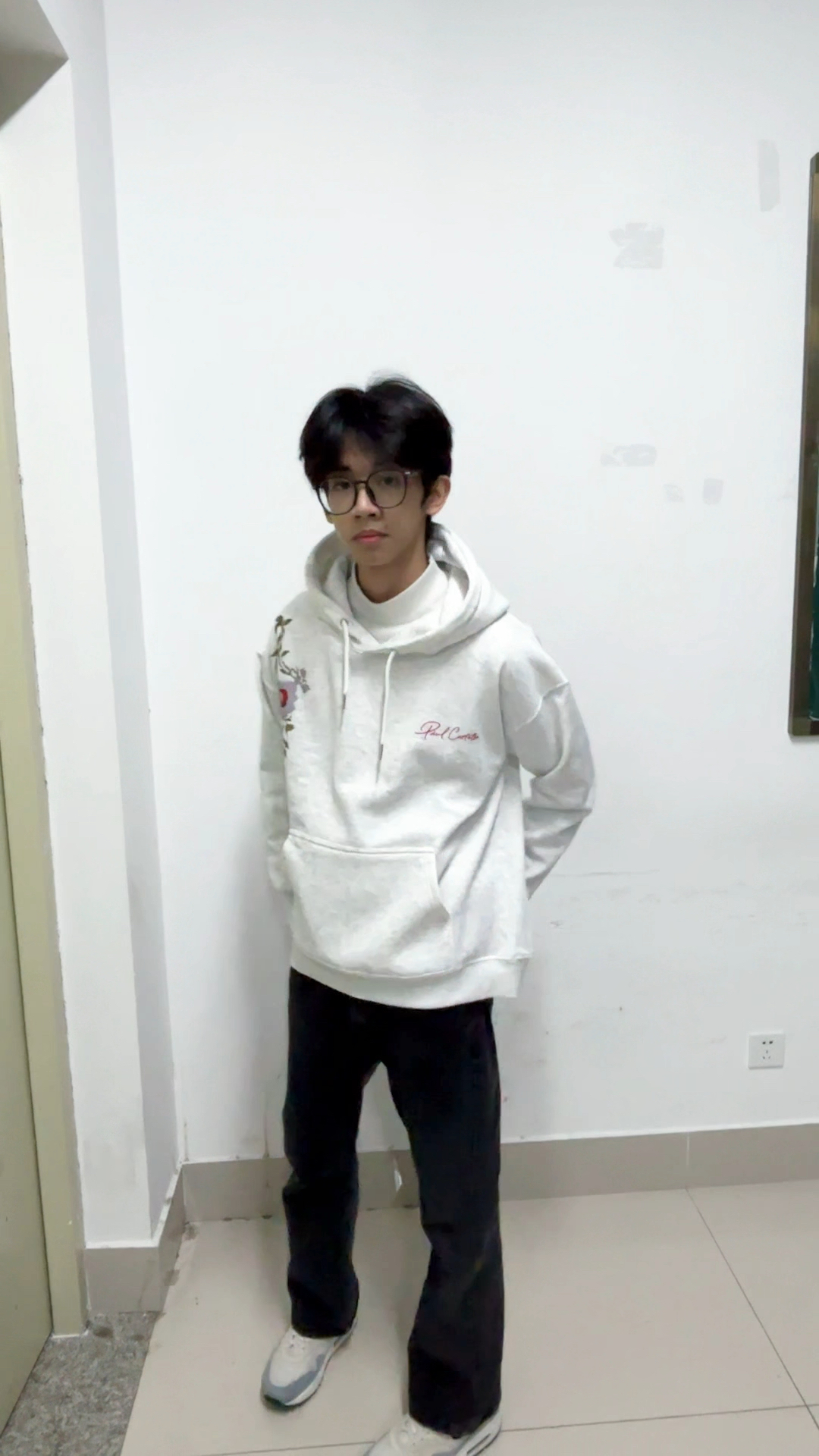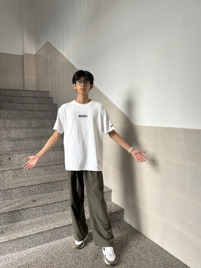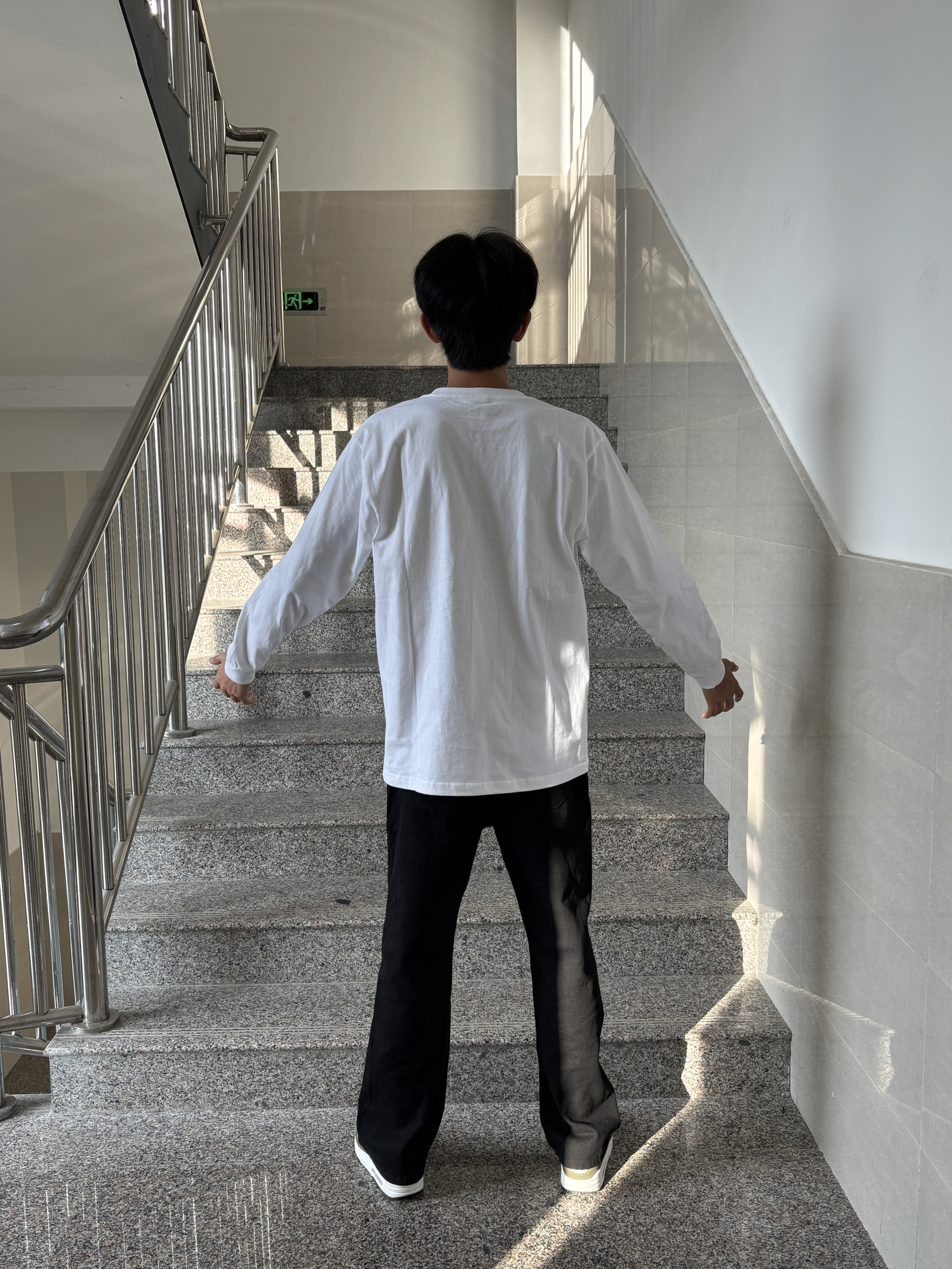 上衣是基础款白色长袖T恤,简约百搭,这种单品不容易出错,还能轻松营造出清爽的感觉