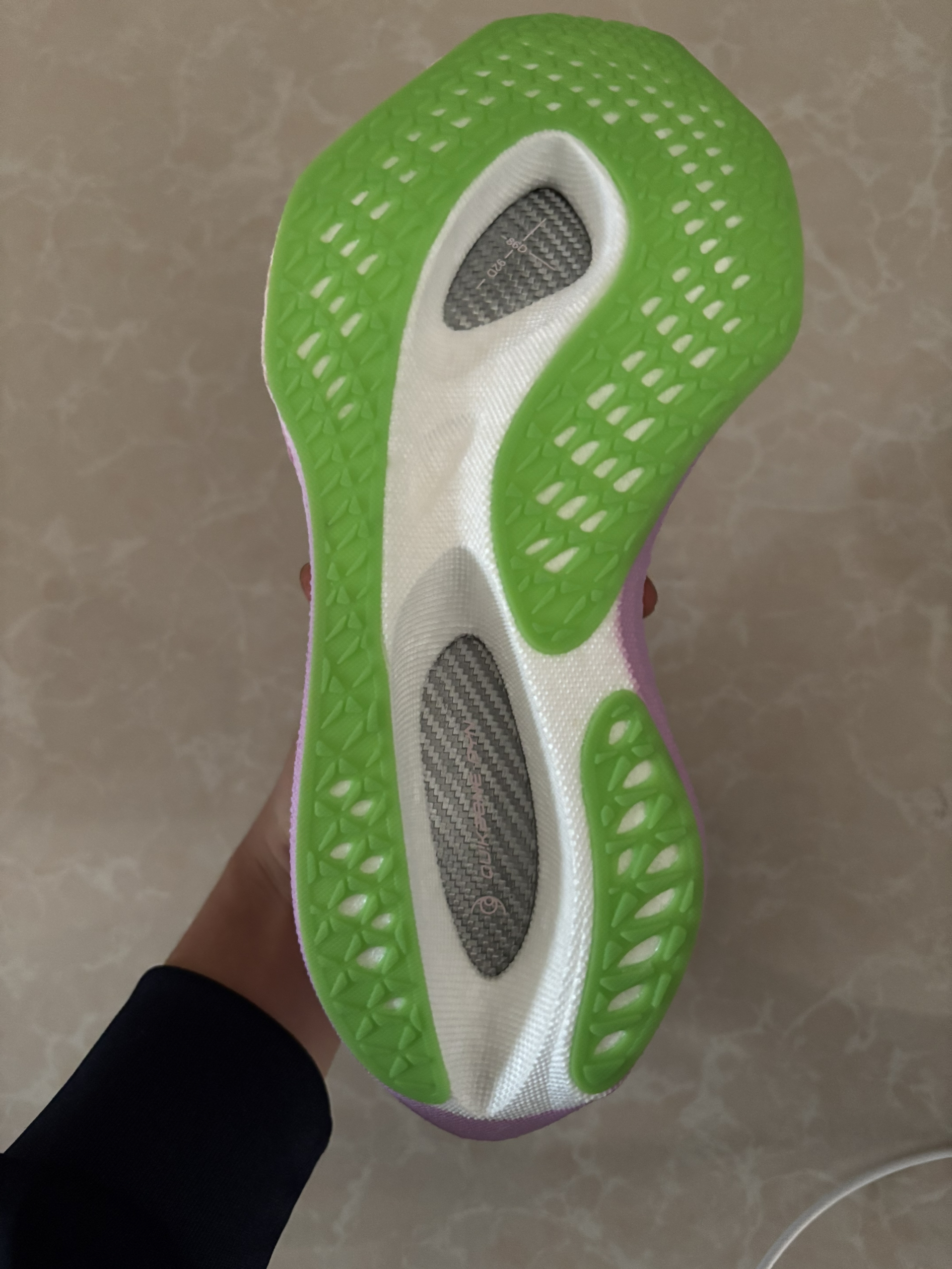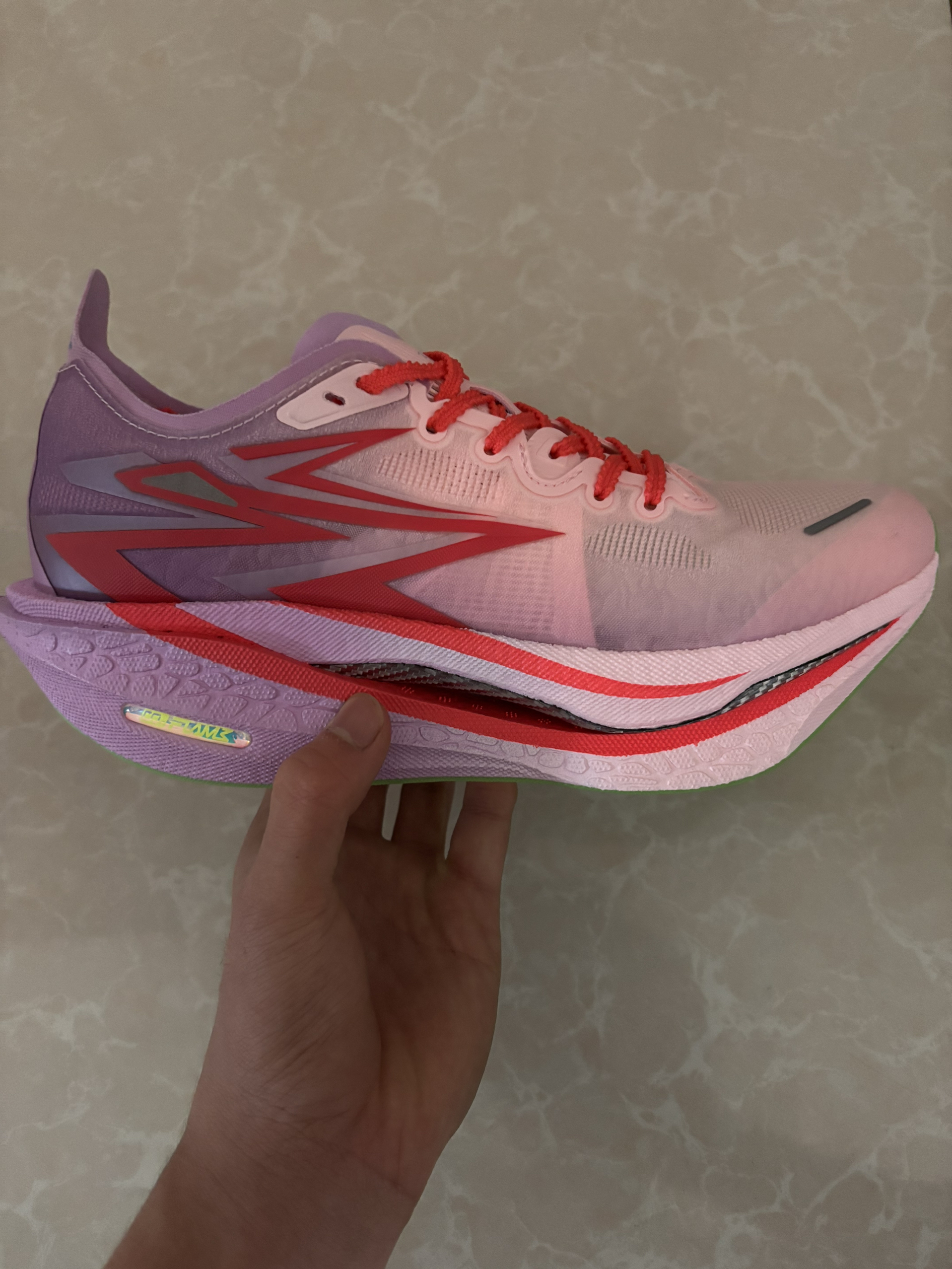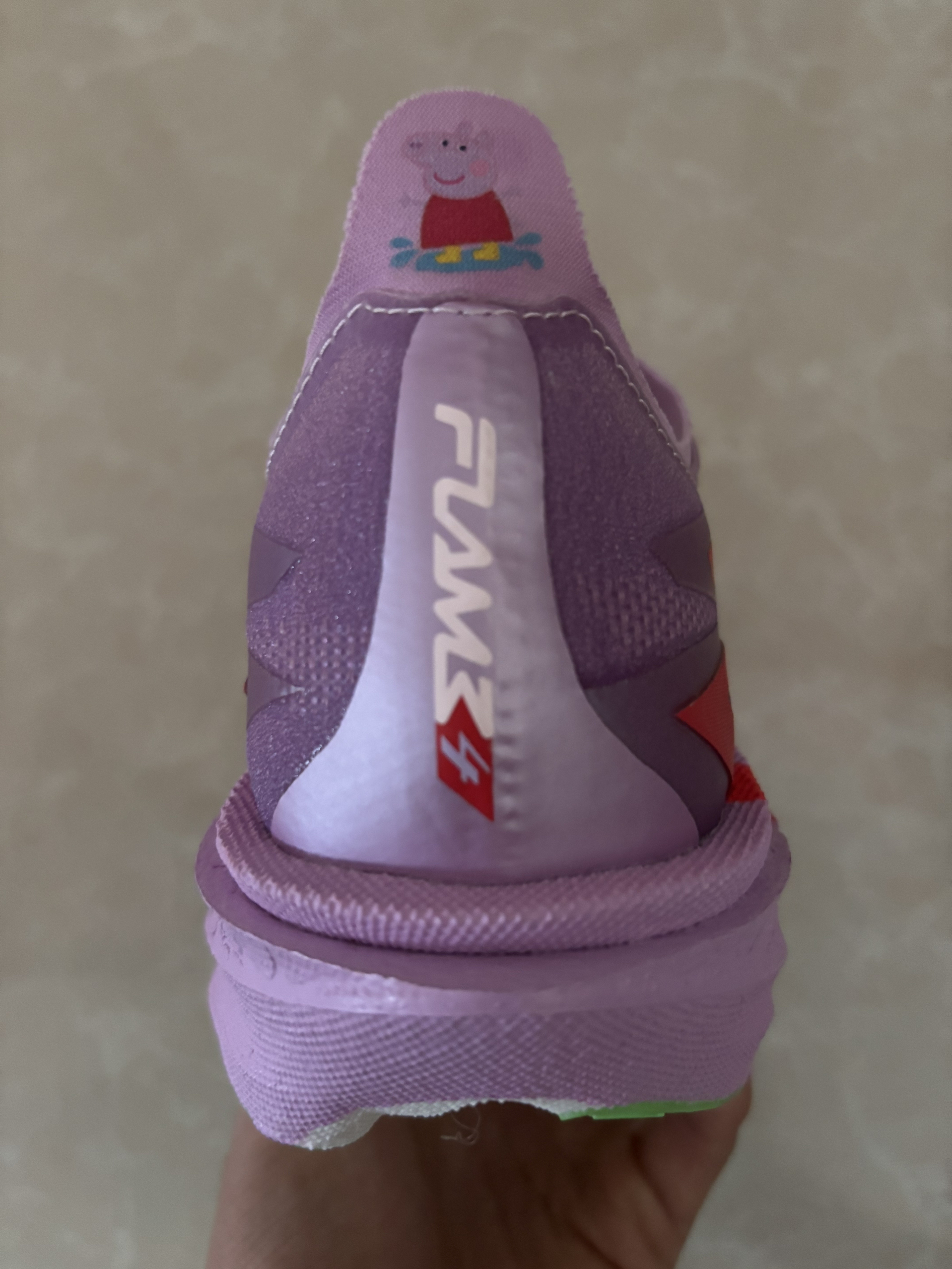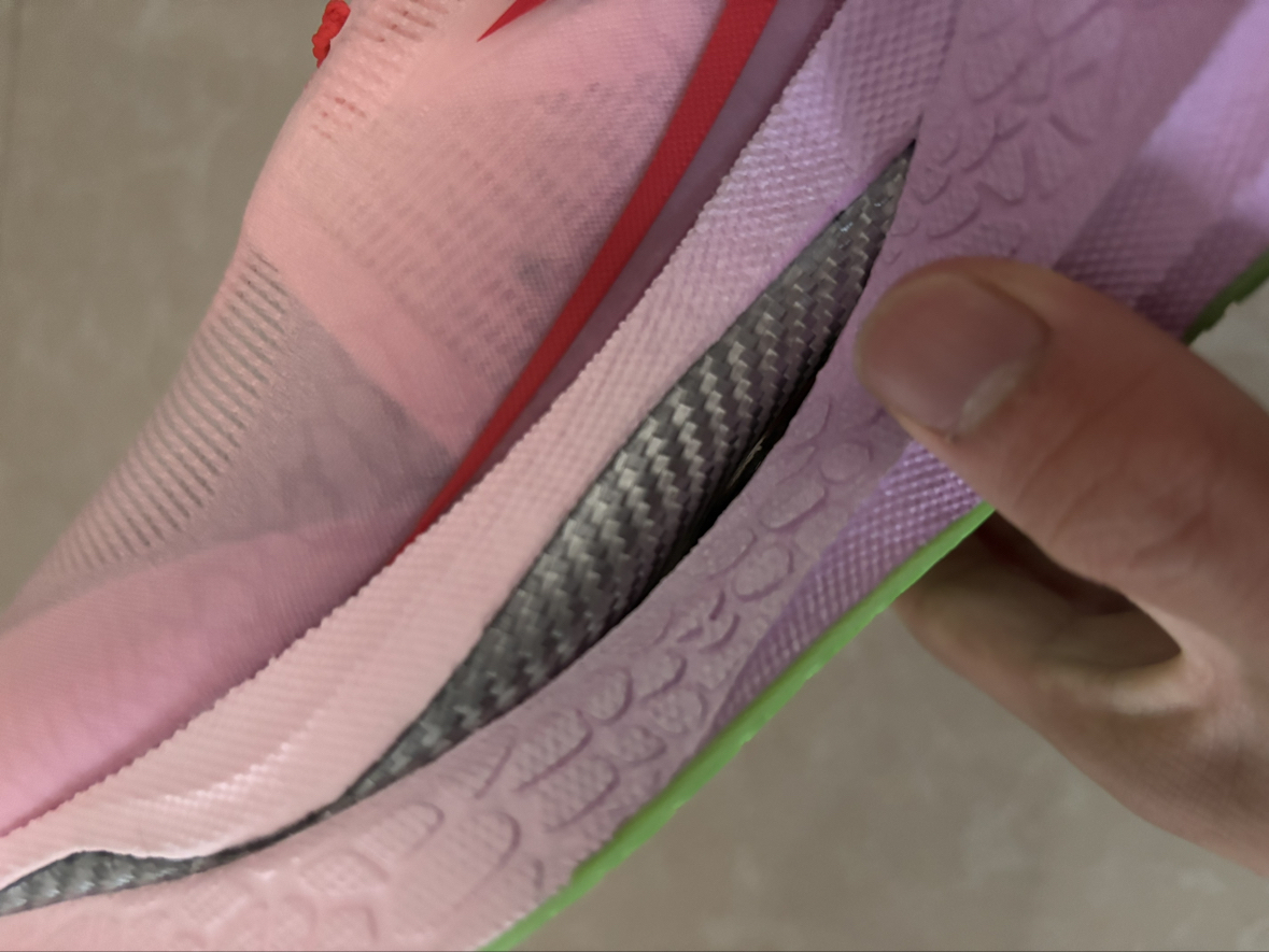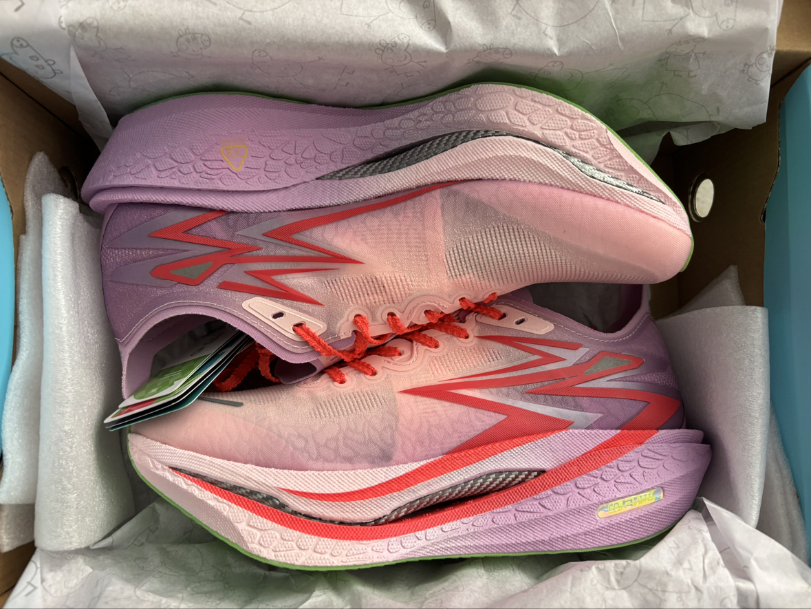 颜值不错,小猪佩奇的配色很好看,我这双品控也可以,银色碳板很帅,后跟和鞋垫都有小彩蛋,脚感软弹,鞋面透气,大底防滑耐磨,碳板推进力较强,稳定性也不错,但脚踝力量不足的慎选。双11价格很划算,可以入😘