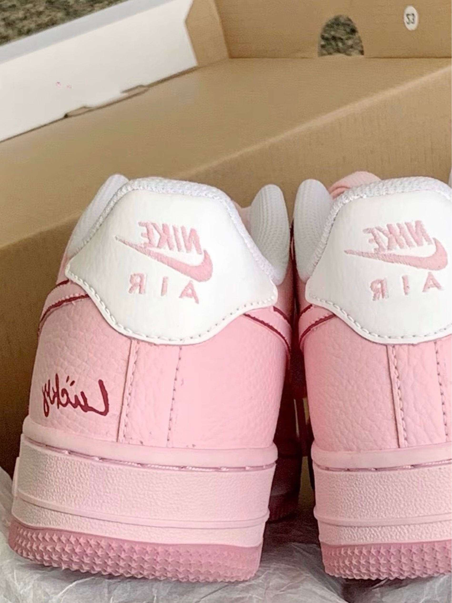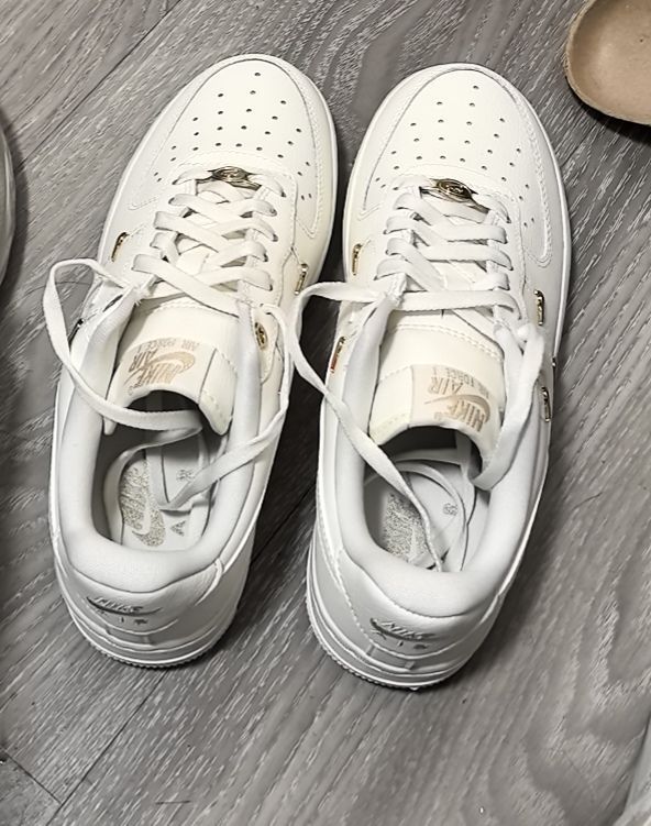 这双空军一号真的长在我的审美点上!珍珠白鞋面温柔又显质感,搭配香槟金的立体四钩装饰,精致感直接拉满,灯光下光泽超好看,完全不是廉价感。鞋面是软乎乎的材质,上脚贴合不压脚背,鞋身的透气孔设计很贴心,夏天穿也不会闷脚臭脚。
