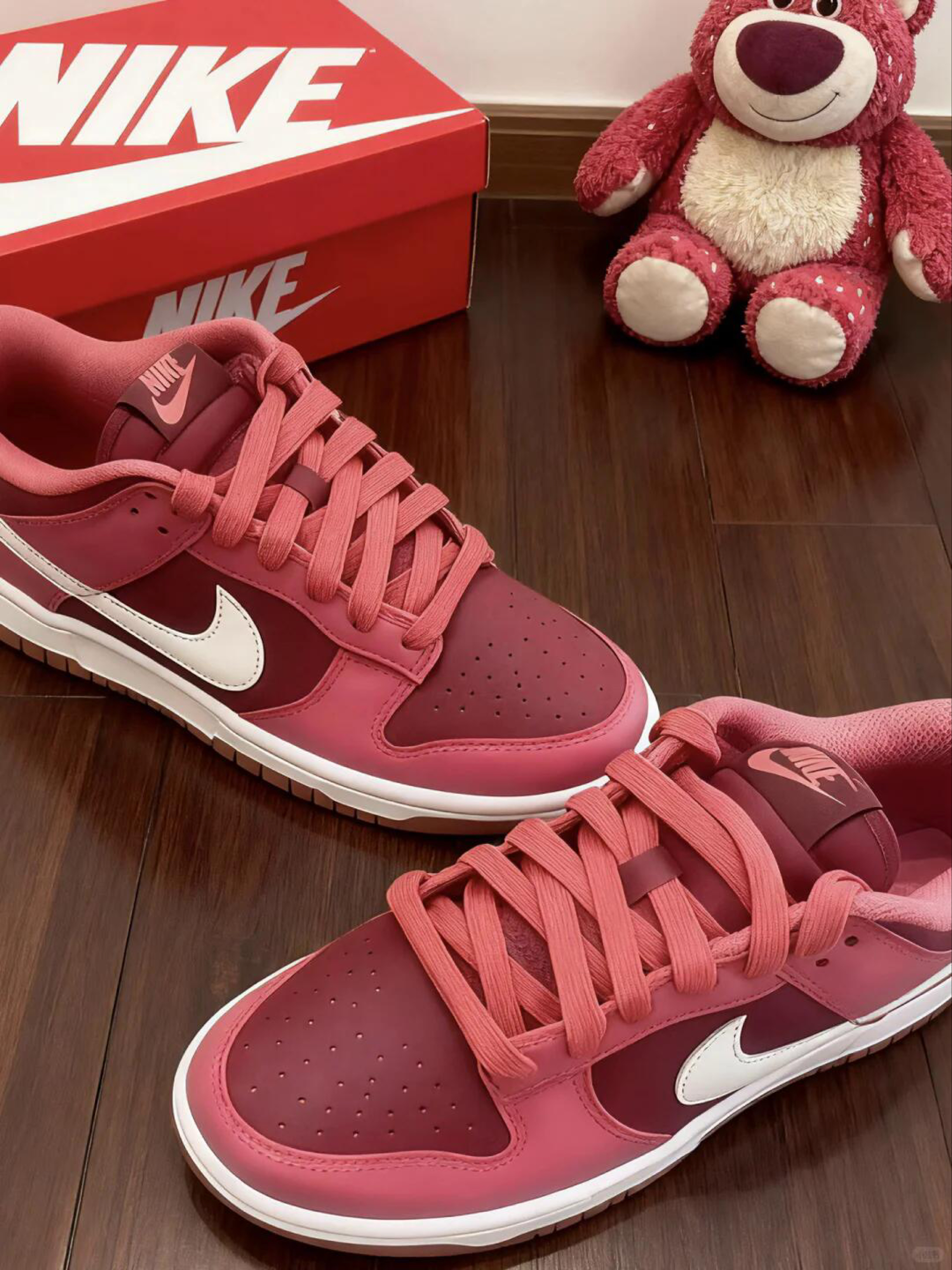 谁能拒绝一双像浸了草莓酱的鞋啊——渐变粉从浅甜过渡到深玫,白标像给甜意加了层利落的框,随便往木桌上一放,柔中带锐的质感都能戳中审美。 鞋面是软而细腻的材质,鞋头的气孔兜得住风,走半天甜品店脚面也不会闷;粗粉鞋带随便打个结都透着慵懒,鞋底的白边刚好中和粉调的甜,踩在木质地板上轻软又稳当。 这双鞋的「适配穿搭公式」: 1. 甜妹松弛风:配白色百褶裙+淡粉短款卫衣,露一截脚踝,裙装的软和鞋的粉呼应...