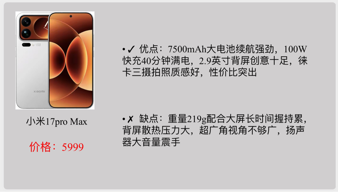 iPhone17 Pro Max主打iOS生态流畅性、A系列芯片性能与影像调校,适合依赖苹果生态、注重长期使用体验的用户,续航稳定但价格偏高。 小米17 Pro Max以骁龙旗舰芯、超大电池+快充、高规格屏幕为亮点,拍照硬件堆料足,性价比突出,适配安卓多场景需求,适合追求极致配置与高性价比的用户。两者核心差异在系统生态、定价与配置侧重,按需选择即可。