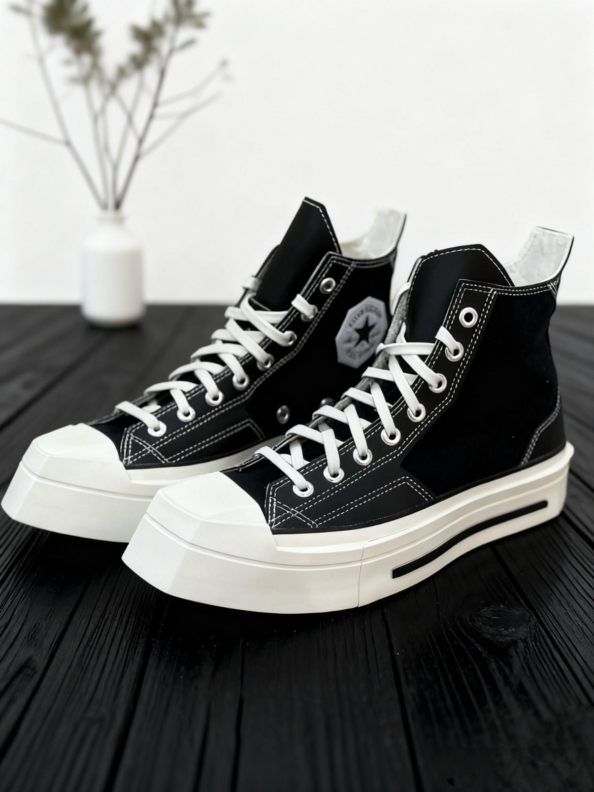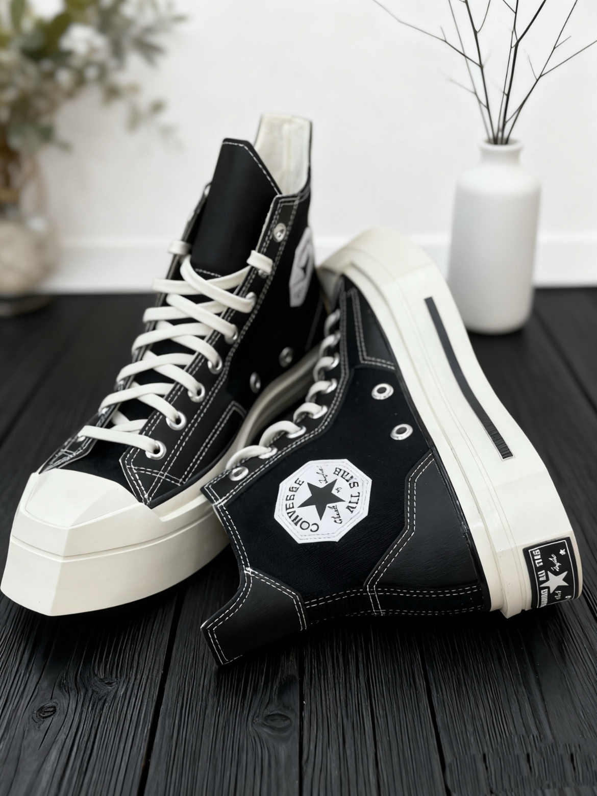 -斜方头八角螺丝🛠️鞋带孔朋克感十足! -logo标都是几何八边形🛑 -皮革➕帆布材质的拼接🤩 -高街朋克风必须拿捏😎 -为厚底彻底疯狂🏆