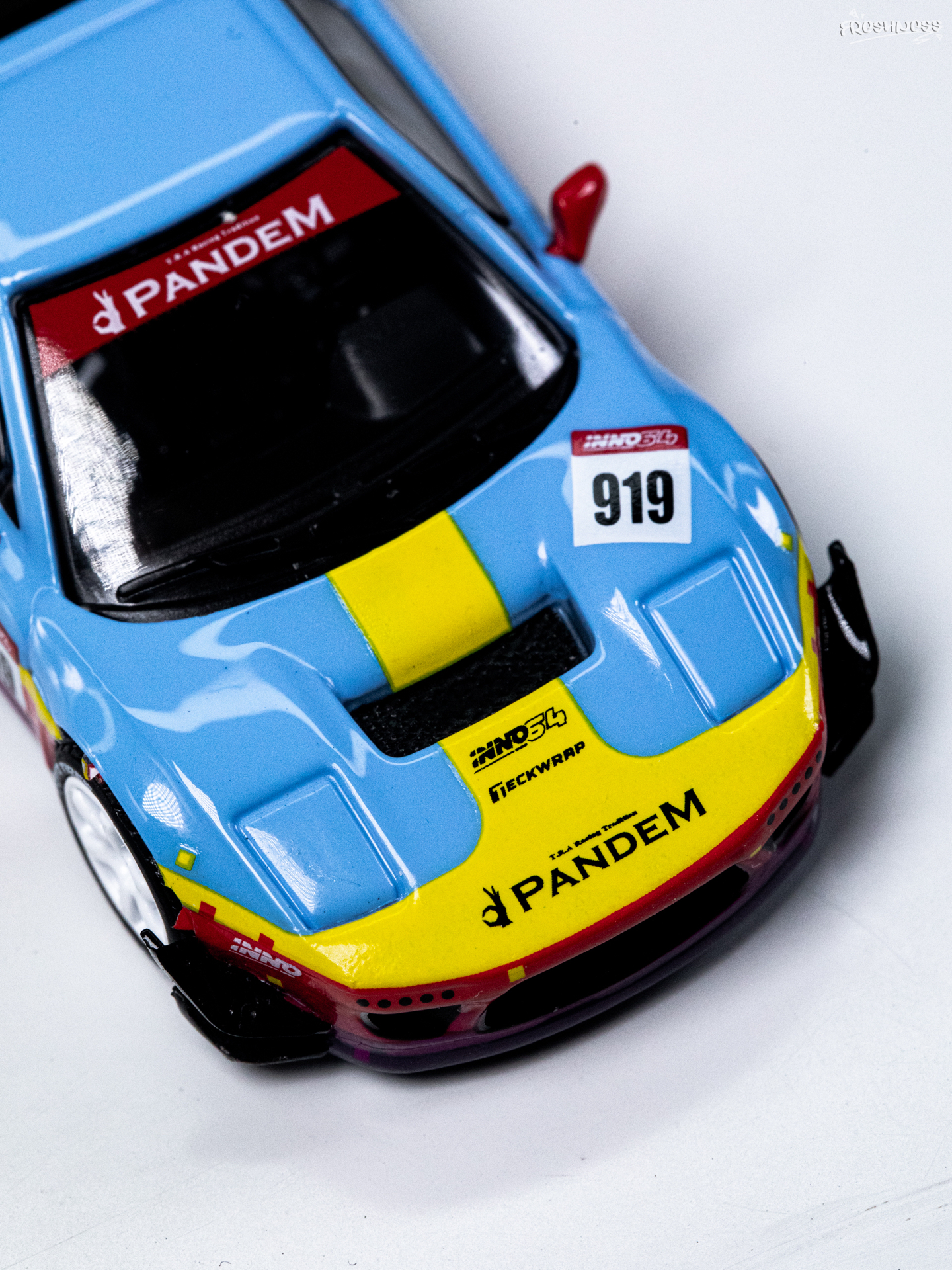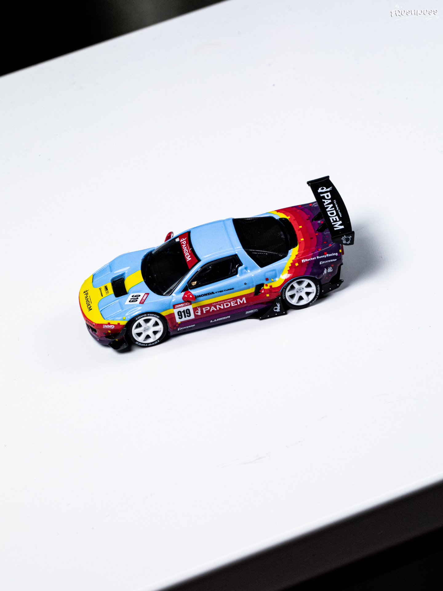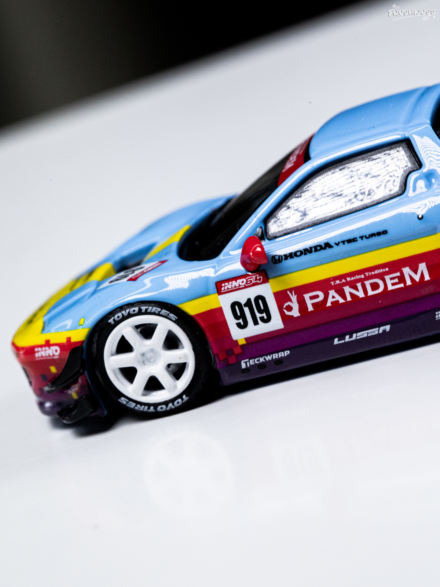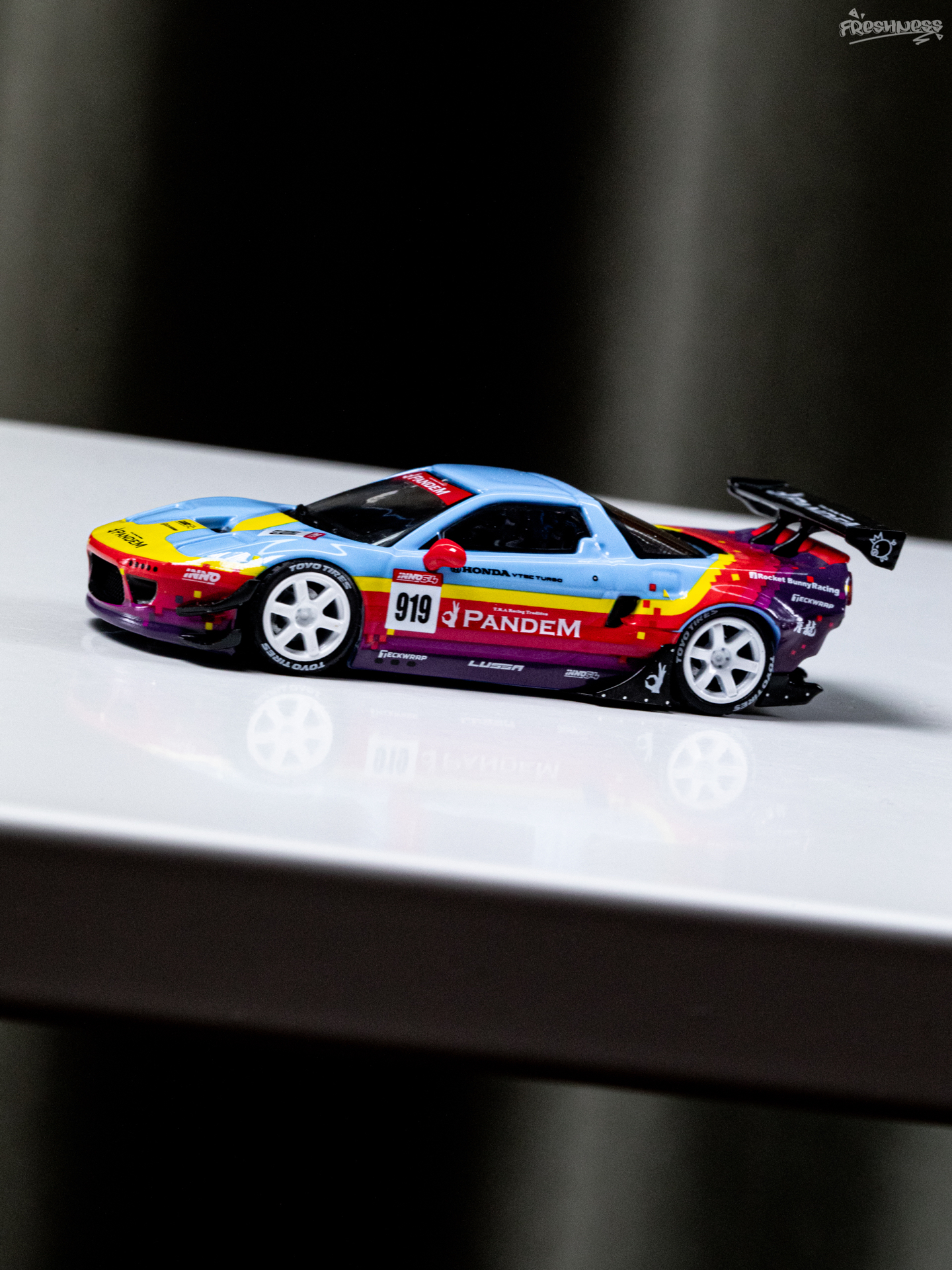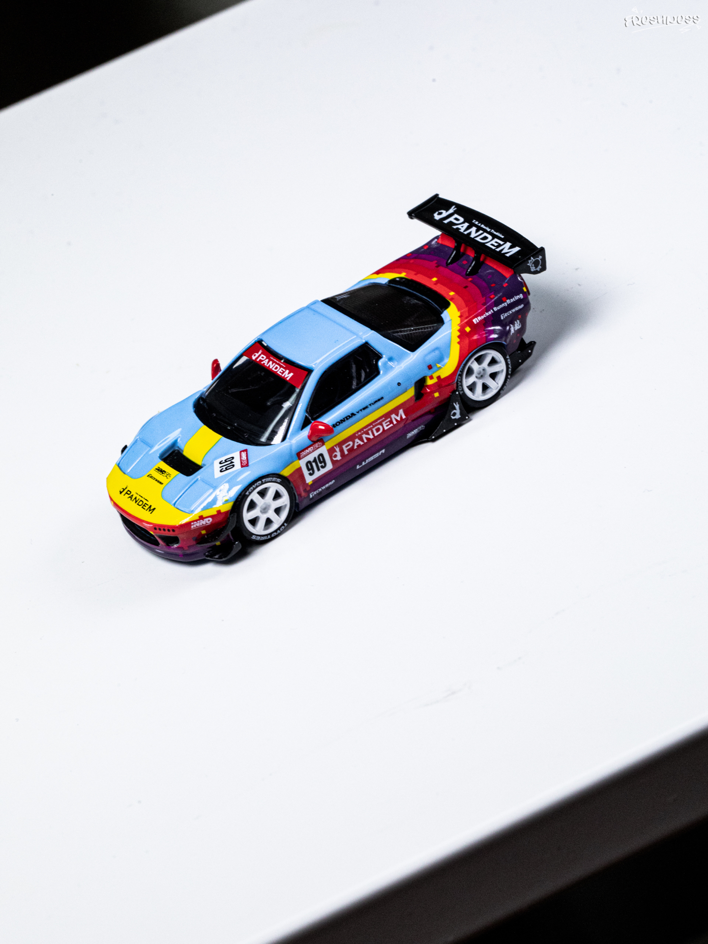今天拍摄练习的小车是来自于INNO在2025年佛山改装展上限定发布的本田NSX,车子也是出自于改装厂牌PANDEM。小车整体的姿态我挺喜欢,车身的宽体与尾翼看着很舒服。涂装类似于彩虹的样式,车身的拉花细节也做得很不错。白色轮毂看着第一眼不太行,但后面也是稍微看对眼了,不行的话就开底换轮吧。值得一说的是INNO的品控真的想吐槽,目前入手了3个其中有2个都有掉件,这款的风刀也掉了,还能有什么办法自己修...