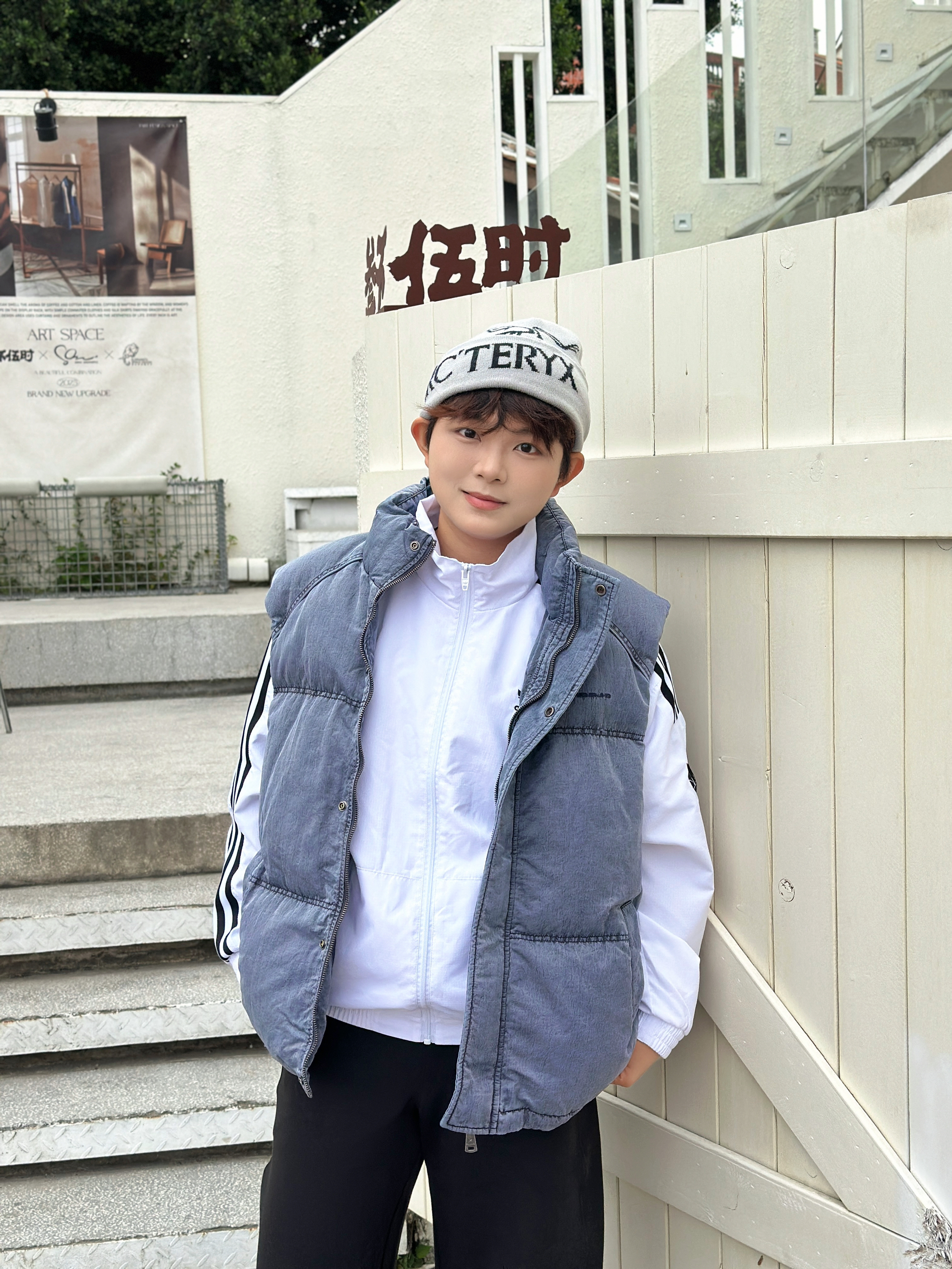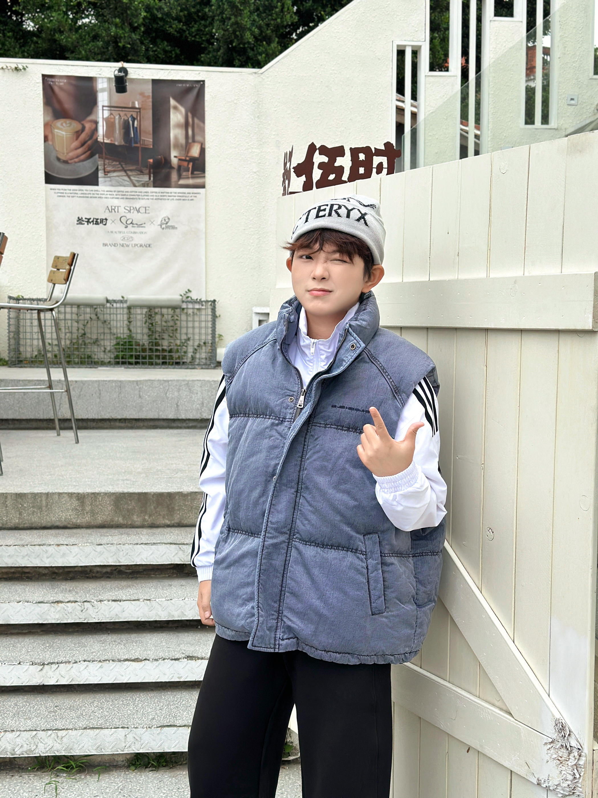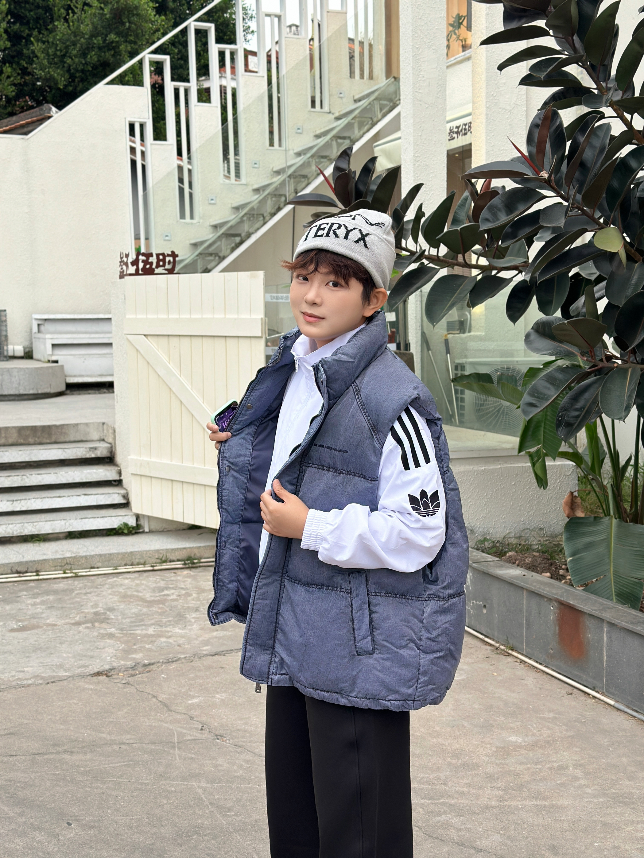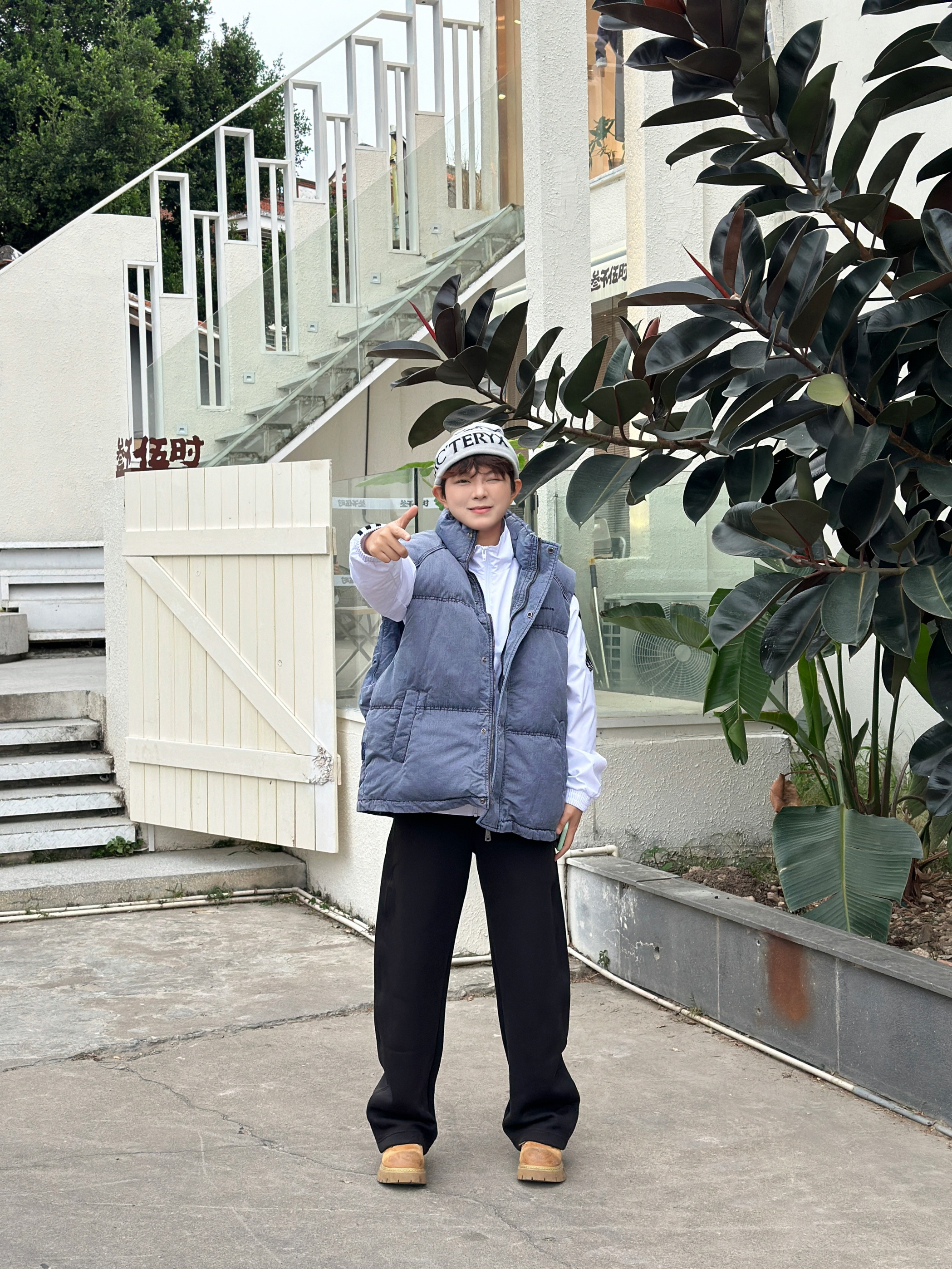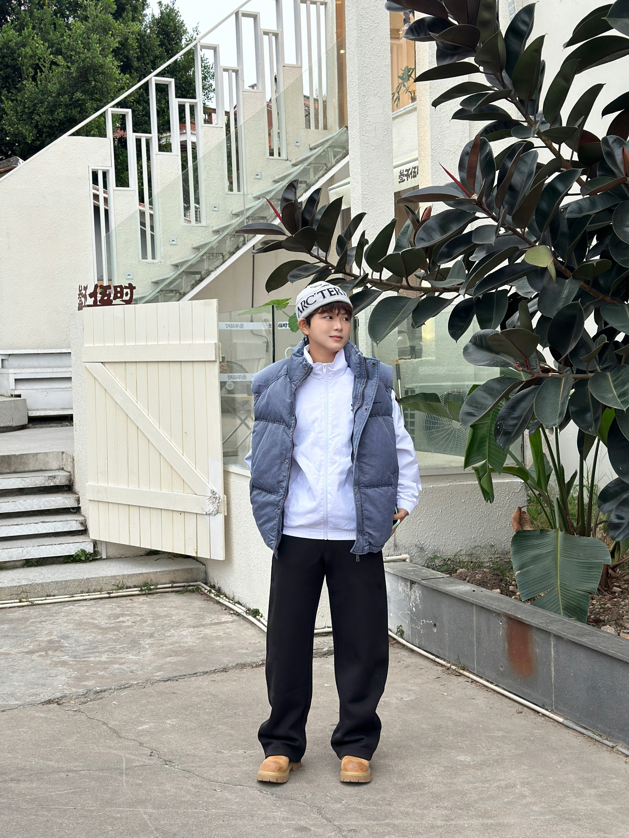 宝子们快看这套穿搭🎯 灰蓝色羽绒马甲叠穿白色条纹外套,层次感直接拉满✨ 搭配黑色阔腿裤和复古大黄靴,休闲又随性~ 再戴个潮酷针织帽,走在街上回头率绝了👍 日常出街这么穿,舒服又有范儿,谁懂啊!😎
