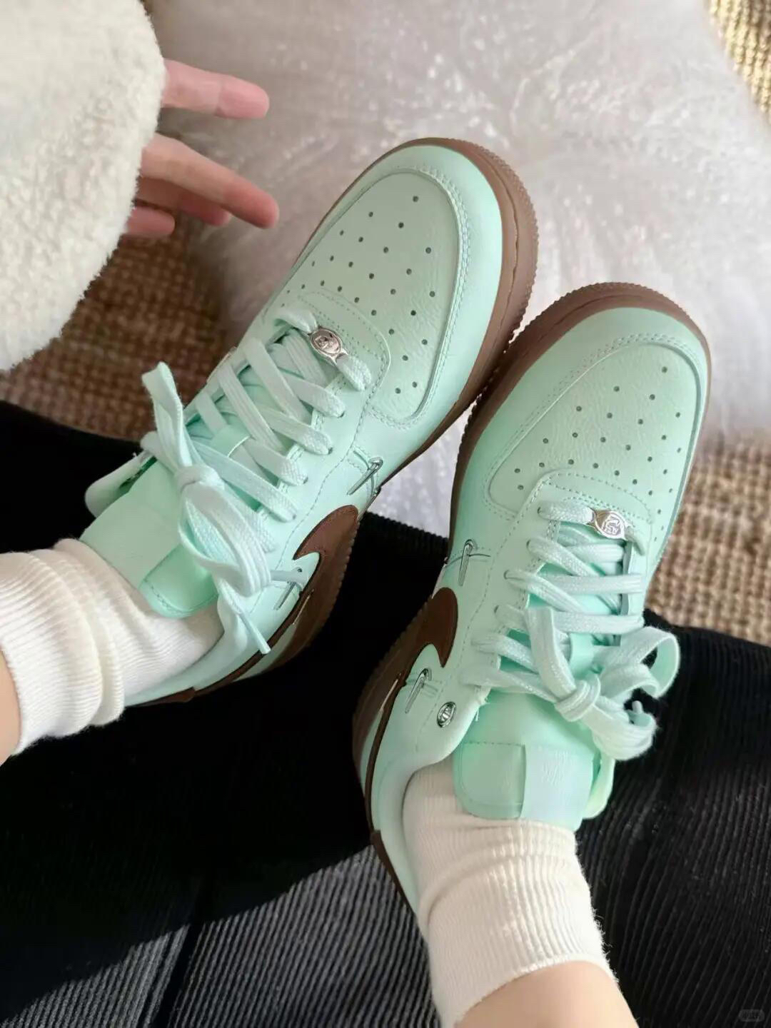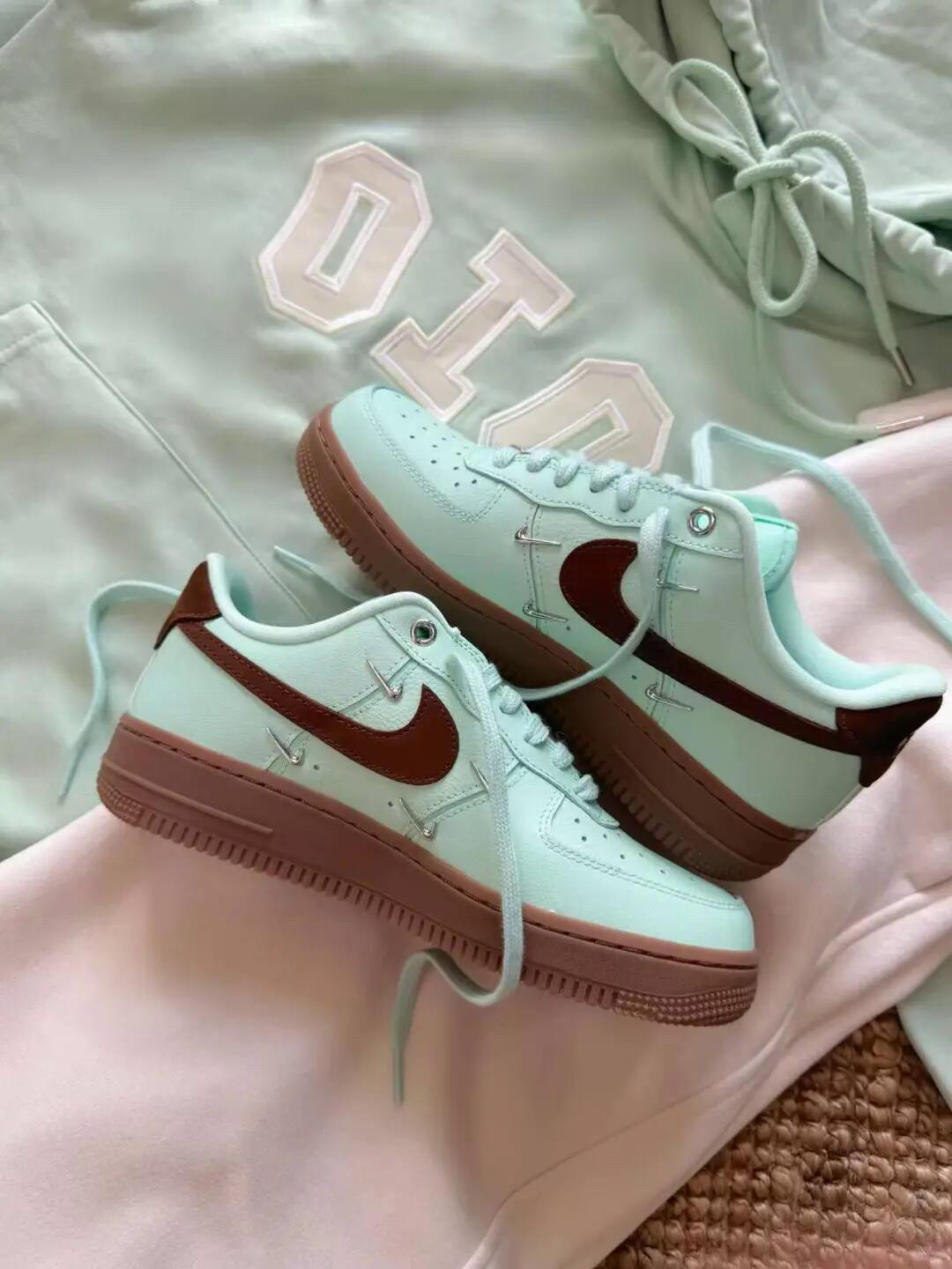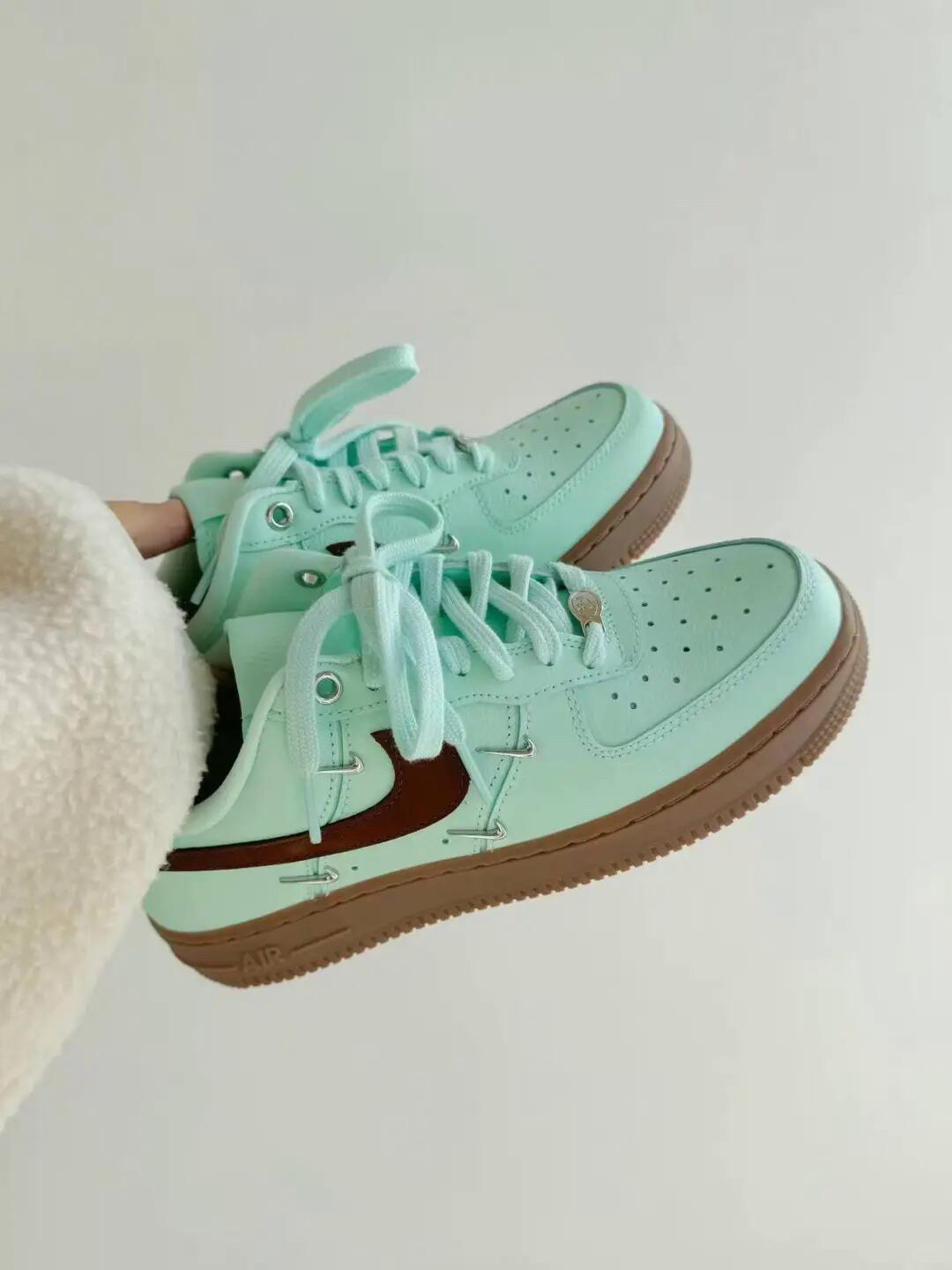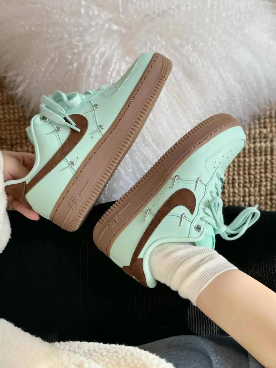 薄荷绿鞋面像刚剥开的青柠,暖棕Logo和生胶底裹着焦糖般的温柔,连鞋带孔的金属细节都藏着细腻,上脚既裹着春日的清透,又能让穿搭自带“甜暖氛围感”。 「它能接住你的需求」 • 薄荷绿+暖棕的撞色是“春日专属牌”,搭浅色系清新、搭深色系温柔;皮革鞋面好打理,软布轻擦就能维持质感;AF1厚底鞋型悄悄增高,还能衬得腿型更轻盈。 • 是“春日甜暖单品”也是“日常舒适搭子”,既能当穿搭的视觉亮点,又能踩...