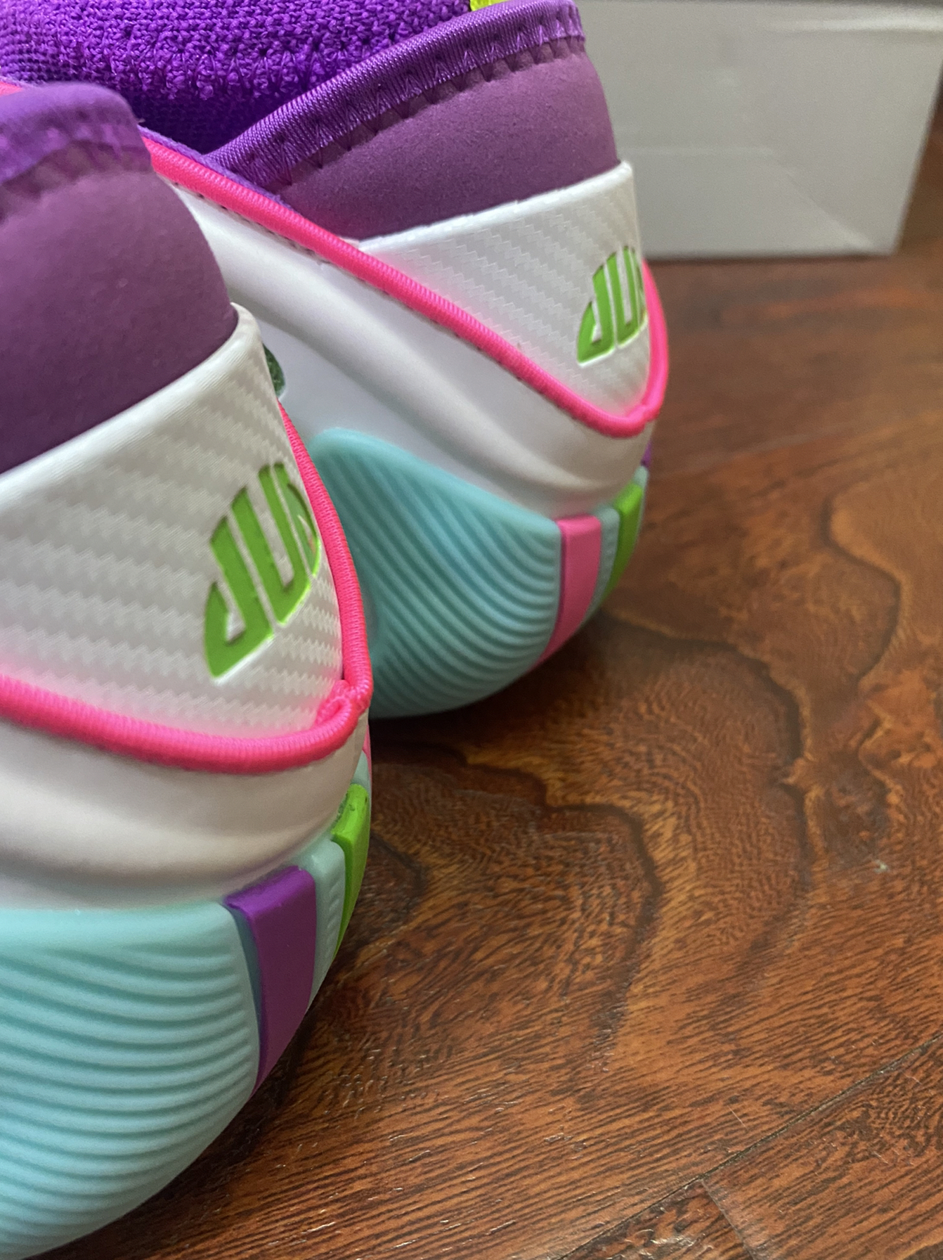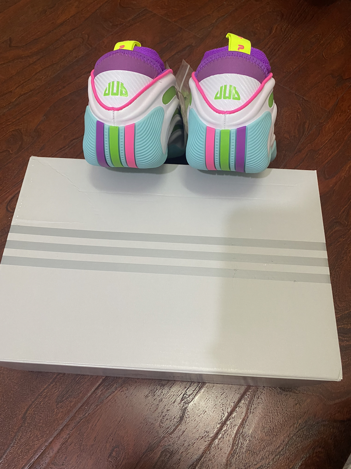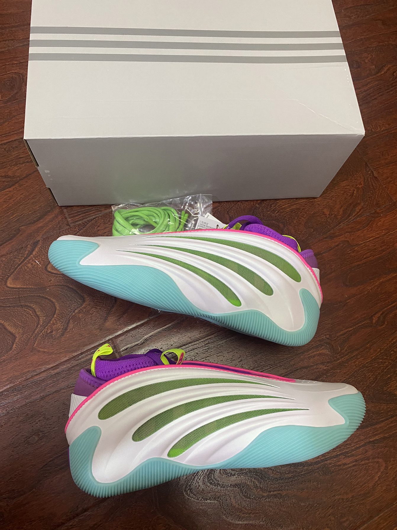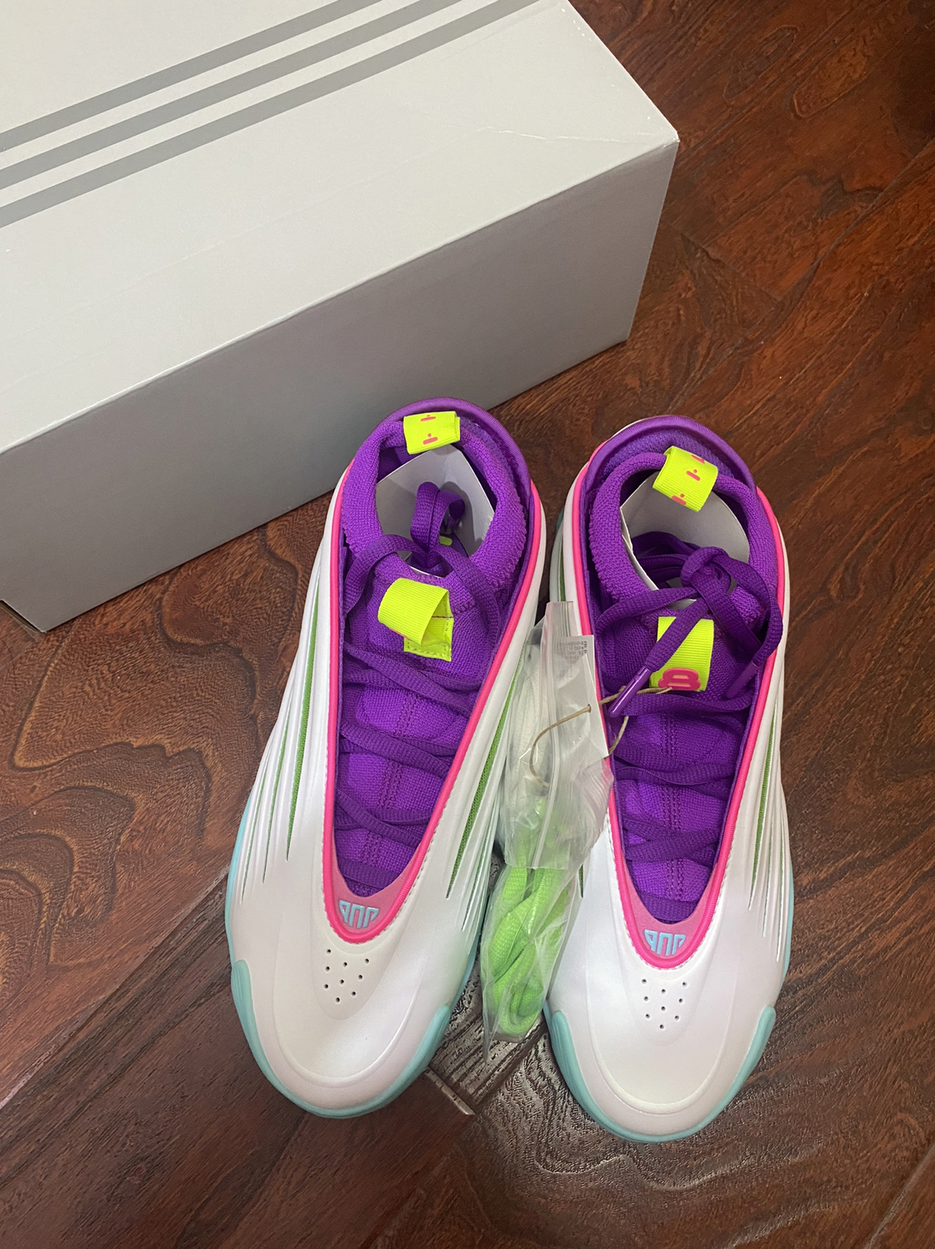 蓝白紫的配色真的不要太好看,总体阿迪设计还是在线的,新颖的三条杠还送了三幅鞋带,包裹性还不错,弹跳缓震一样也没少,在球场上打几场差不多就会适应了,喜欢的宝子可以冲