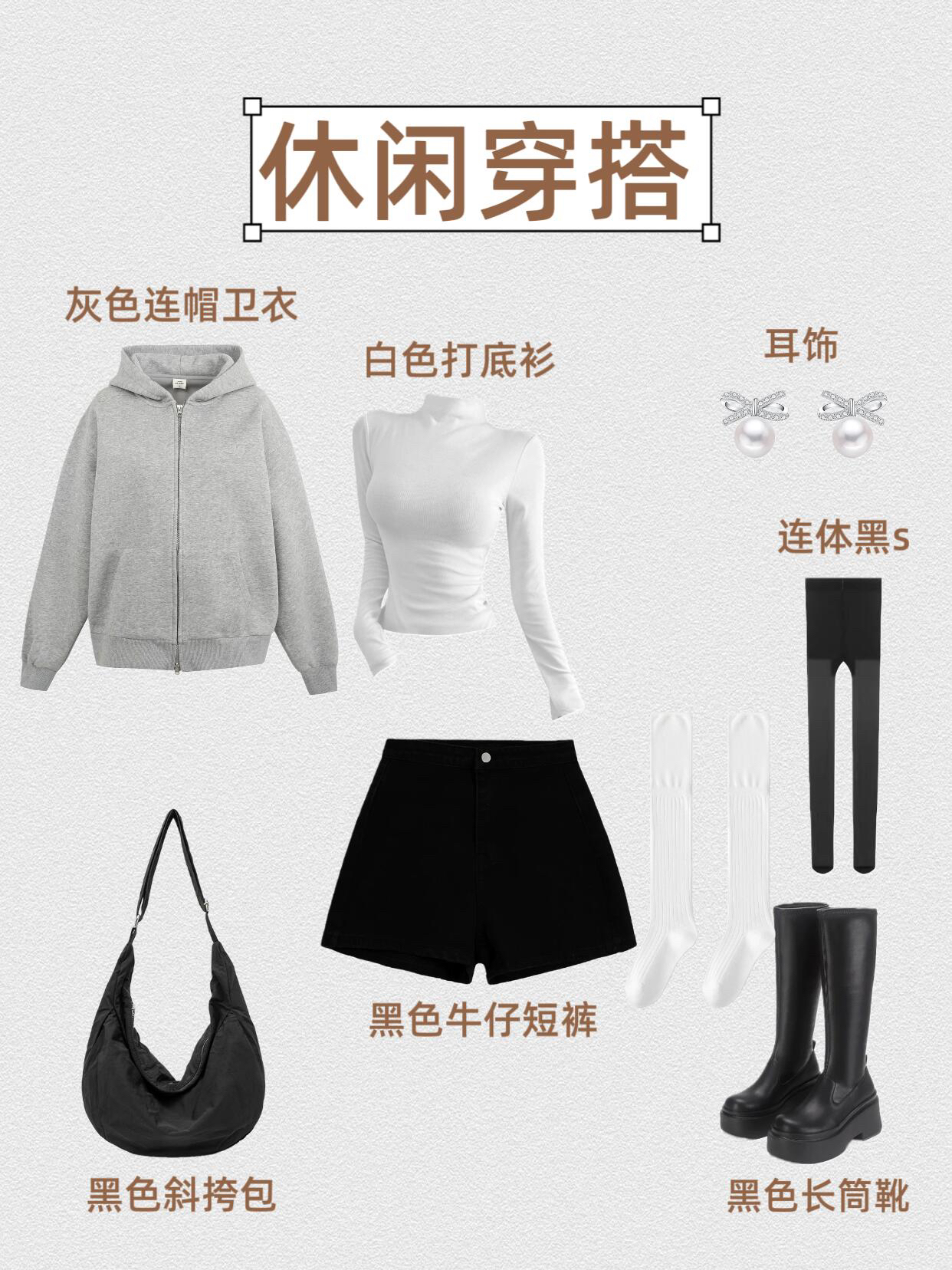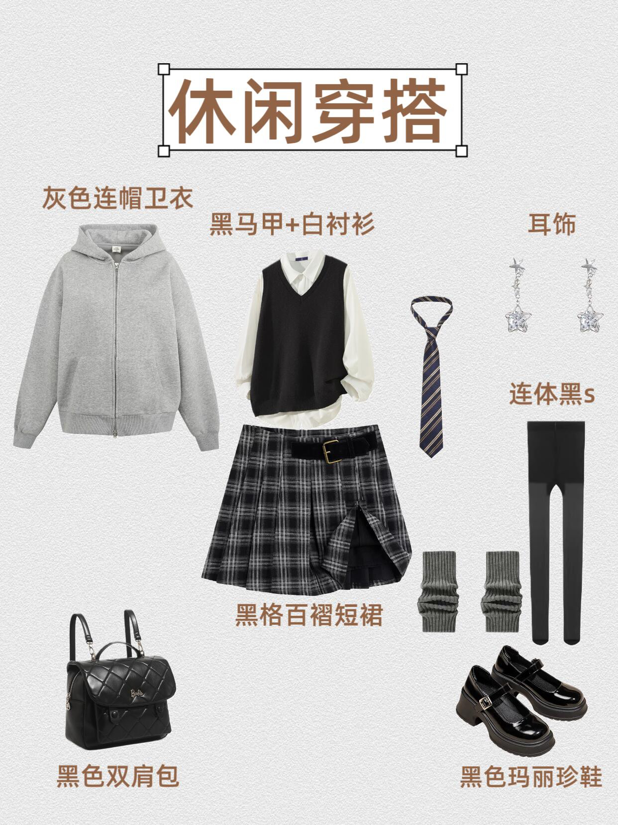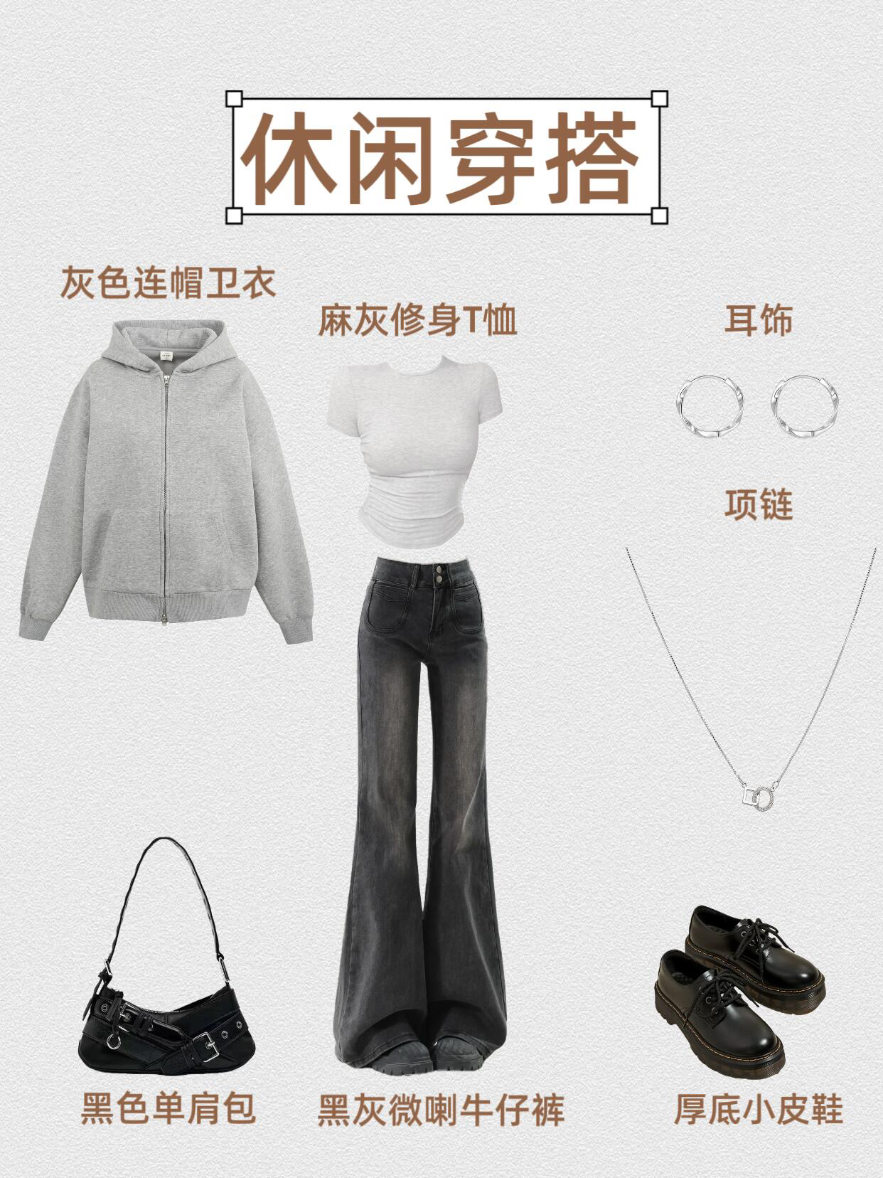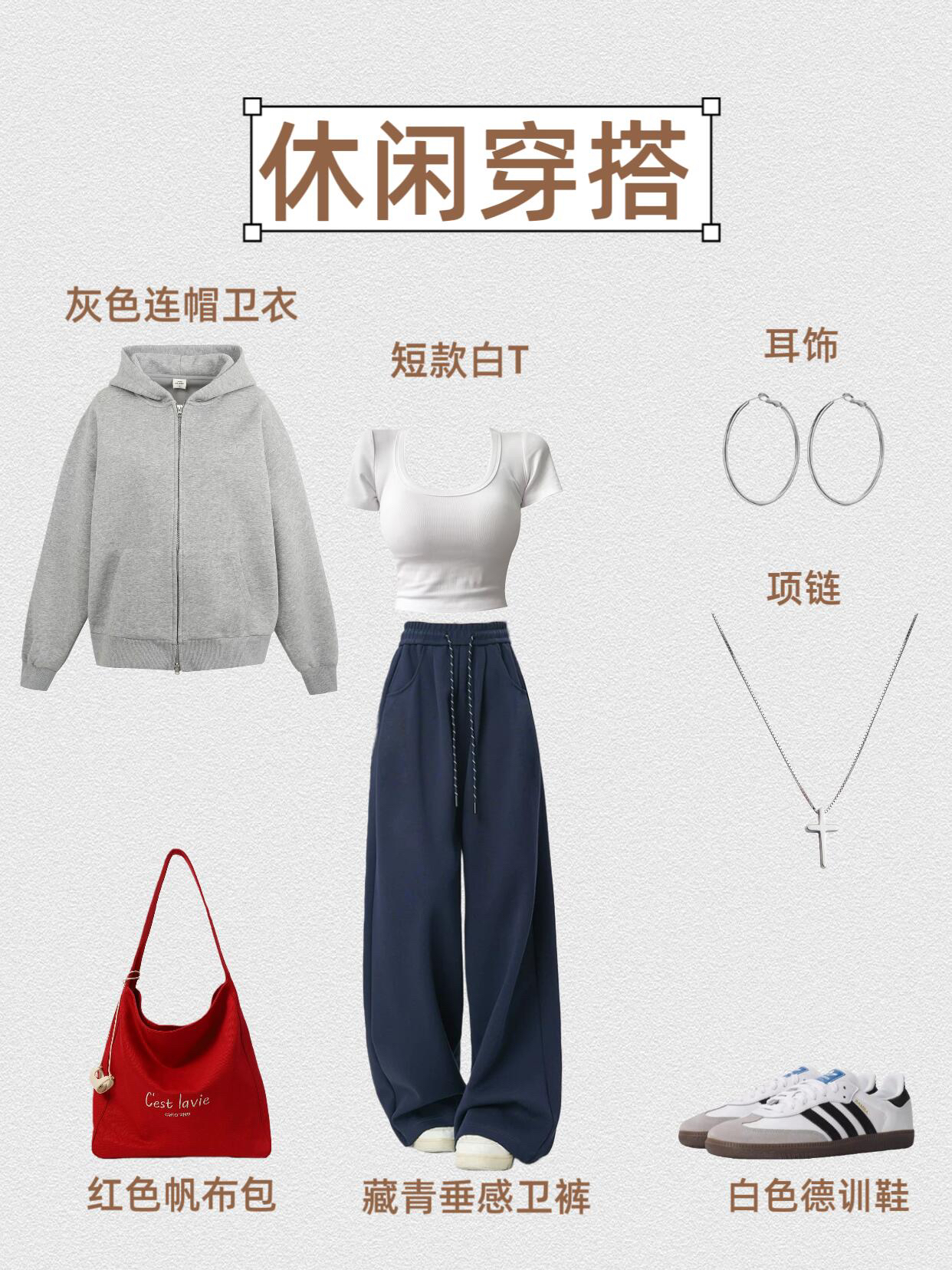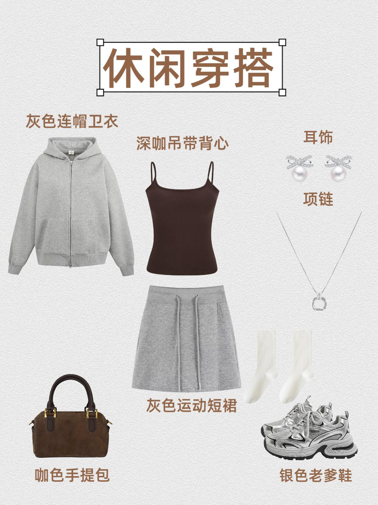 第1⃣套:美式复古风 灰色连帽卫衣+麻灰修身T恤+黑灰微喇牛仔裤+厚底小皮鞋+黑色单肩包+银色耳饰+环形项链 第2⃣套:运动休闲风 灰色连帽卫衣+短款白T+藏青垂感卫裤+白色德训鞋+红色帆布包+银色耳饰+十字项链 第3⃣套:甜酷街头风 灰色连帽卫衣+白色吊带背心+白色蛋糕短裙+银色老爹鞋+白色帆布包+钻石耳饰+星星项链 第4⃣套:复古运动风 灰色连帽卫衣+深咖吊带背心+灰色运动短裙...
