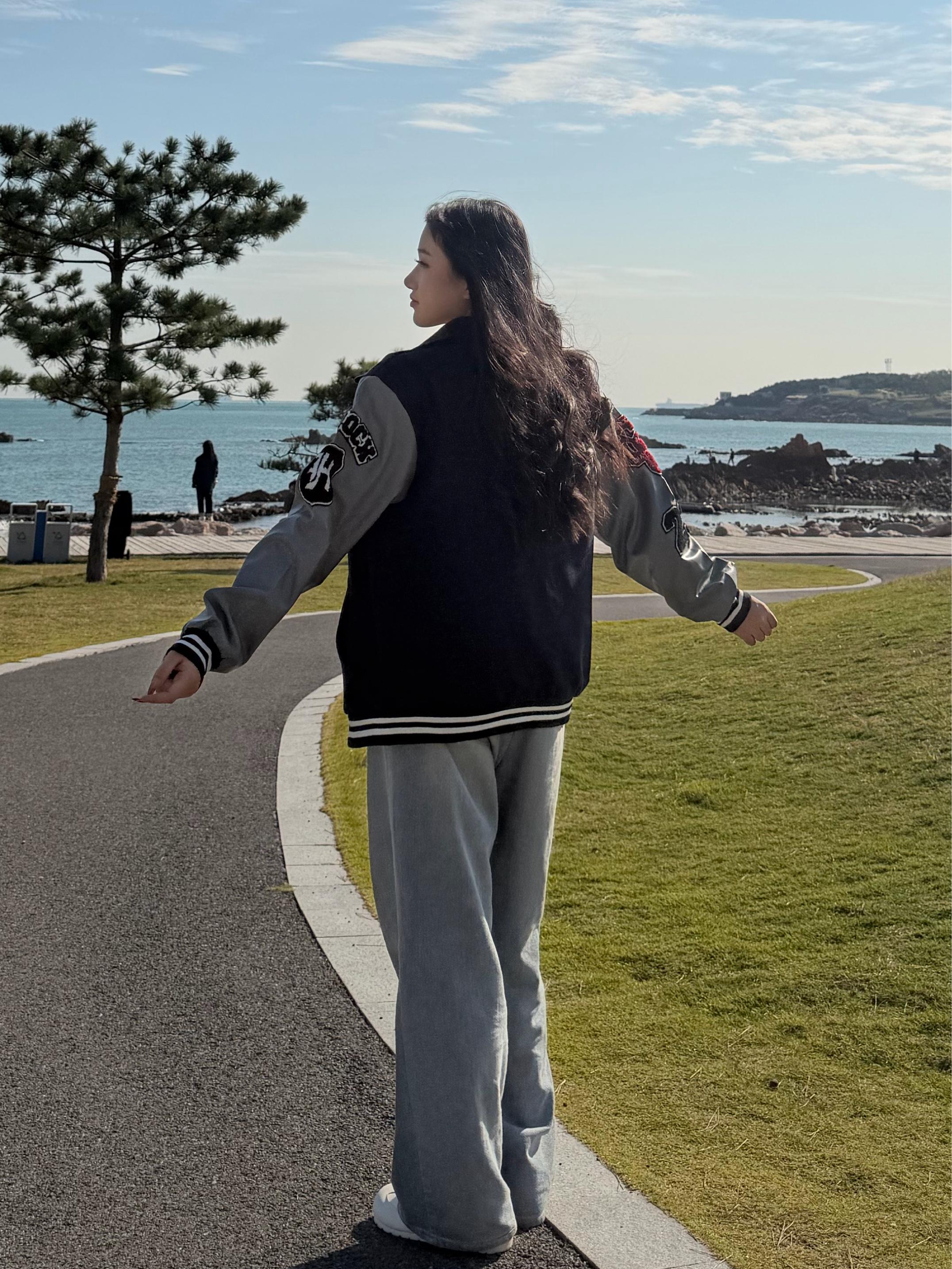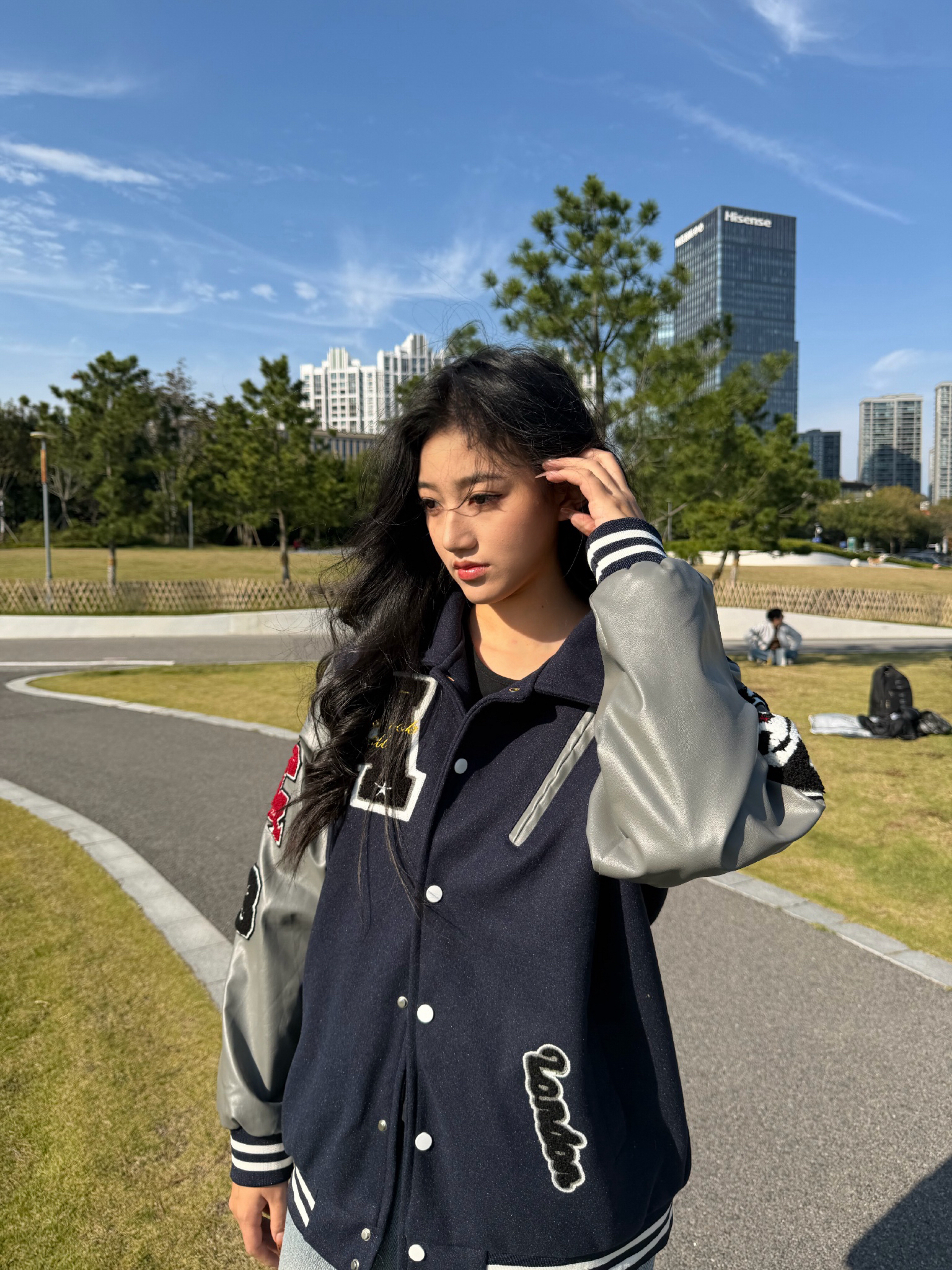 早秋出街的美式复古小灵感~ 撞色拼接的美式刺绣夹克自带街头腔调,宽松版型藏肉又随性~ 内搭基础黑色T恤,下装搭配浅灰系裤子, 轻松穿出秋日里潮酷又自在的日常氛围~