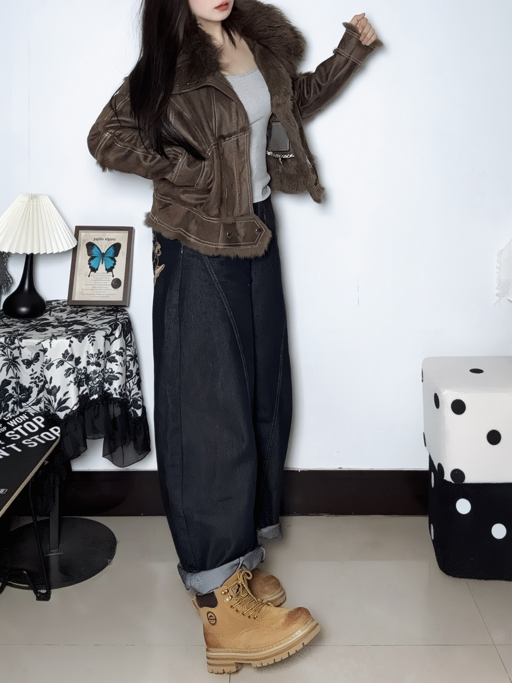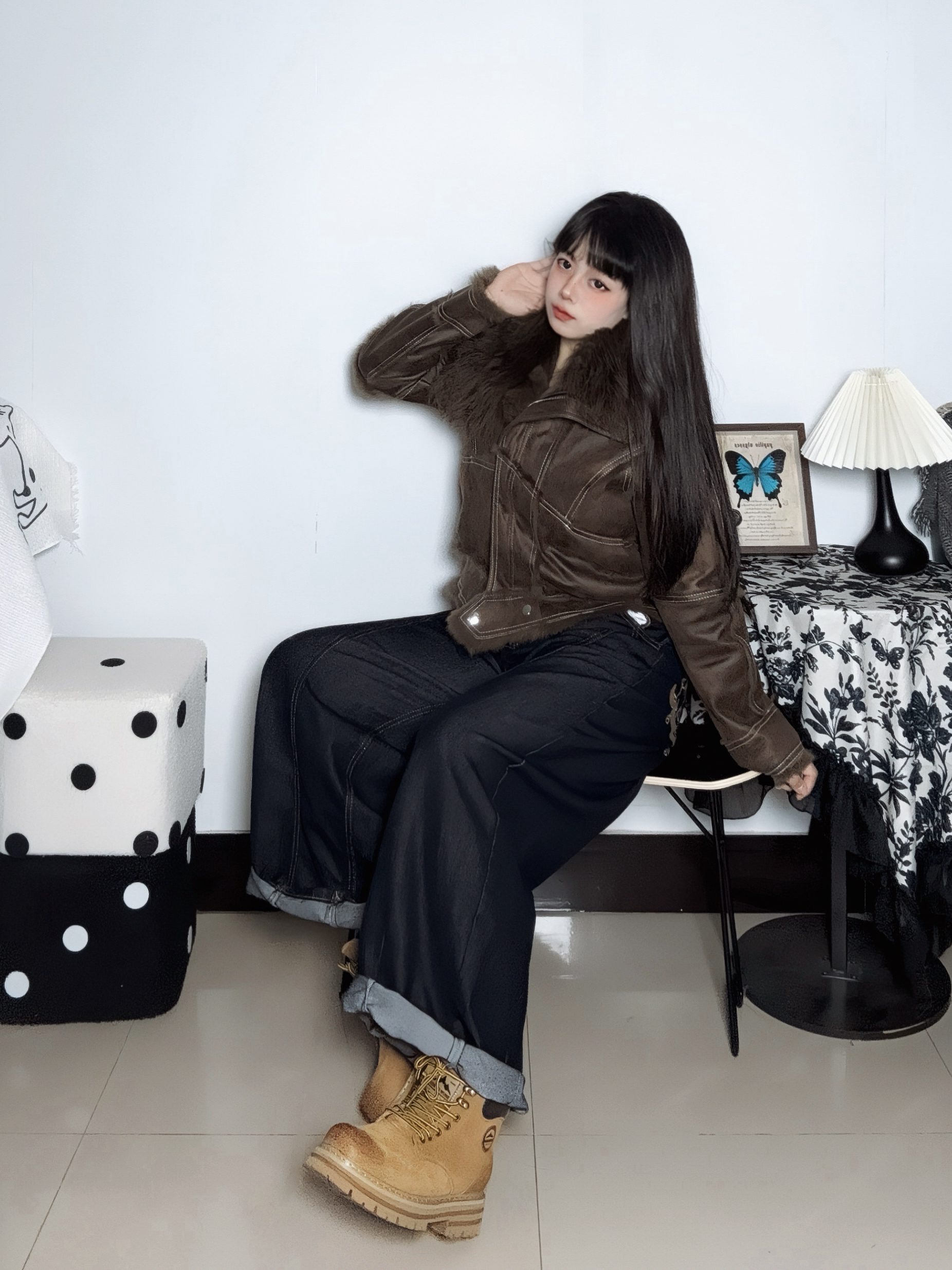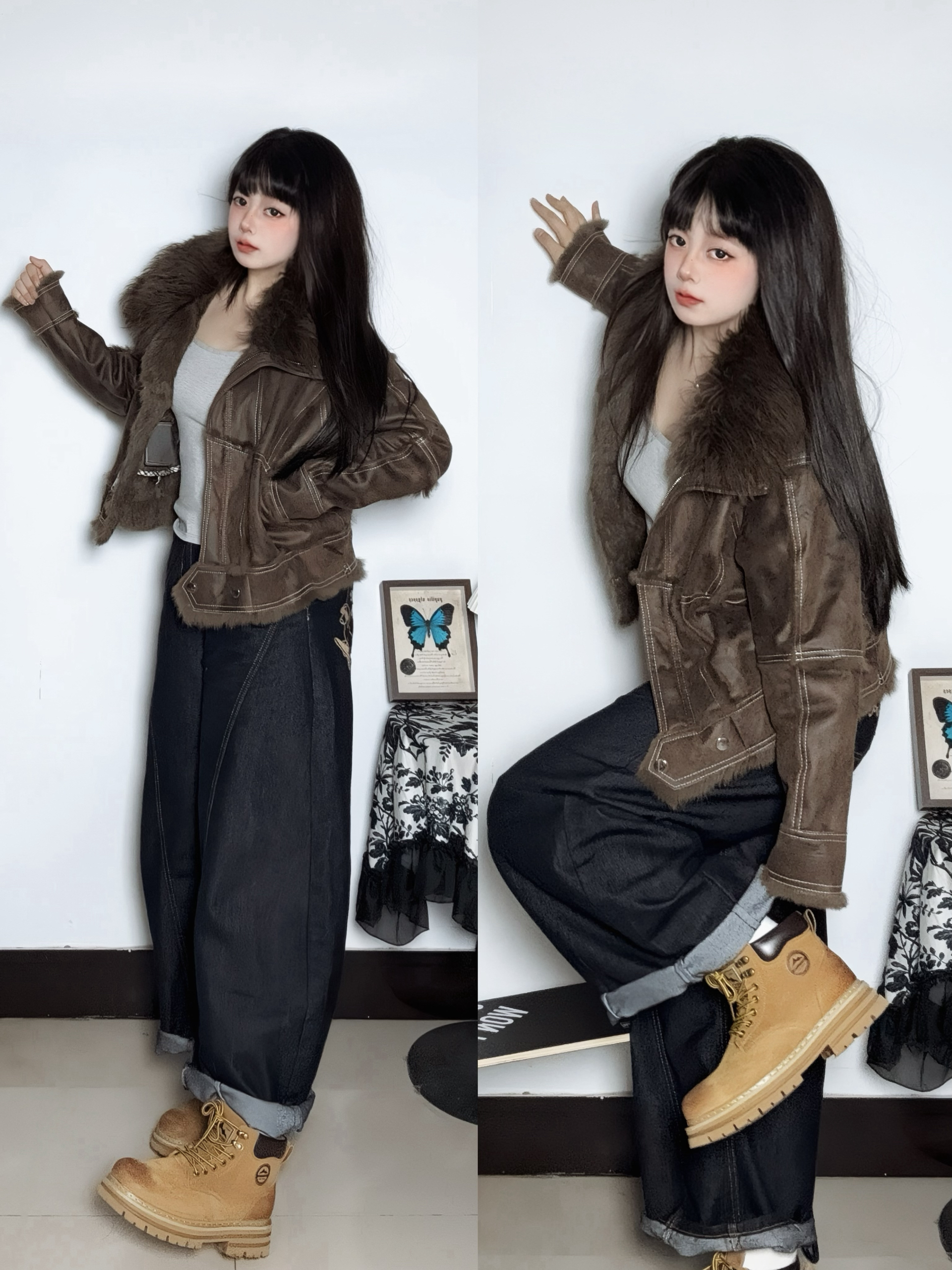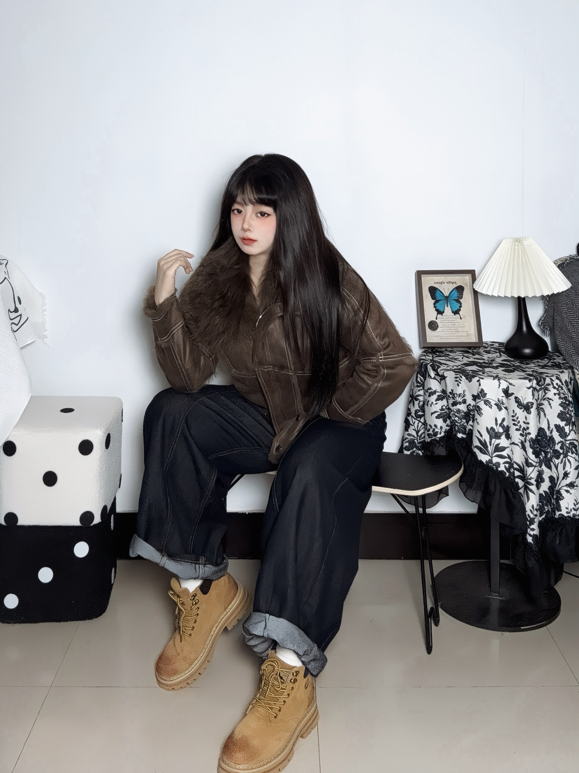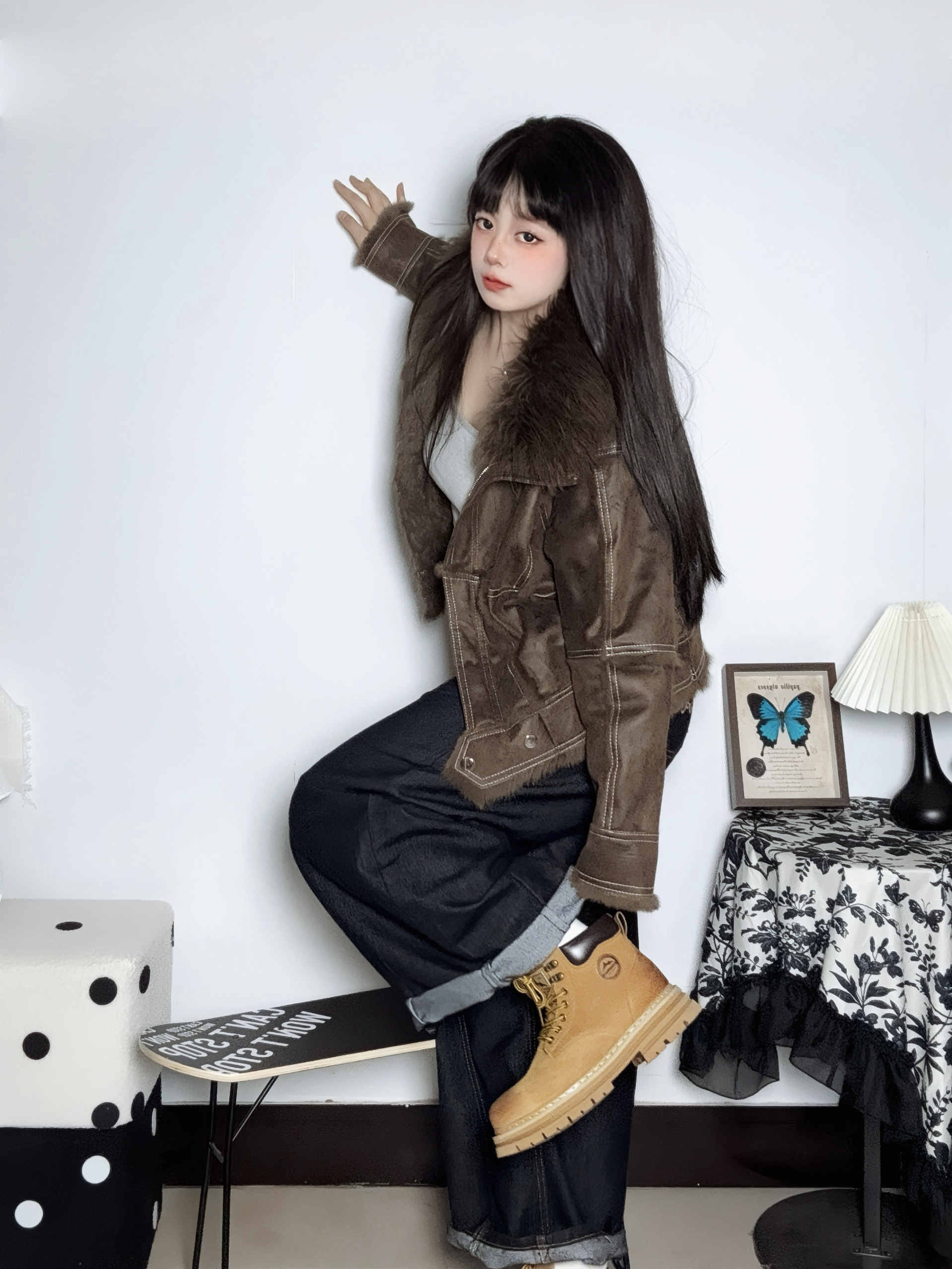 🎽: 棕褐色麂皮拼接毛领短款外套 内搭浅灰吊带hin有复古松弛感~ 👖: 阔腿牛仔裤卷边露出点裤脚边 随性不拖沓 👟: 鞋型偏硬朗但颜色百搭 厚底倒是不沉 走一天脚也不闷 配牛仔或休闲裤都很搭 是适合通勤和学生的“懒人鞋”啦~ 参考尺码:正码