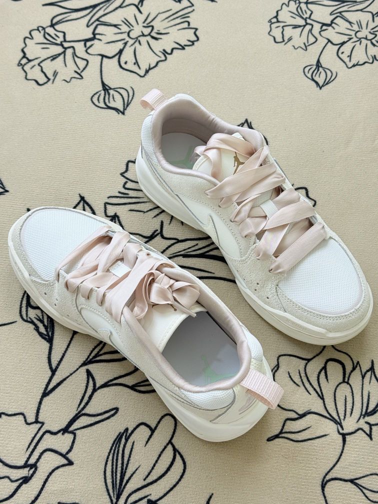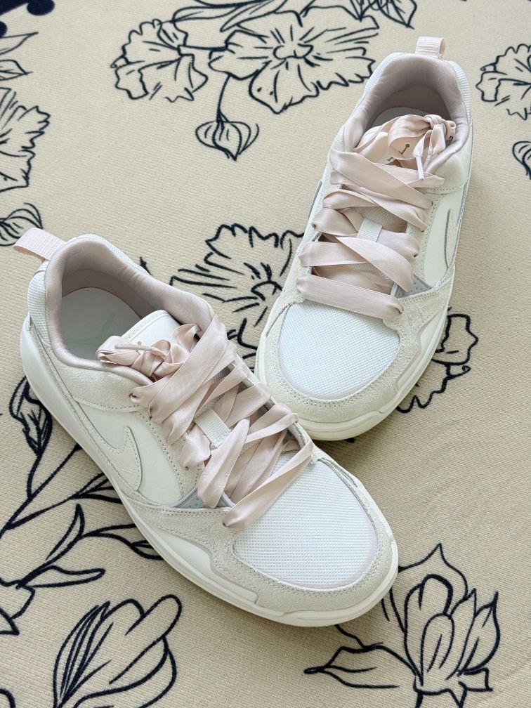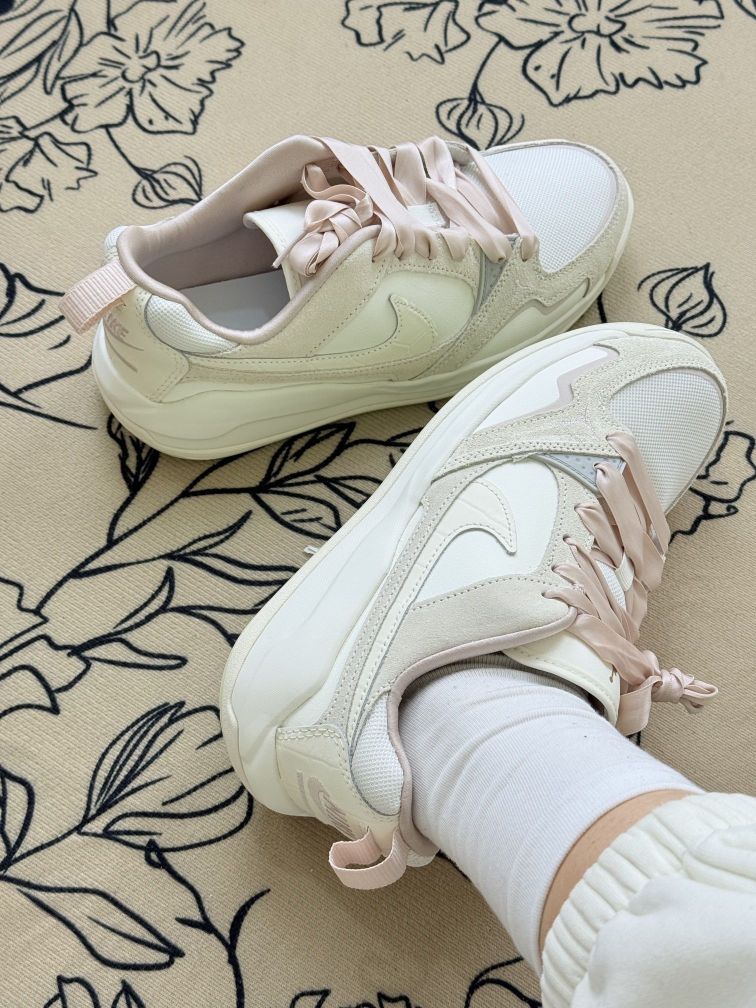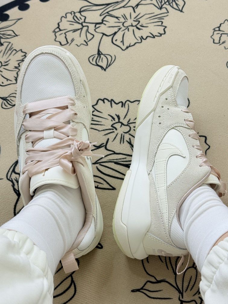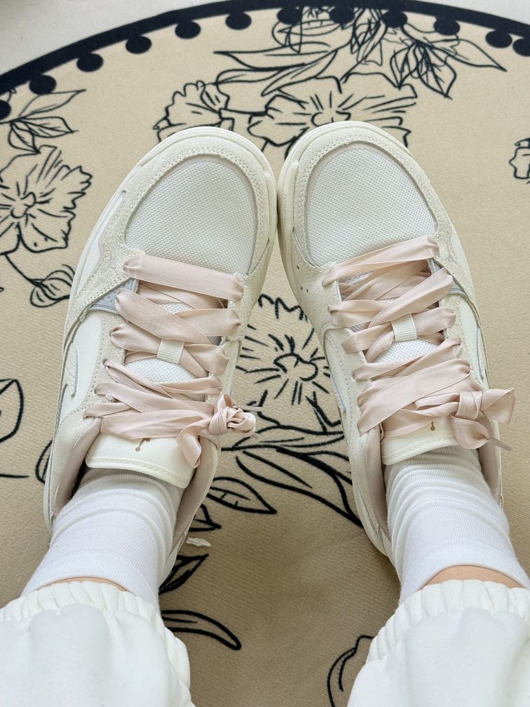 这双AJ鞋换了粉色丝带鞋带后,风格变得很特别,甜酷甜酷的,搭配裙子或休闲裤都有不一样的感觉😊鞋身的米白色调也很柔和,日常穿挺百搭的。 不过得说个小缺点,丝带鞋带虽然好看,但没有普通鞋带牢固,走久了偶尔会松,得停下来系一下。舒适度方面,它的鞋底不算特别软,长时间逛街的话,脚底板会有点小累。 但胜在它的设计很有辨识度,换个鞋带就能换种风格,算是鞋柜里比较有玩头的一双。要是你喜欢这种可盐可甜的风...