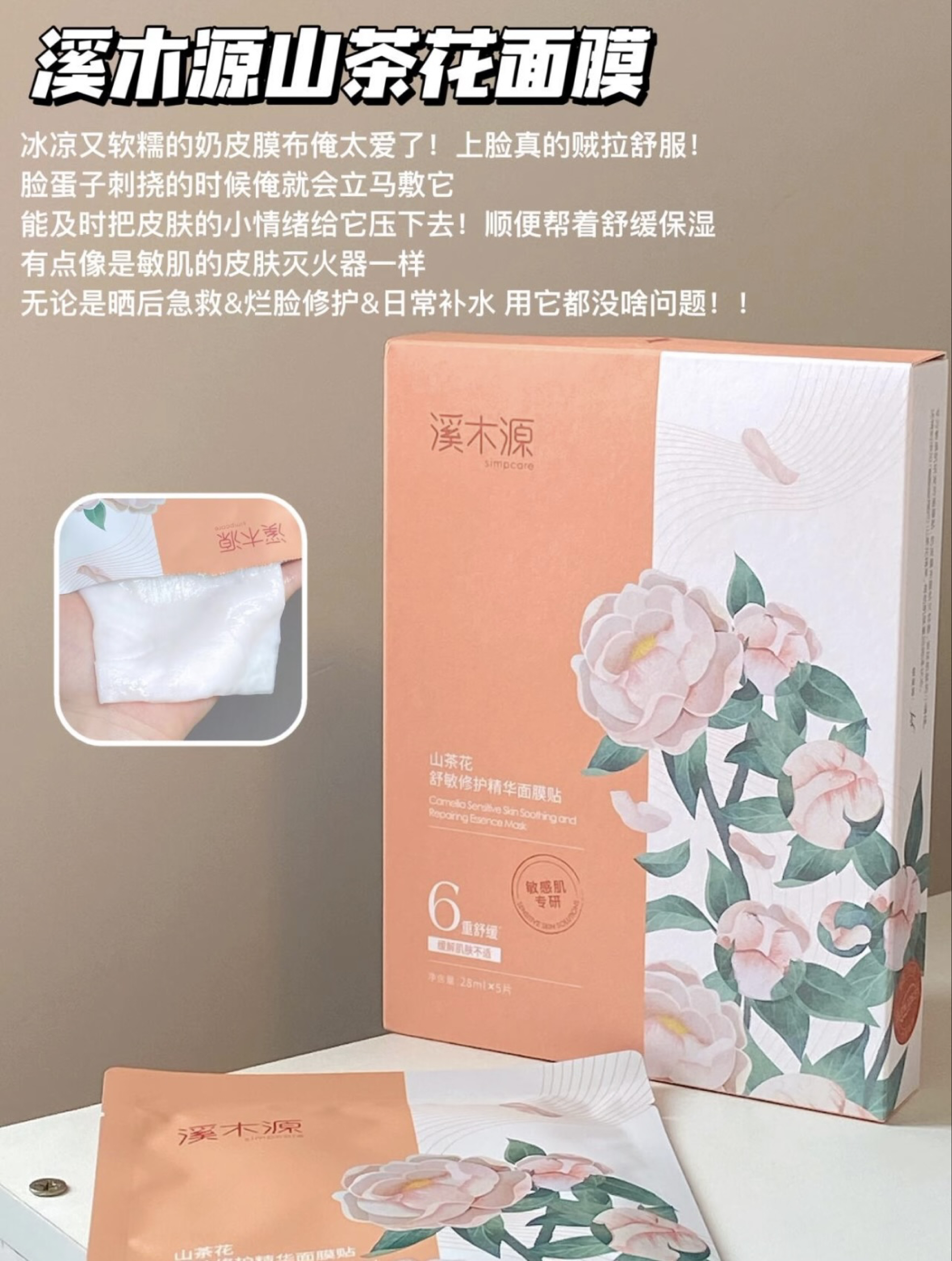 本篇笔记关联了溪木源 山茶花舒敏修护精华面膜 滋润28ml*1片、【蔡徐坤同款】smpcare/溪木源 山茶花护肤套装【水+乳】沁透消红修护舒缓肌肤屏障 【3.0】水120ml+乳60ml、smpcare/溪木源 氨基酸慕斯洗面奶 云朵泡沫绵密清洁毛孔温和敏肌 第四代等商品,为用户提供真实的使用体验和购买参考。