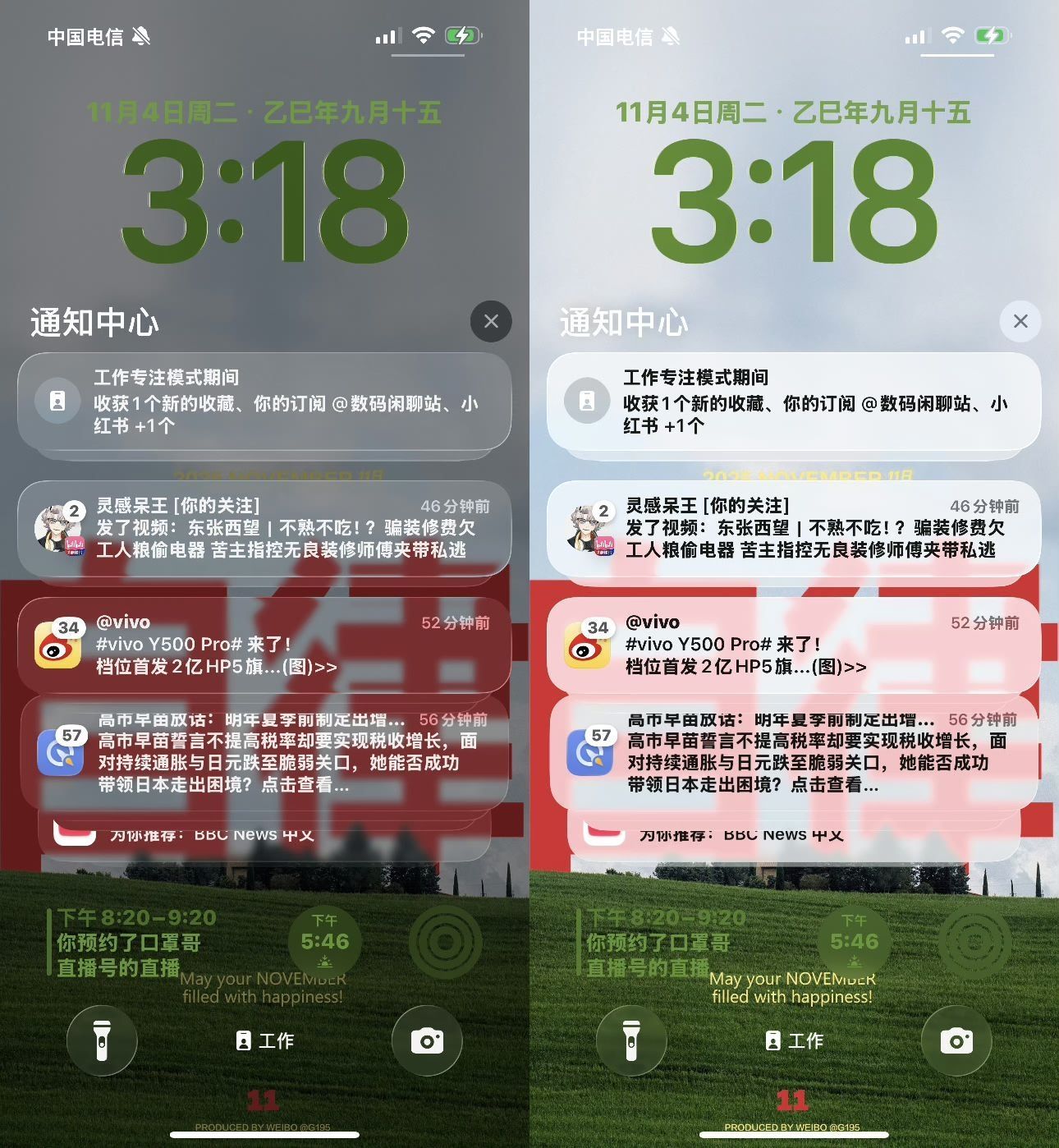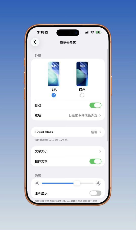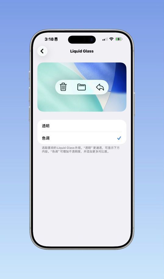 先说最容易被吐槽的「液态玻璃」。iOS26把整个系统蒙上一层会随壁纸变色的高透玻璃,好看却常把文字衬得发虚。26.1在「设置▸显示与亮度」底部新增「LiquidGlass」入口,把开关做成二选一:「透明」保持原有高透;「色调」则叠一层不透明的灰色,锁屏通知、底部Dock、控制中心立刻变得好读,对户外强光党尤其友好。
