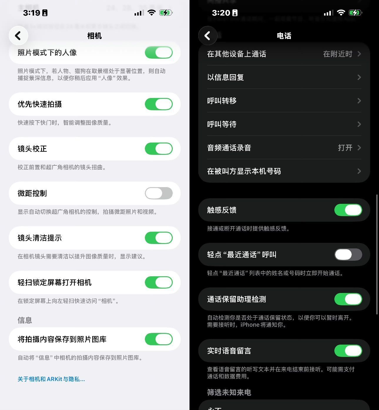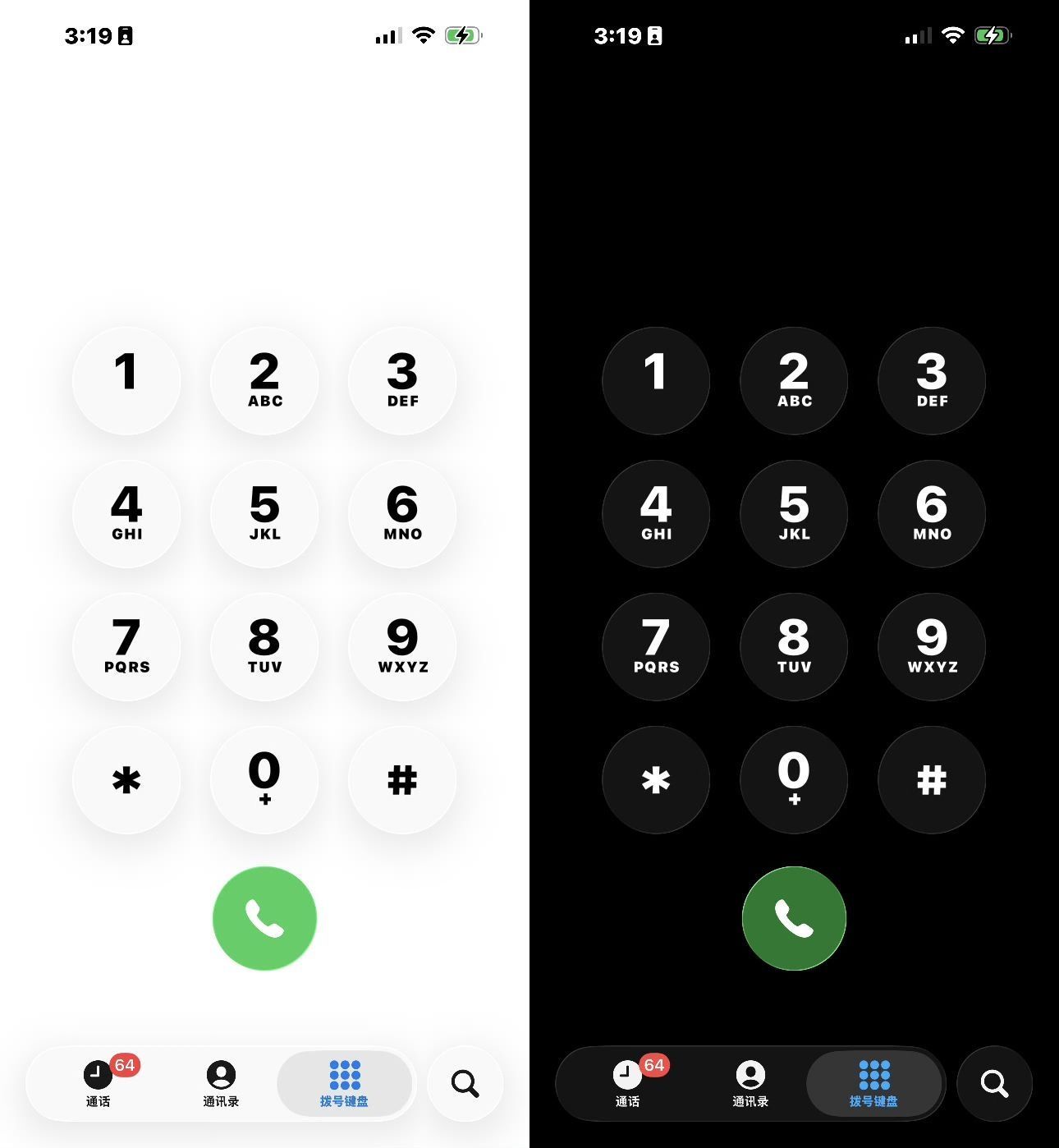 电话拨号键盘换上液态玻璃2.0。按键更白、边缘更立体,按下时有120Hz的弹性缩放动画,浅色和深色模式都更灵动。同页面还埋了一个彩蛋:「设置▸App▸电话」里新增「触感反馈」开关,接通与挂断时马达会短振一下。