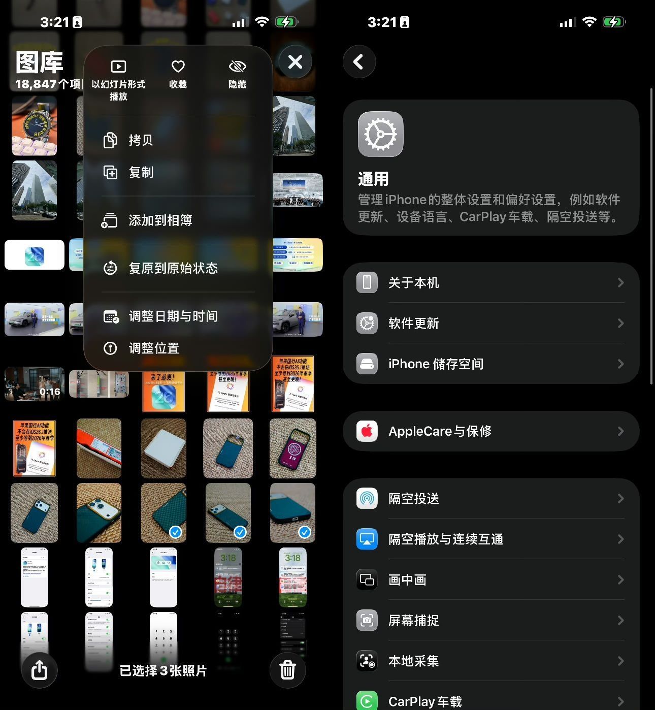 相册多选照片后点「···」菜单,顶部横向塞入「幻灯片」「收藏」「隐藏」三大高频功能,下方新增「从相簿移除」,不用先删再整理。