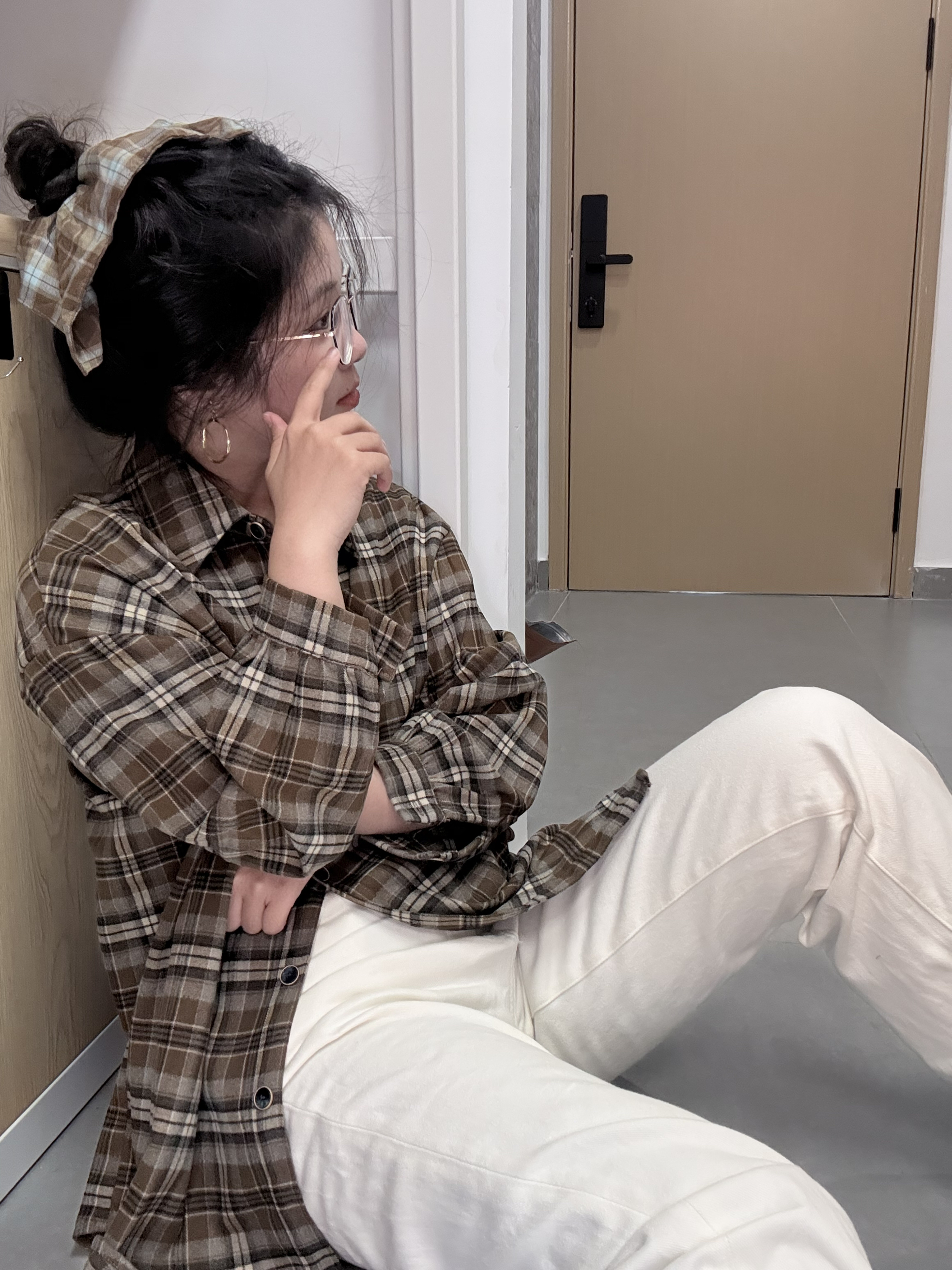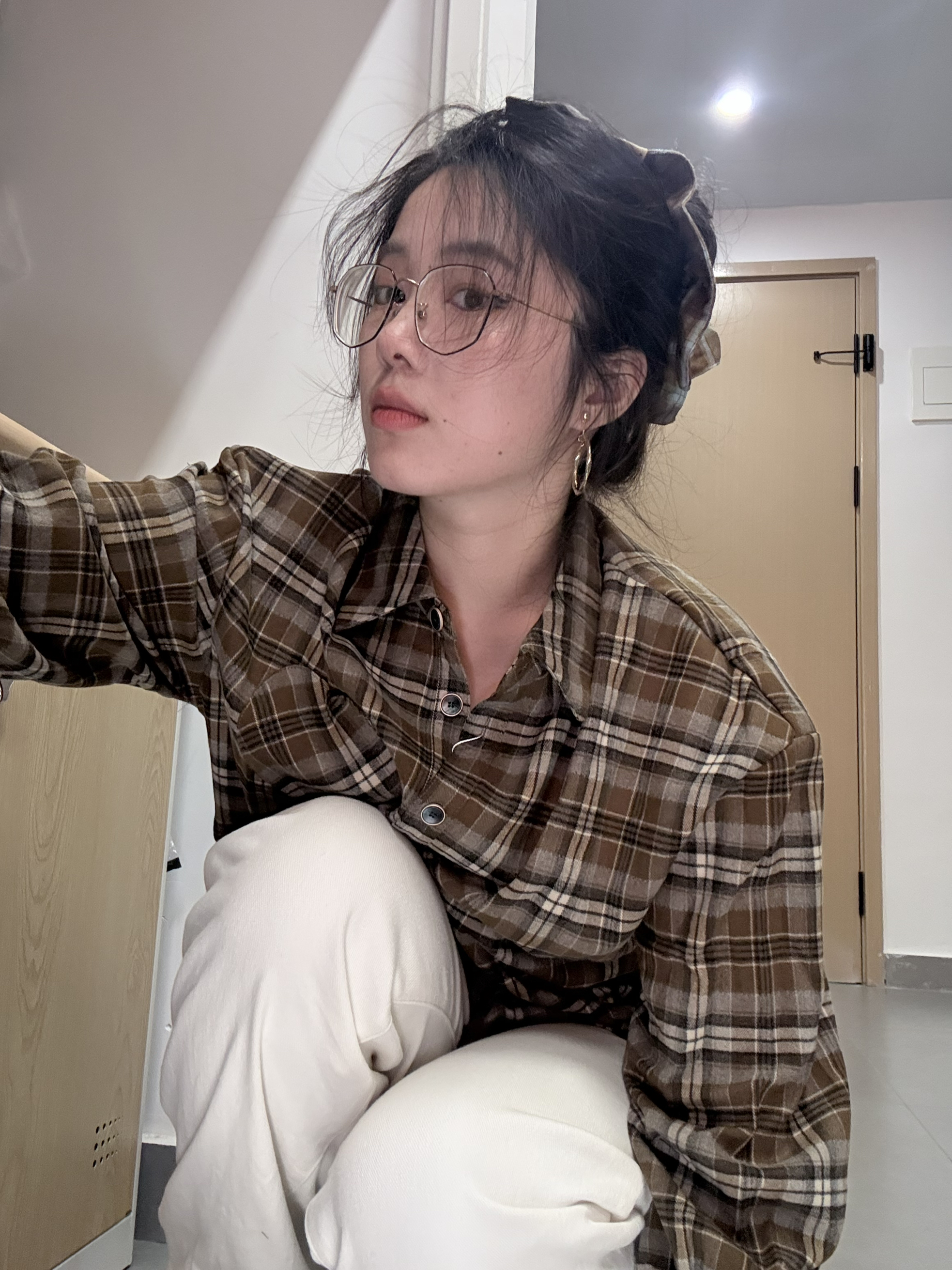 有没有一种可能 我就说借鉴过来的呢😄 丸子头➕格子布➕直筒裤➕板鞋 格子衫是很有年代感的时尚单品啦 就是一种朴实➕做旧➕复古的风格 裤子是白色的 显得整体更加轻盈明亮(不那么沉闷😁) 心机来自于 我的头发o 难得的是 本猪包把头发扎起来了! 感觉这样更加知青🤏 搭配我期待了很久的发圈 这一身很有味道啦