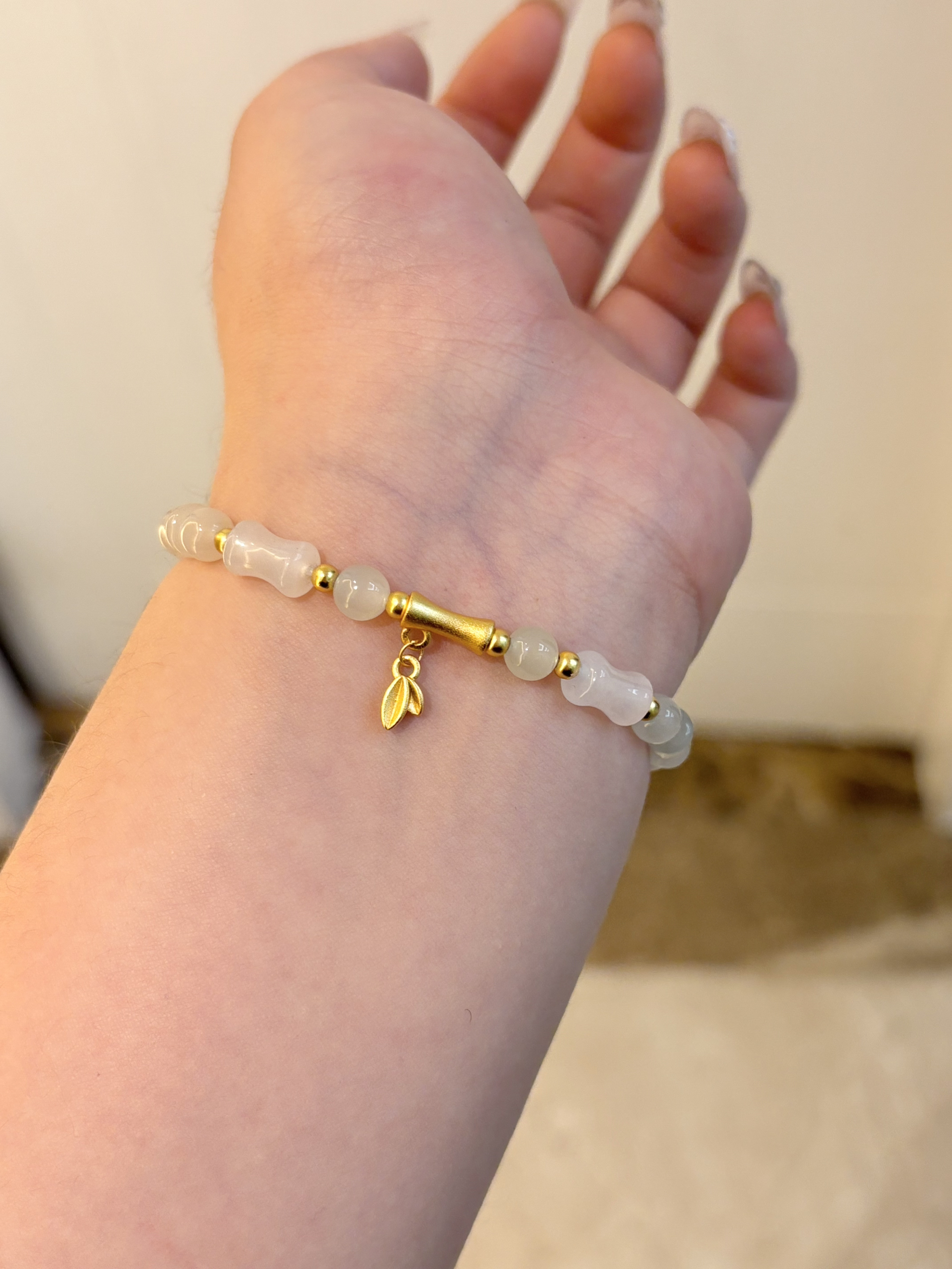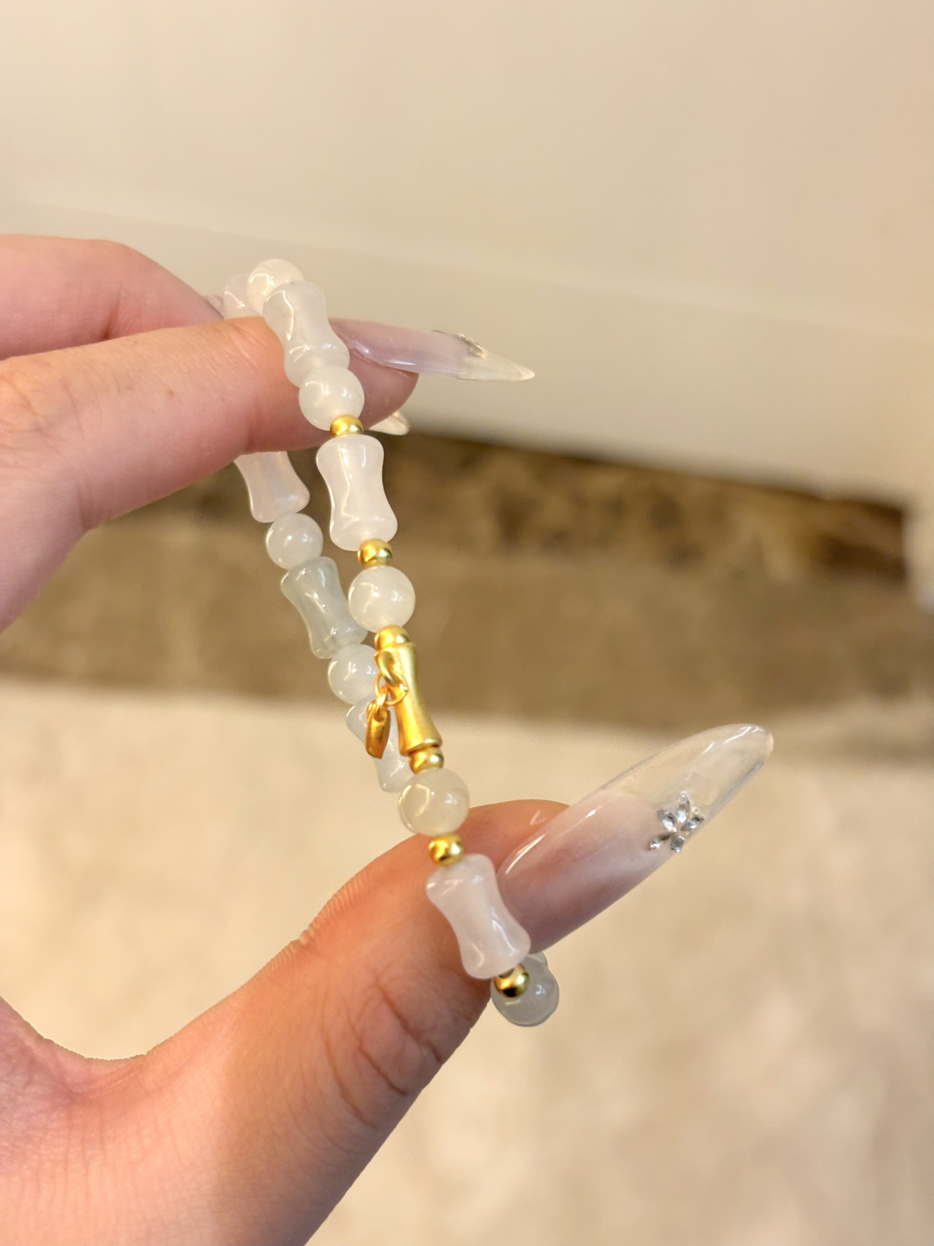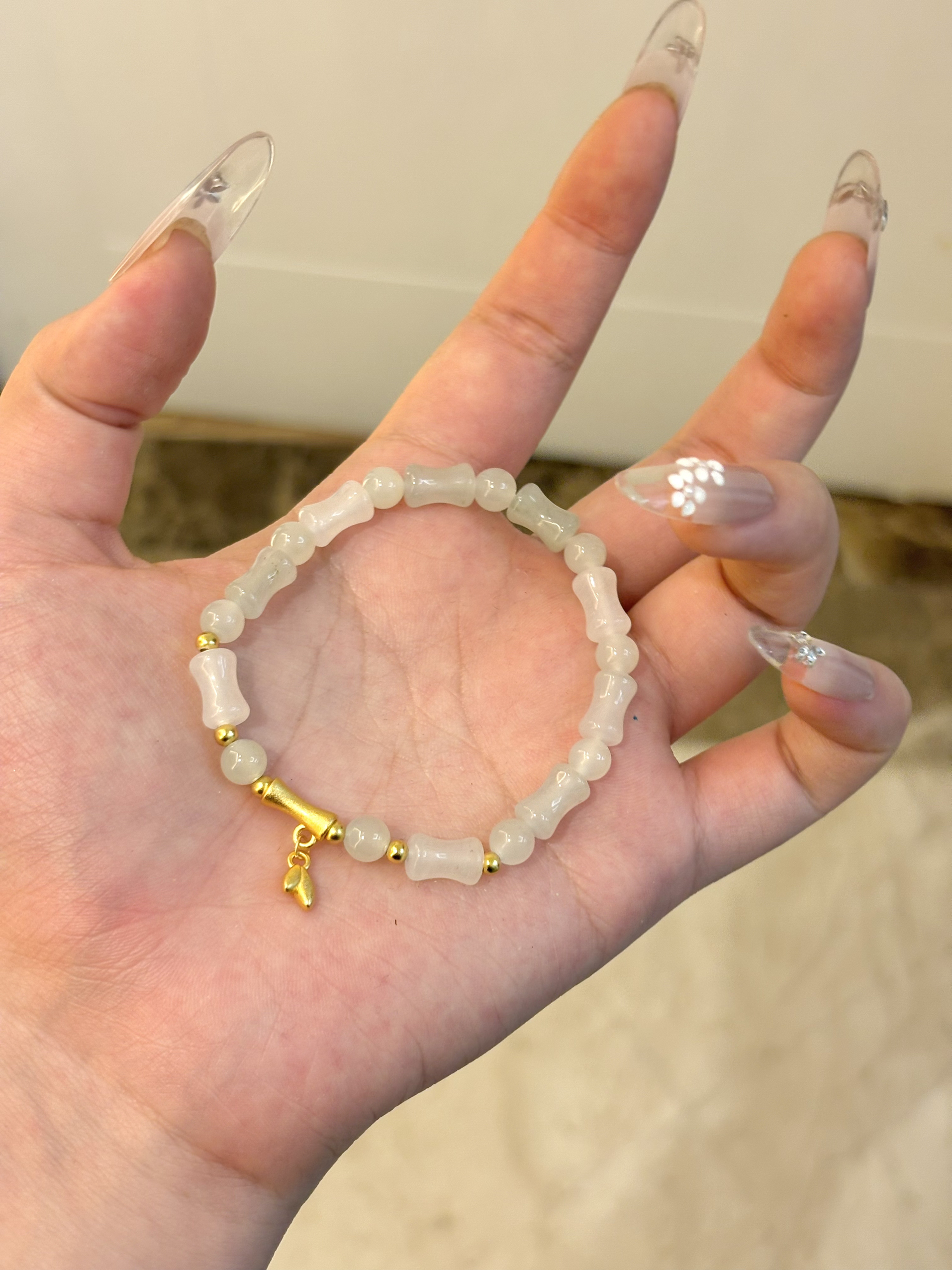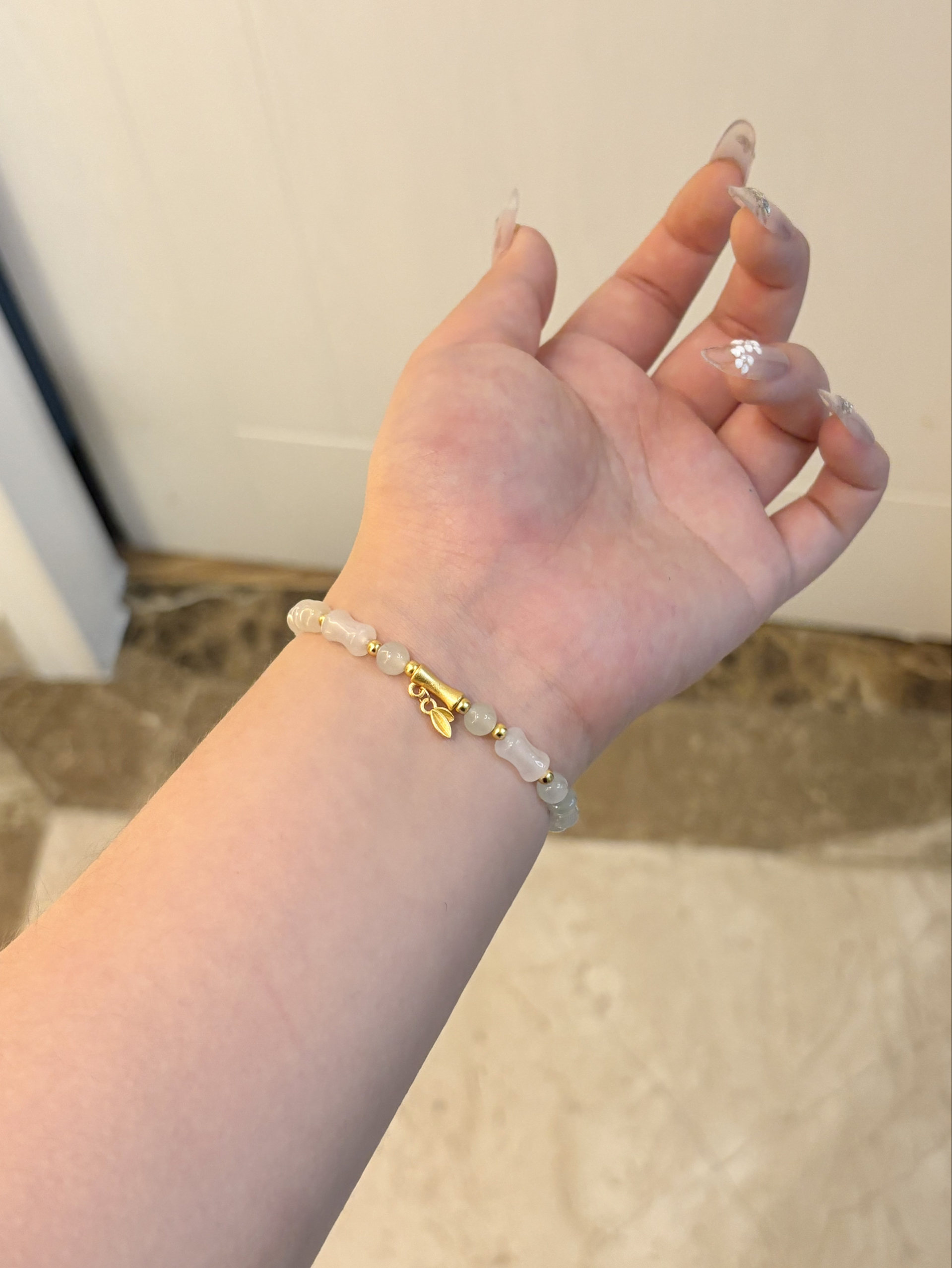 小克重黄金手串! 搭配清透的和田玉和天山翠~ 戴在手上贵气感满满 一整个就是很温柔~ 竹节的造型,真的新中式感很强! 寓意也敲好:竹定遇见你,竹够我爱你…… 糯糯的绿色再搭配一点黄金 谁能不爱上啊!