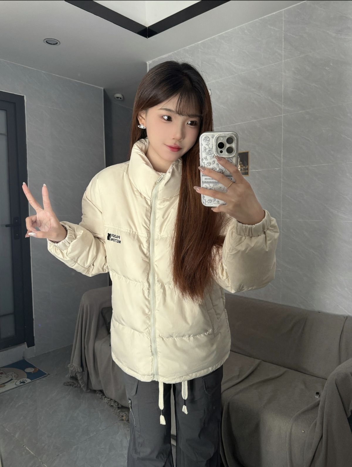上身尺码建议M 心情不错今天穿个羽绒服给大家看看~ 杏色上身以后版型没有问题 款式风格偏向甜妹多一点 衣长不能遮过屁股所以建议买大一码~