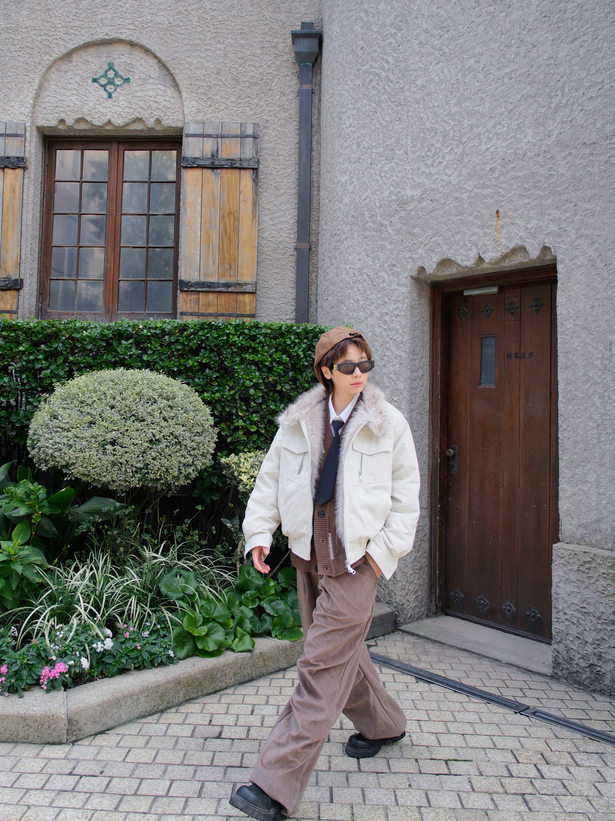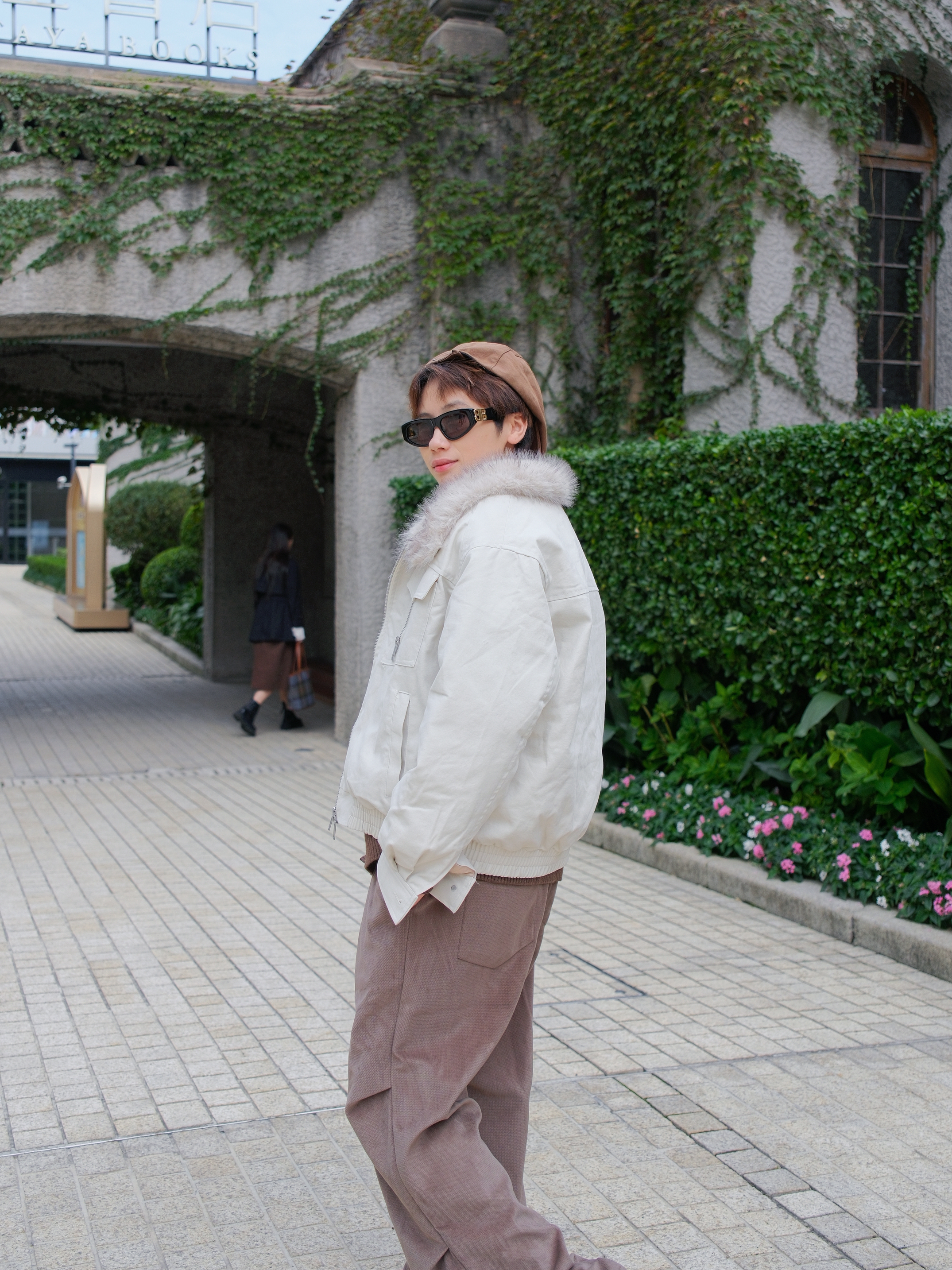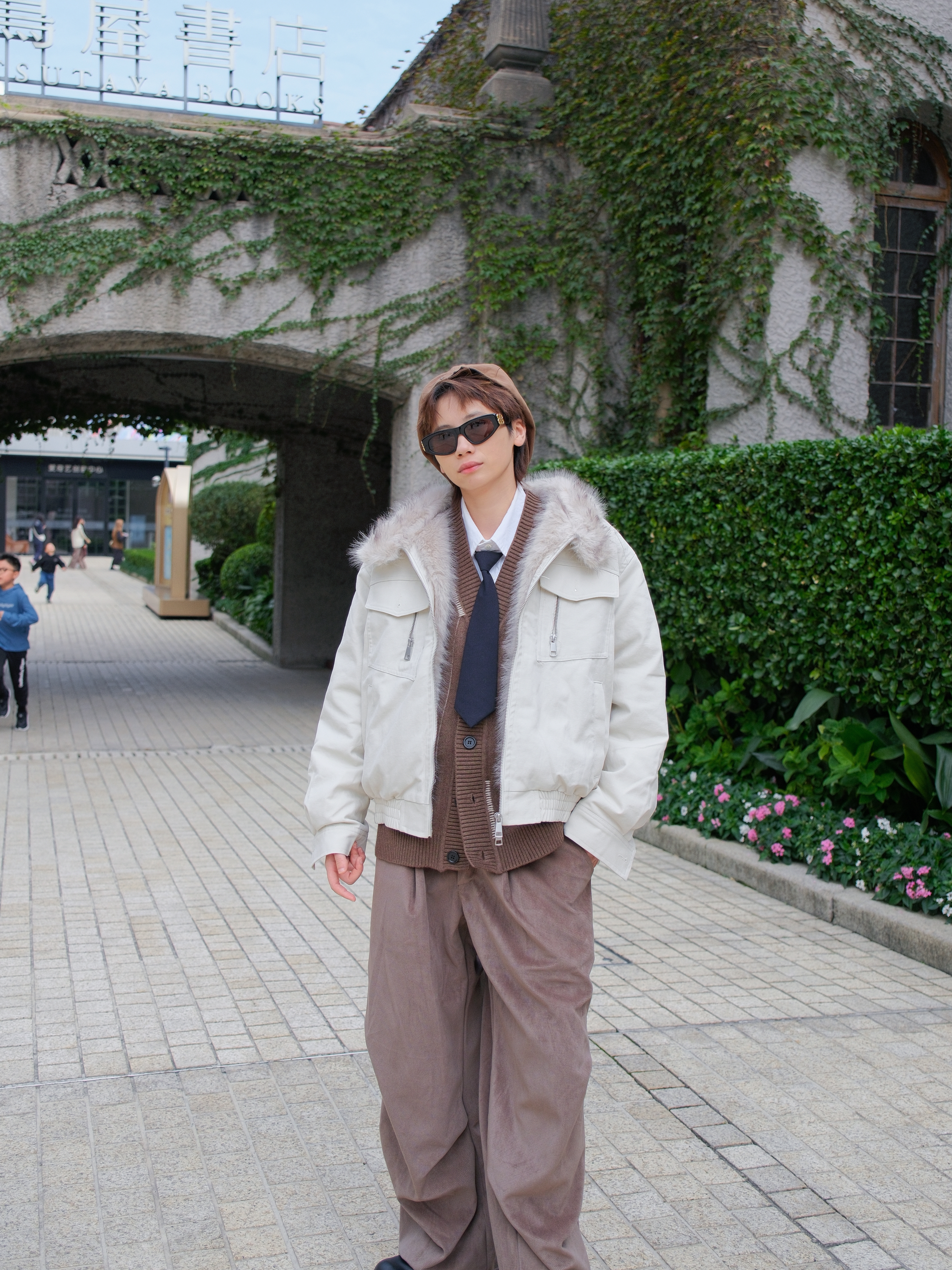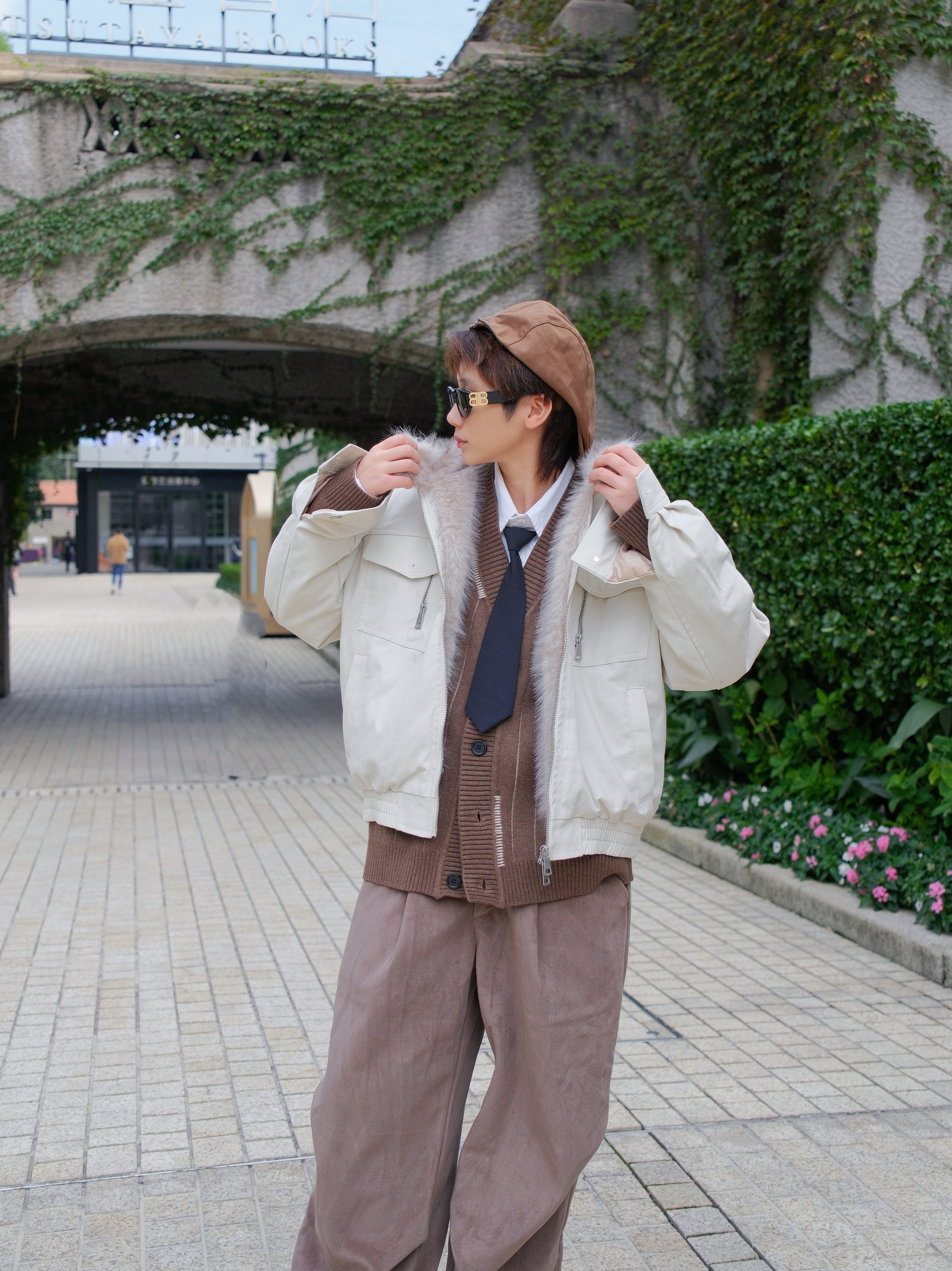 怎么才能搭出差异化,我的思路就是“叠” 白色衬衫➕咖色毛衣开衫 再来一条黑色领带和卡其色前进帽 外面套一件米灰色座山雕 90白鸭绒内胆加上这个蓬松的毛领巨暖和 外壳是做了哈灵顿夹克的风格 街头工装风和保暖兼顾 下面搭配咖色伞宾裤和德比鞋 复古感拿捏🤏🏻 🧥: GROUND(ZER)O 尺码参考:163cm/48kg 上身M码
