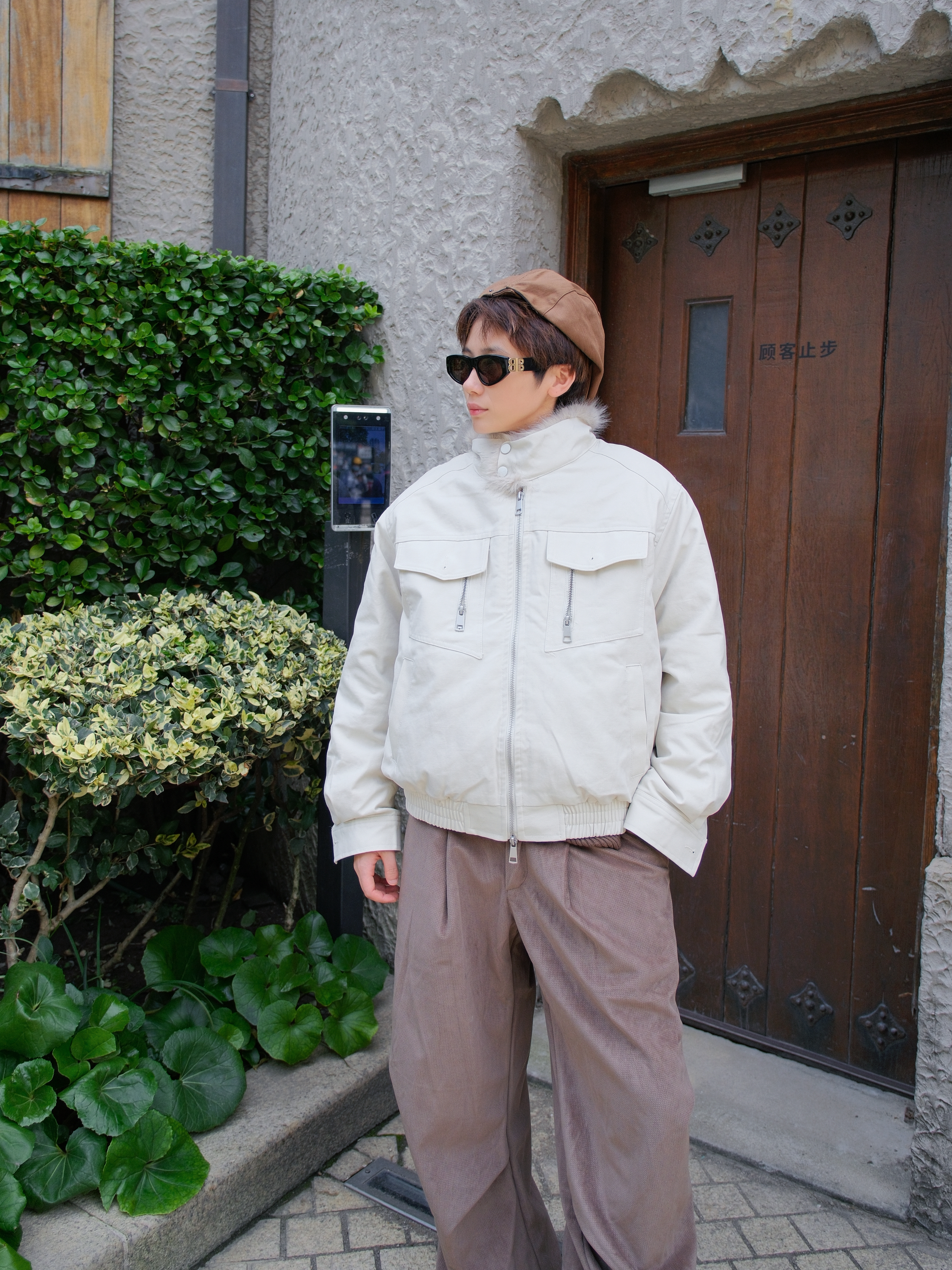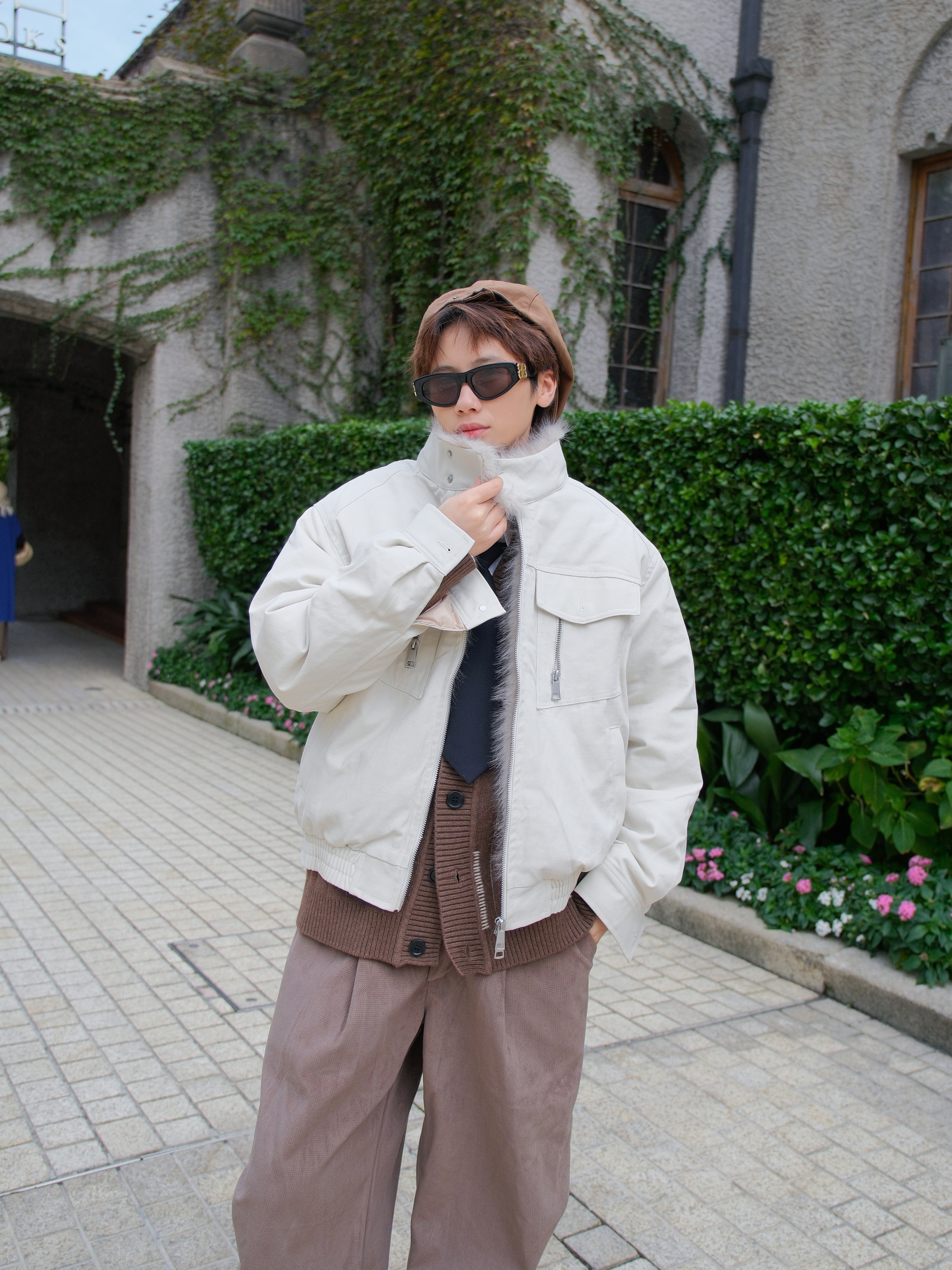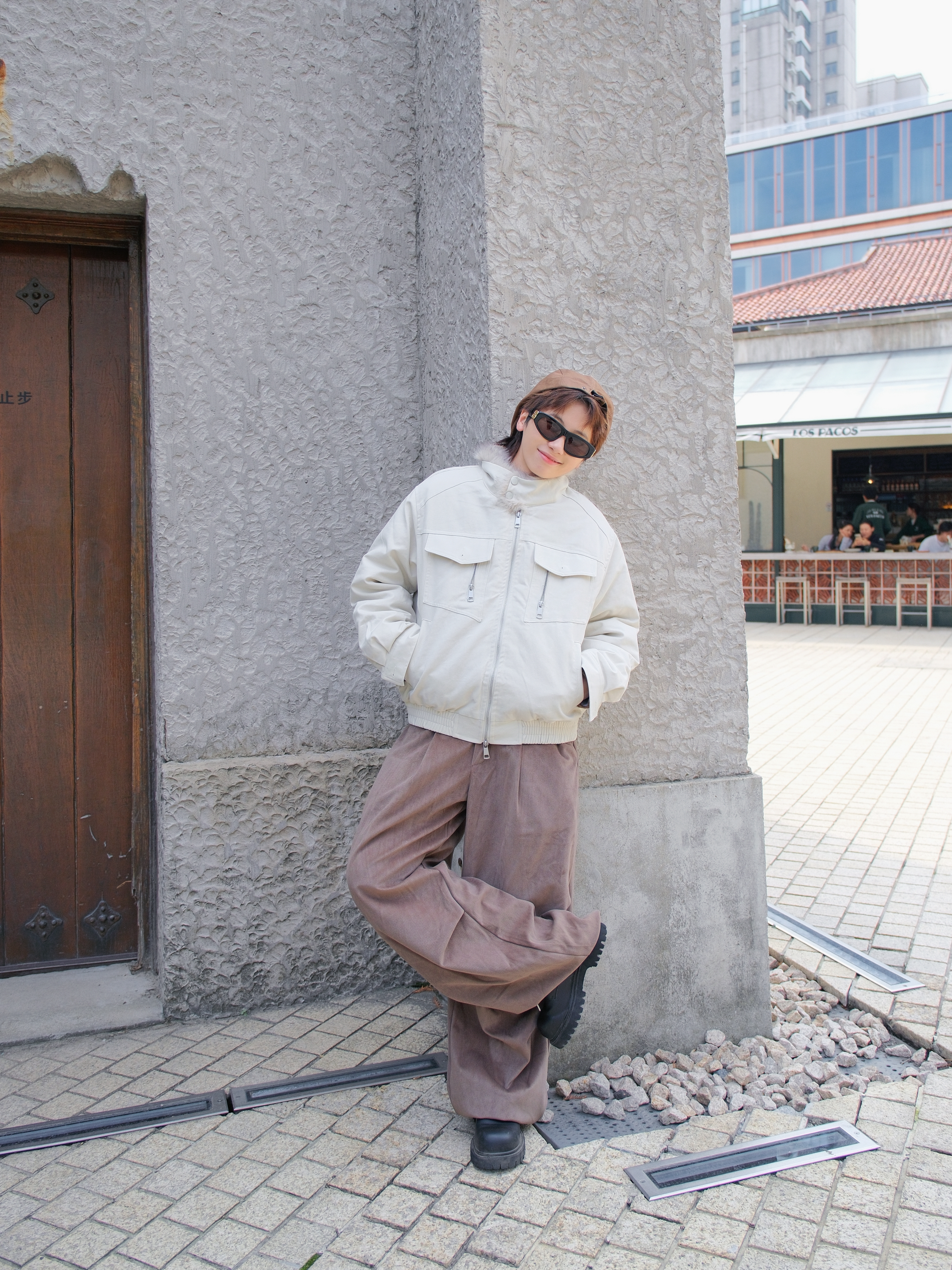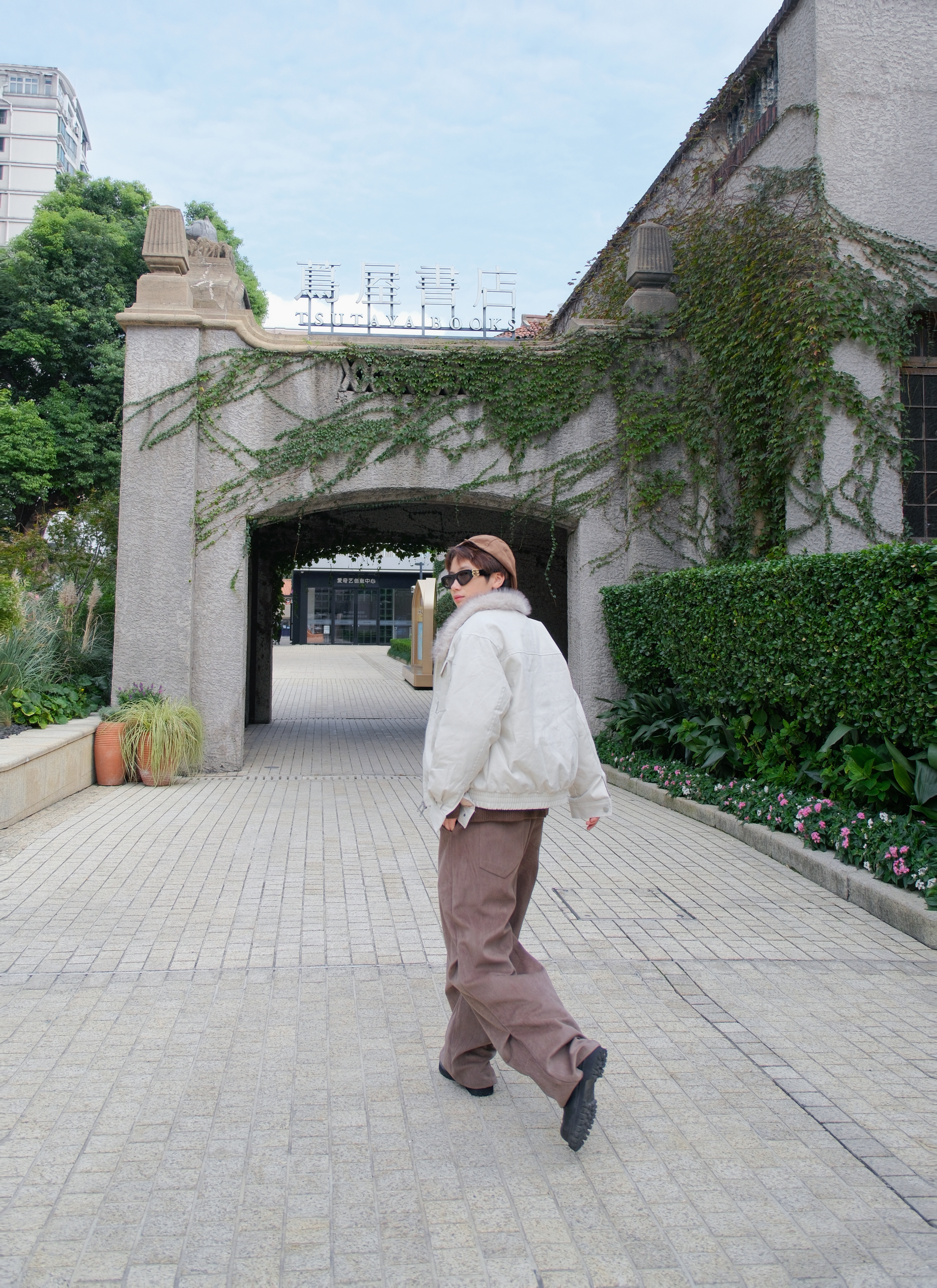 怎么才能搭出差异化,我的思路就是“叠” 白色衬衫➕咖色毛衣开衫 再来一条黑色领带和卡其色前进帽 外面套一件米灰色座山雕 90白鸭绒内胆加上这个蓬松的毛领巨暖和 外壳是做了哈灵顿夹克的风格 街头工装风和保暖兼顾 下面搭配咖色伞宾裤和德比鞋 复古感拿捏🤏🏻 🧥: GROUND(ZER)O 尺码参考:163cm/48kg 上身M码