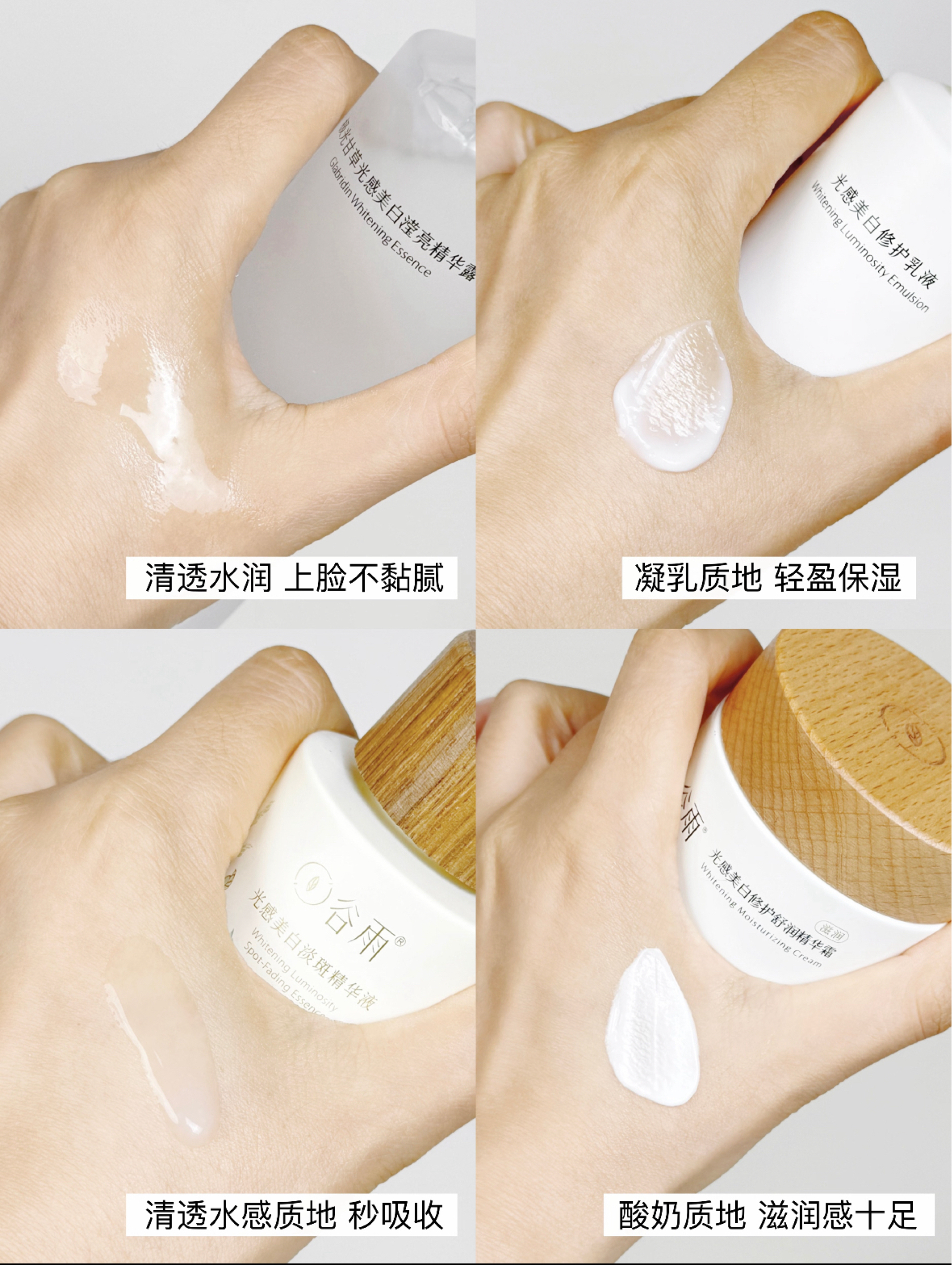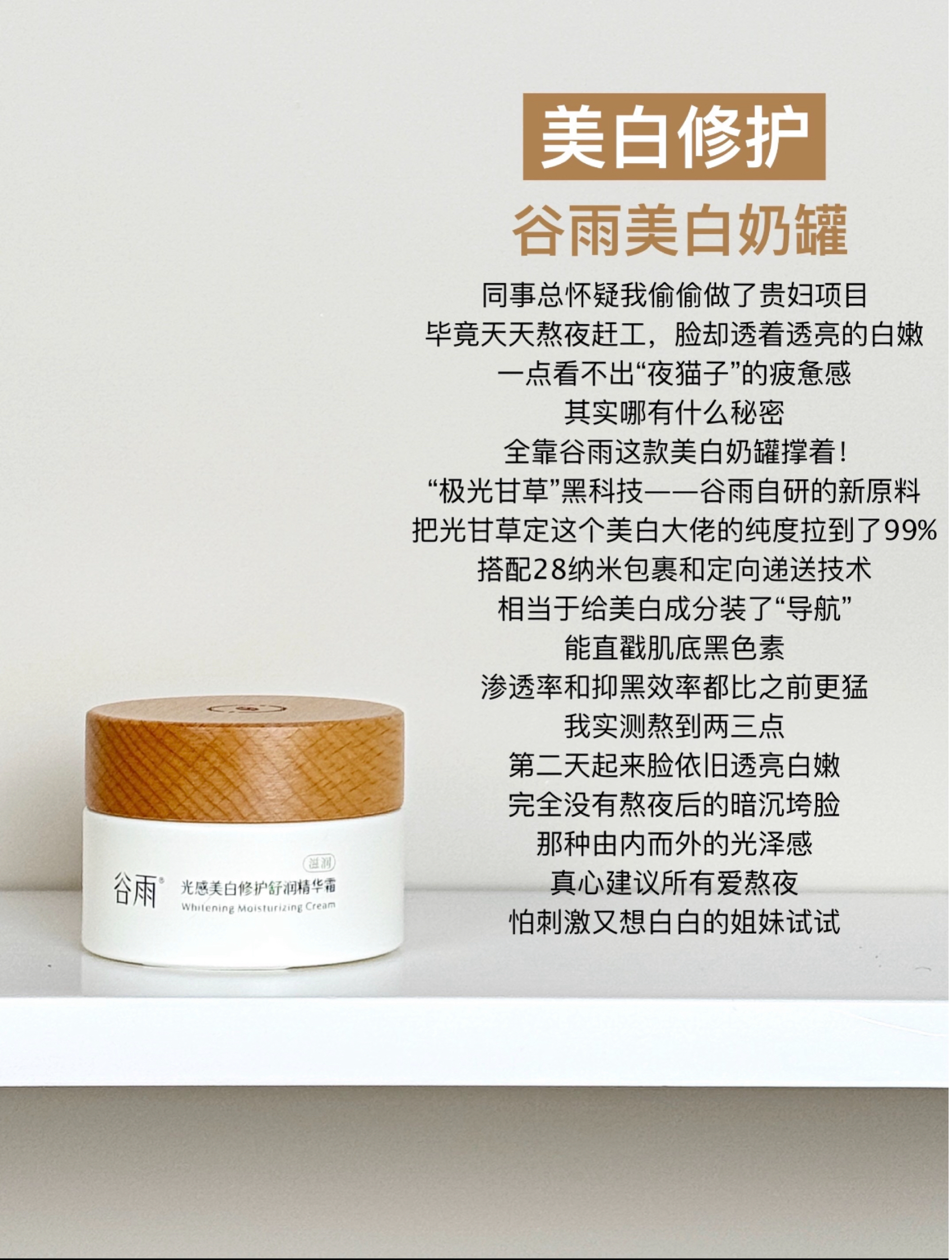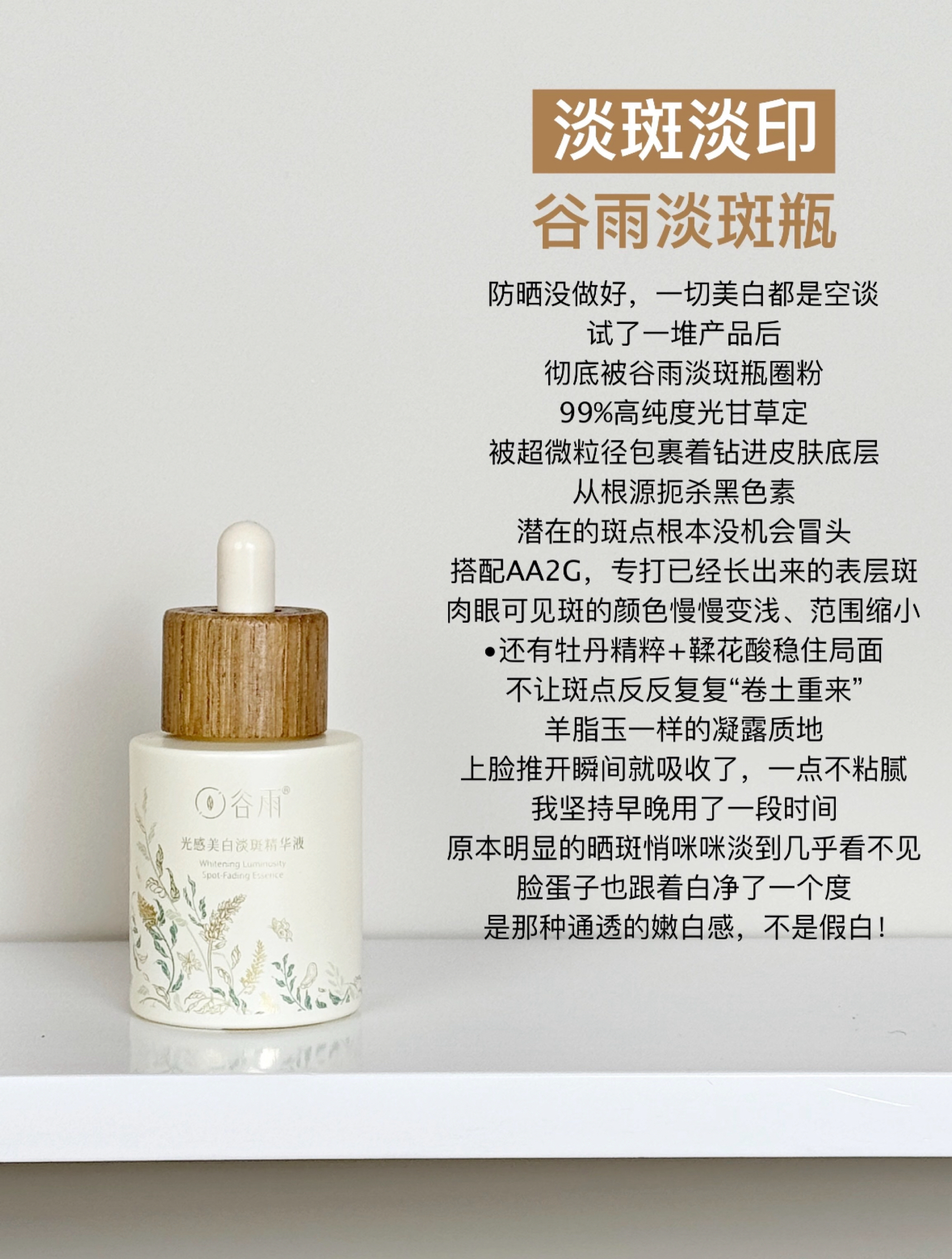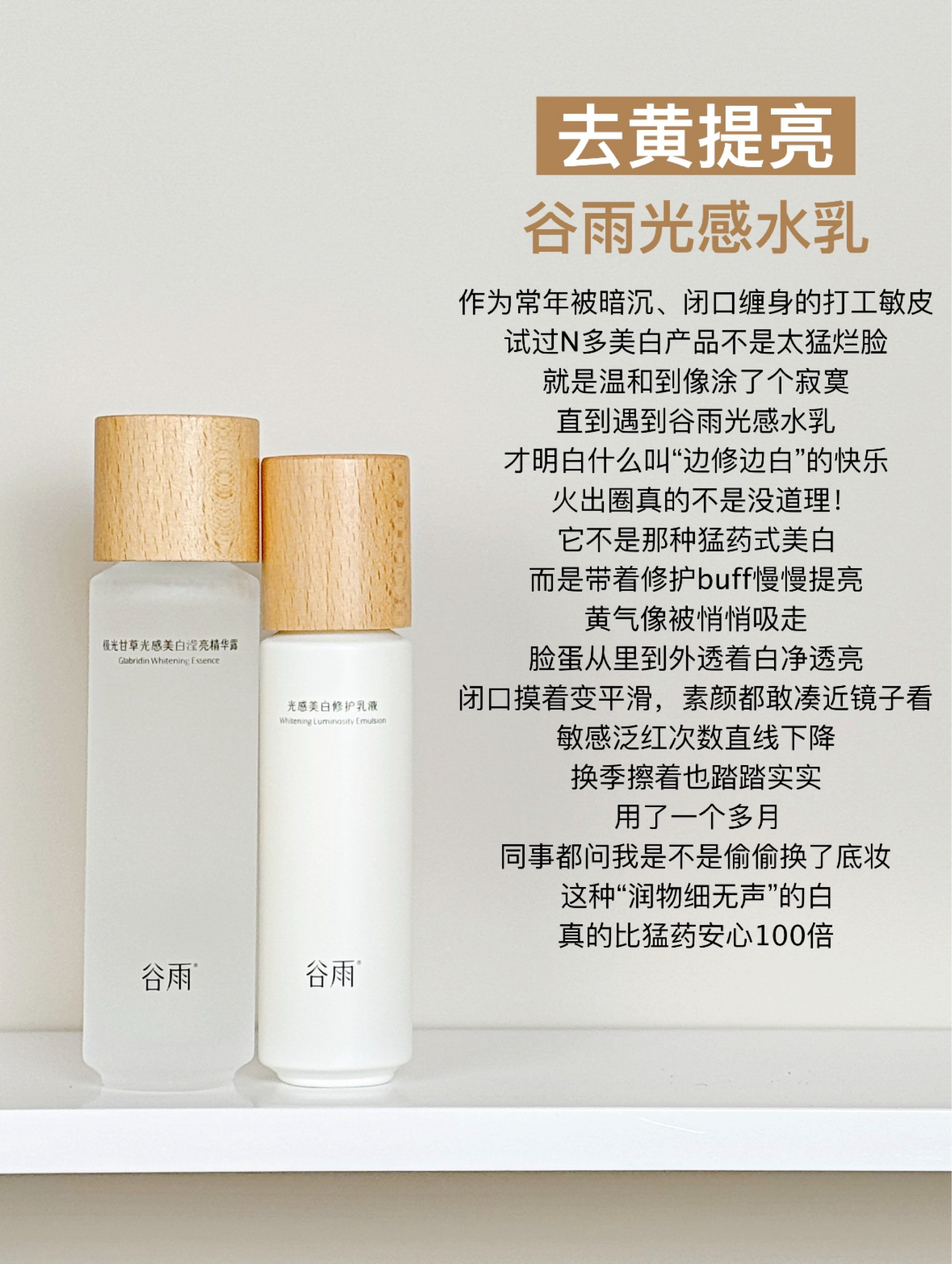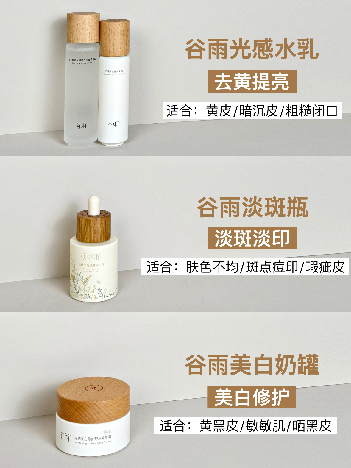 本篇笔记关联了谷雨 光感护肤套装【水+乳+霜】 去黄美白提亮油痘肌 精华露150ml+精华乳100ml+精华霜50g、谷雨 光感滢润修护护肤套装【水+乳】 去黄提亮 【第三代】光感水150ml+光感乳100ml、谷雨 淡斑瓶光感美白精华 保湿淡化痘印抗氧化去黄提亮 旧版等商品,为用户提供真实的使用体验和购买参考。