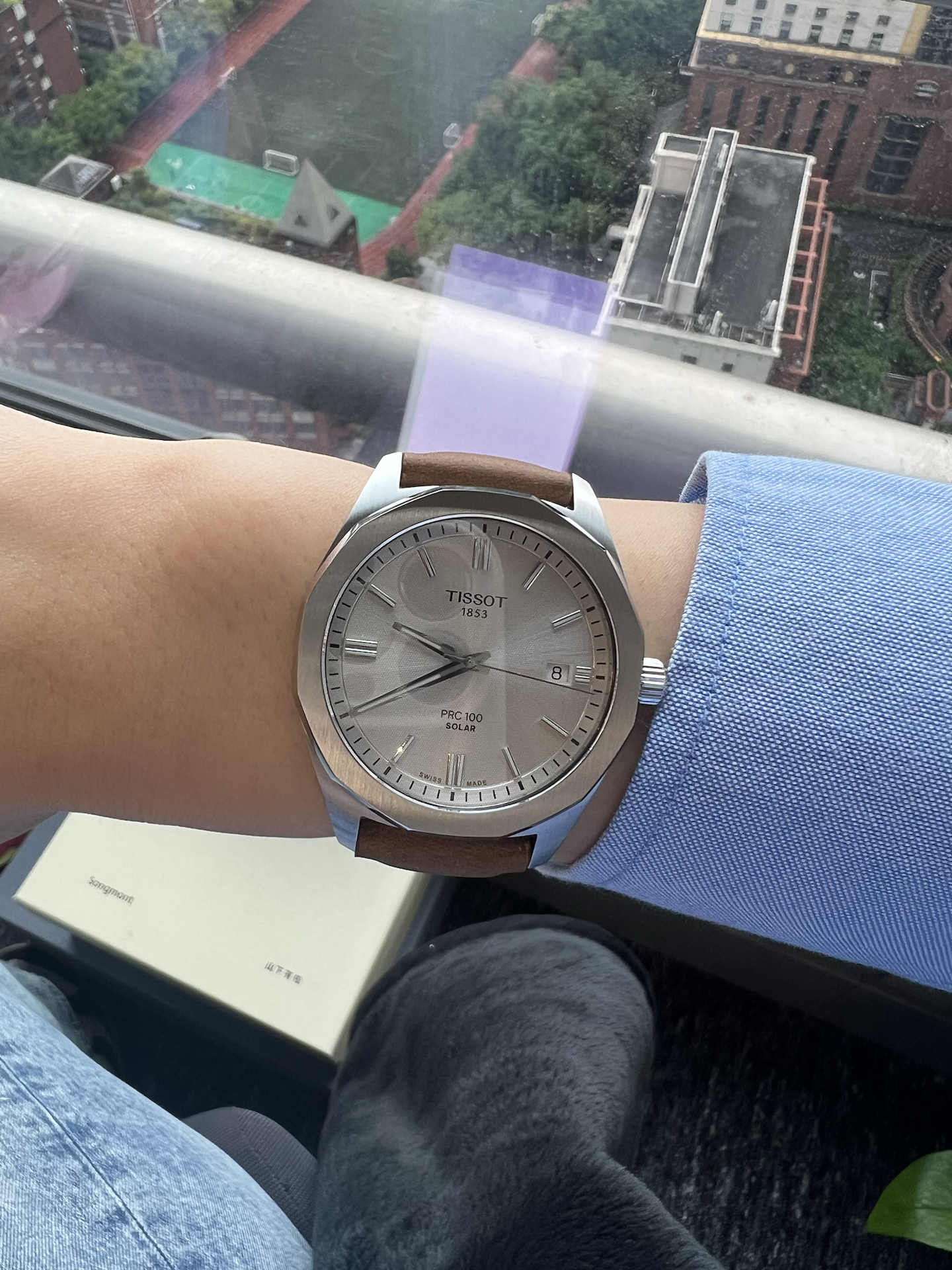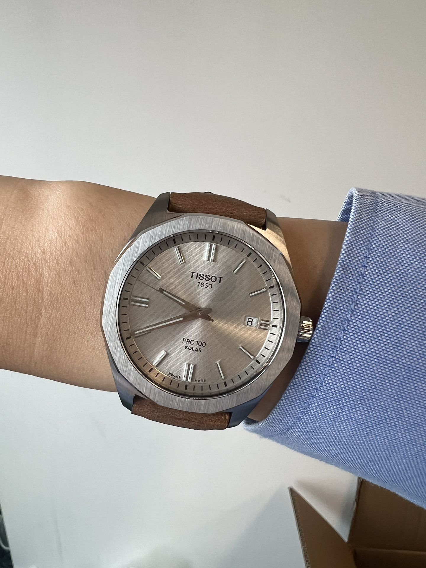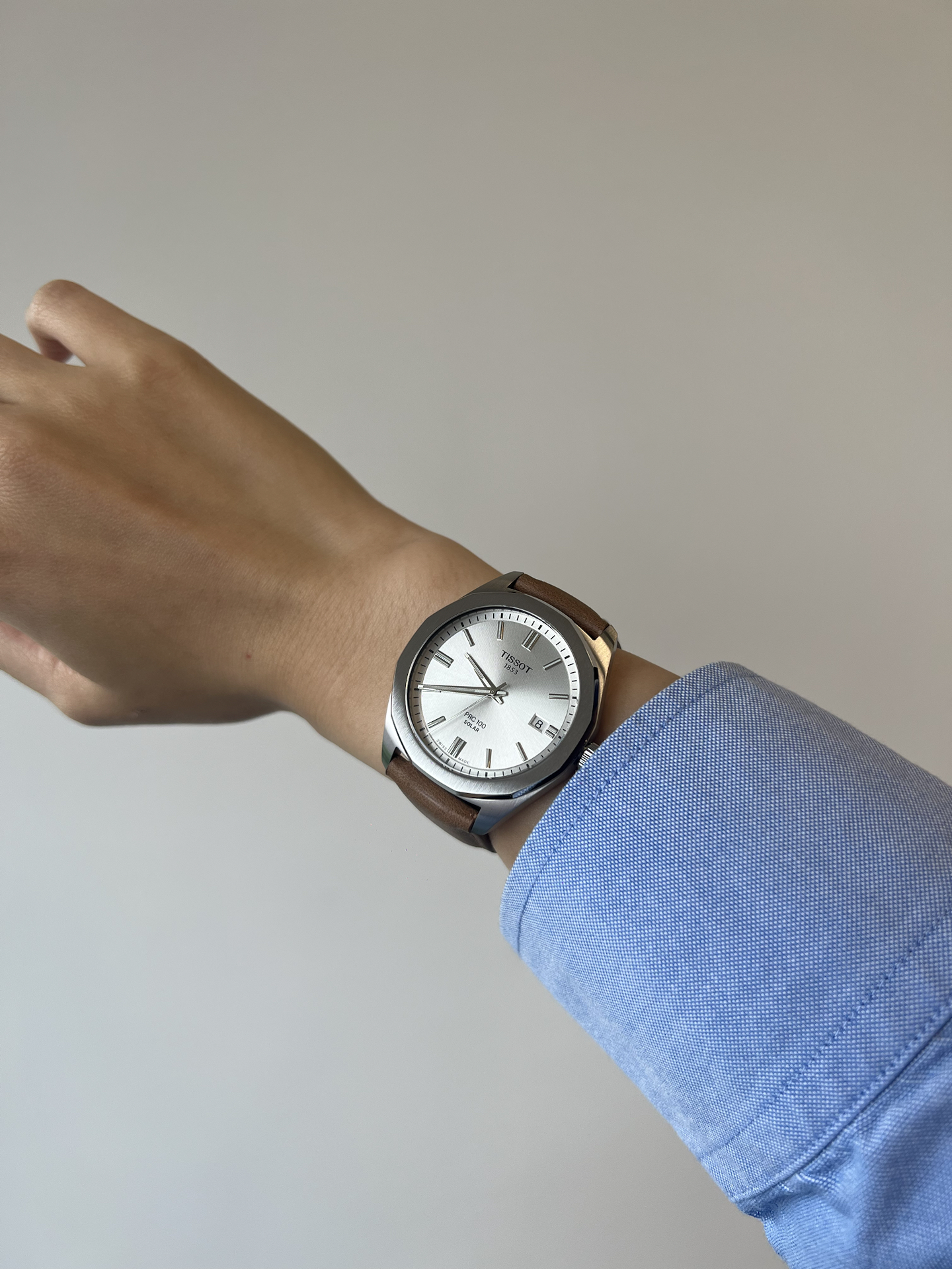 我发现蓝衬衫搭棕色皮表带超绝!天梭这新款表,外观棱角分明,颜色也很耐看~还是太阳能动力,不用总操心换电池!不过表带要是能再软点就更舒服啦,但整体真的很适合日常戴,男大生氛围感直接拉满🥳