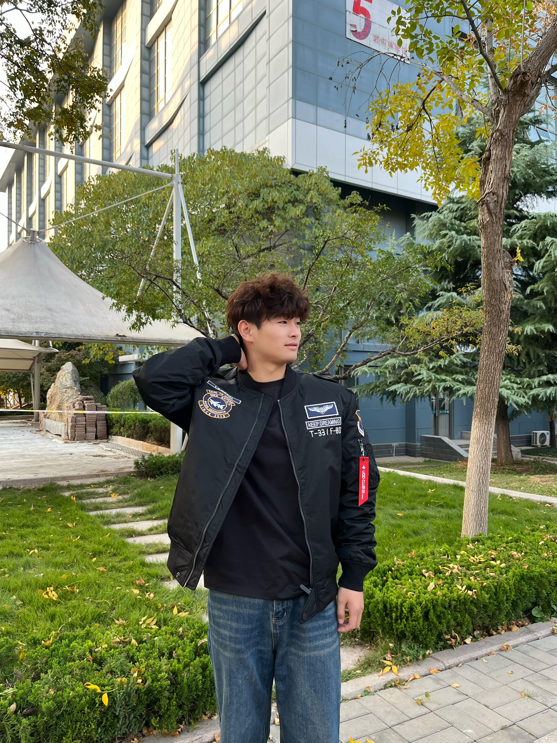 今天上身的是美式黑色飞行夹克 这件黑色飞行夹克上身非常帅 上身徽章设计很有特色 细节做得很好 面料穿着很舒服 版型很立体 不会挑身材 不管是日常出街还是和朋友聚会 穿它都很吸睛 性价比非常高 喜欢这种风格的可以试试
