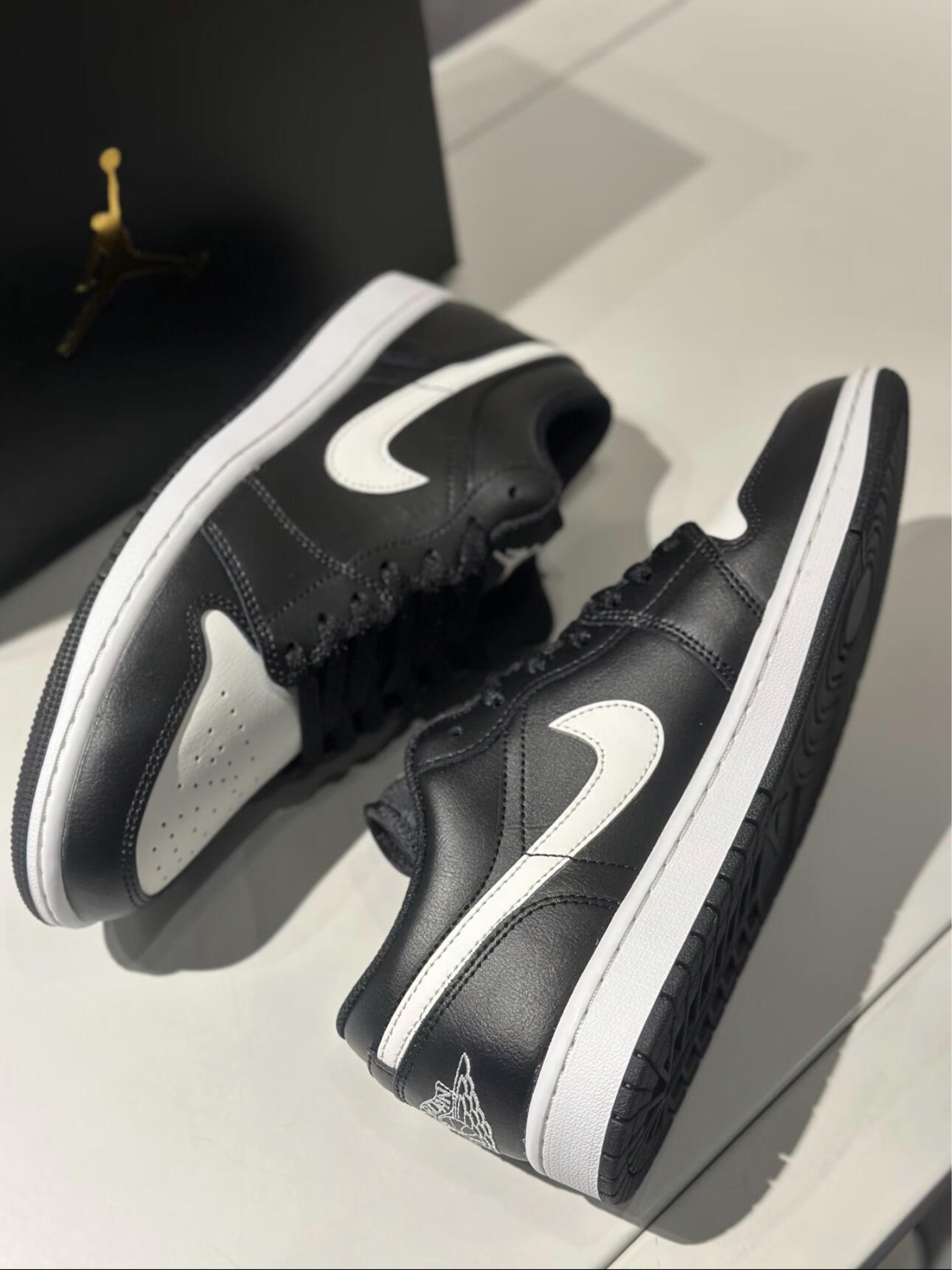 「它精准戳中你的穿搭」 是不是总缺一双“既能撑气场、又不挑衣服”的鞋?这双刚好接住: • 黑白撞色是“永不出错的经典牌”,熊猫配色自带街头辨识度,却不浮夸;荔枝纹皮质硬挺有型,好擦耐造,不用小心翼翼“供着穿”;Low帮鞋型秀气显腿长,脚感软弹不板脚,久走也不压脚背。 • 解决搭配难题:别觉得AJ只能走潮酷风!它搭黑色机能裤+白T恤是“街头酷盖”,配浅蓝牛仔裙+卫衣是“甜酷少女”,连卡其西装裤...
