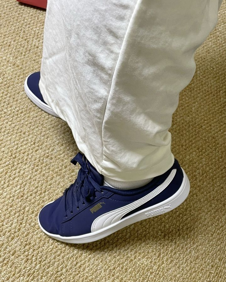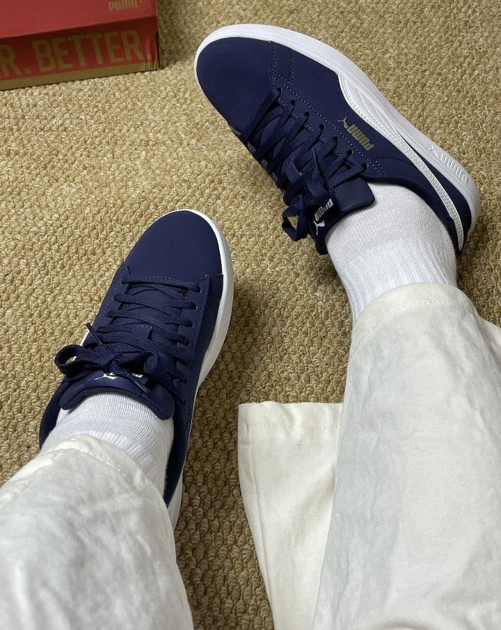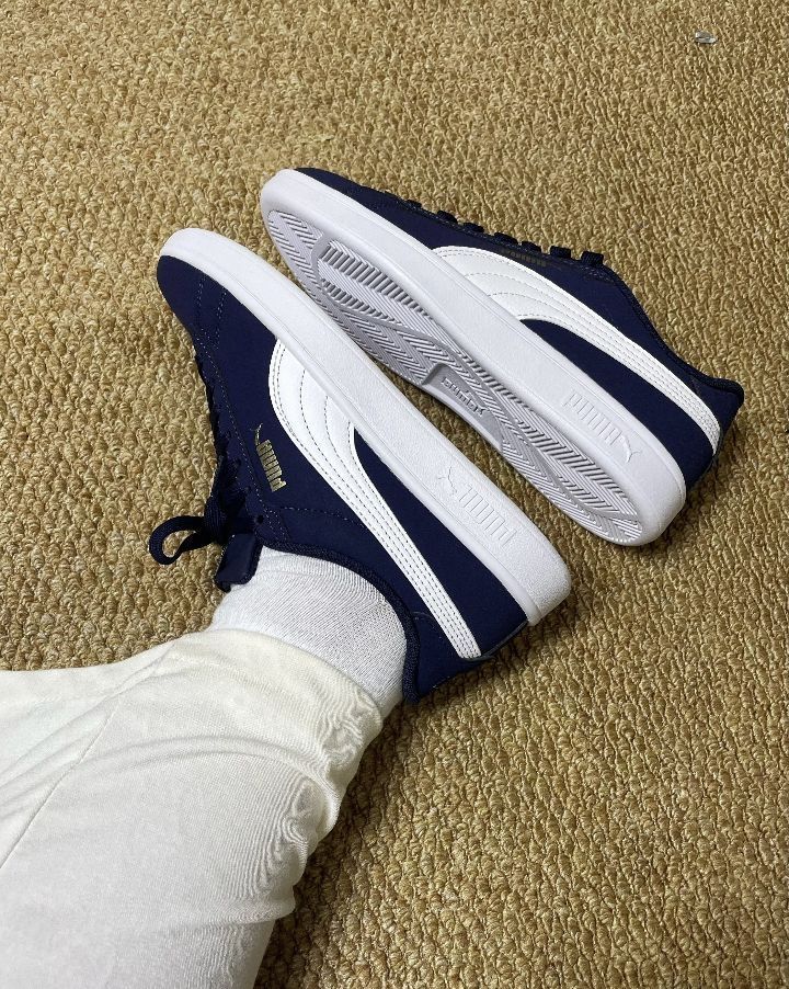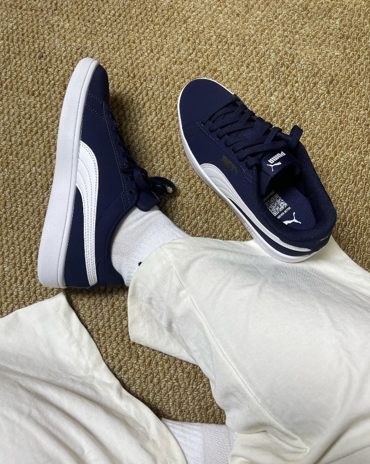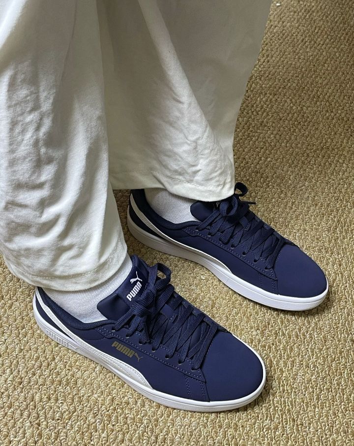 刚入的彪马Smash3.0 经典的蓝白配色 鞋面整体上蓝色的合成皮,耐脏好打理 侧边白色PUMA条纹标志 后跟还有小金标 这是上脚感觉内里很柔软🥰 包裹感很不错,走起路来感觉很轻松 没有什么负担,一天下来脚也不会觉得酸胀 日常搭配也是很百搭 宝子们觉得搭配牛仔裤好看还是休闲裤更好看啊❓