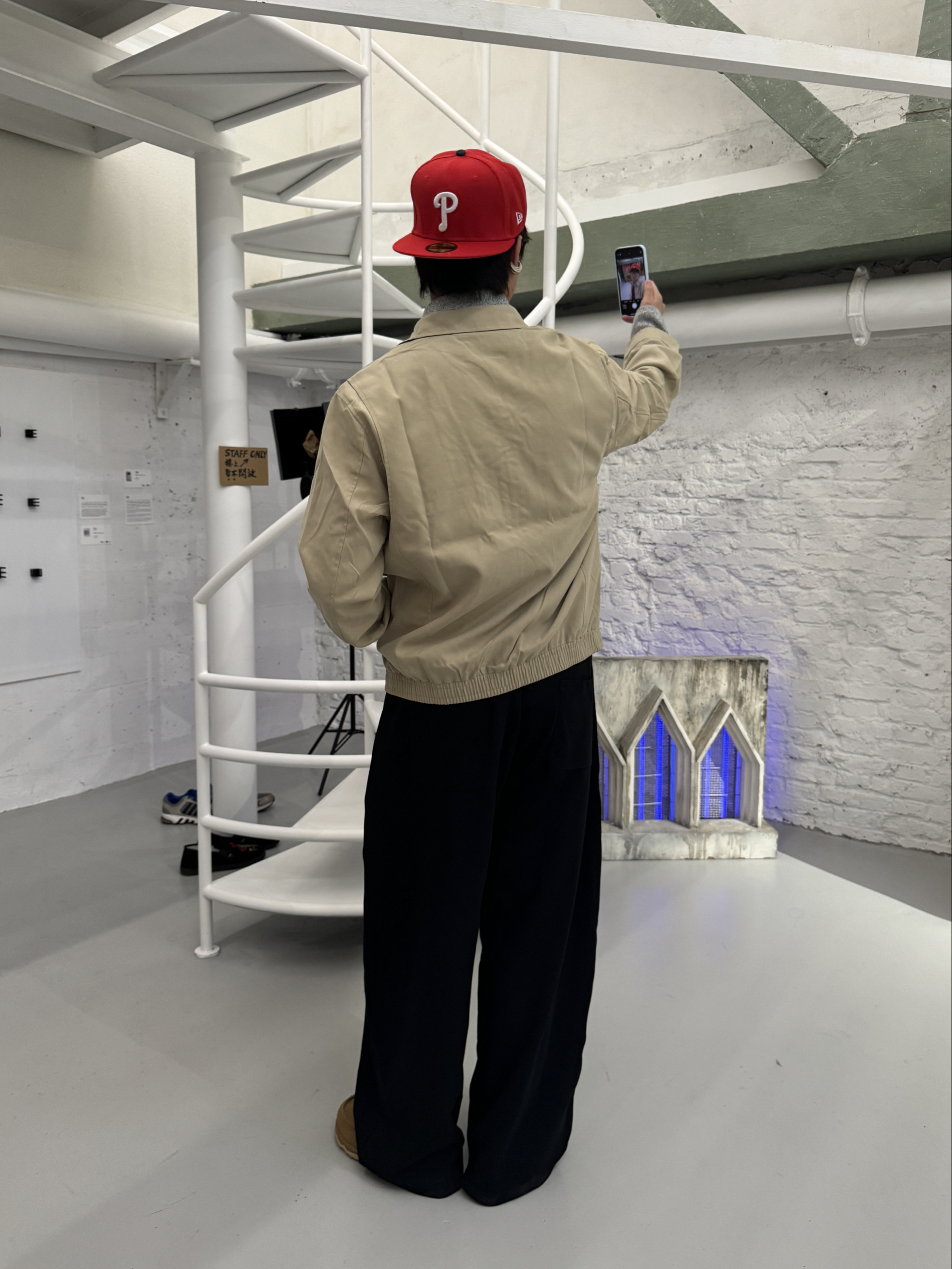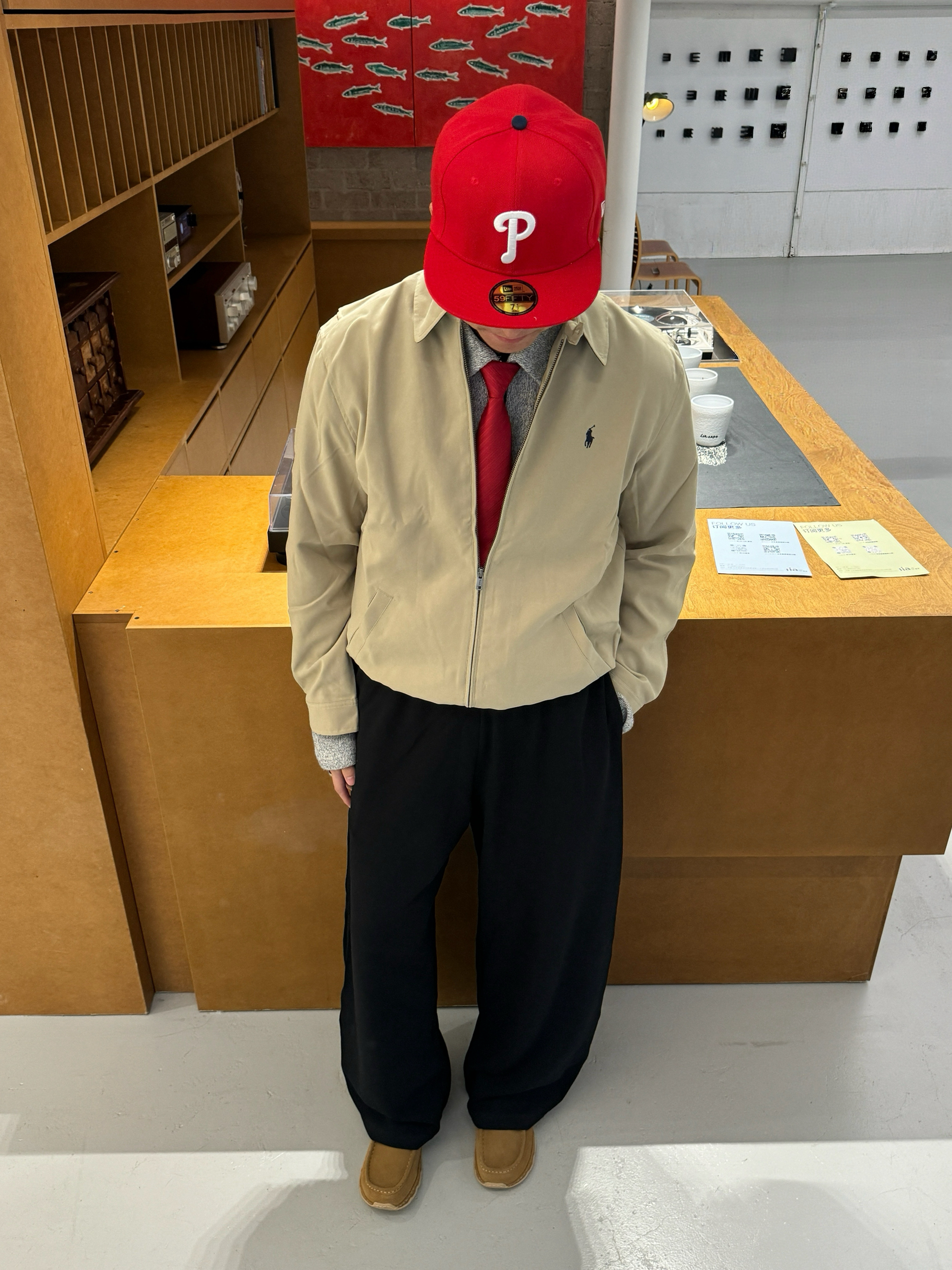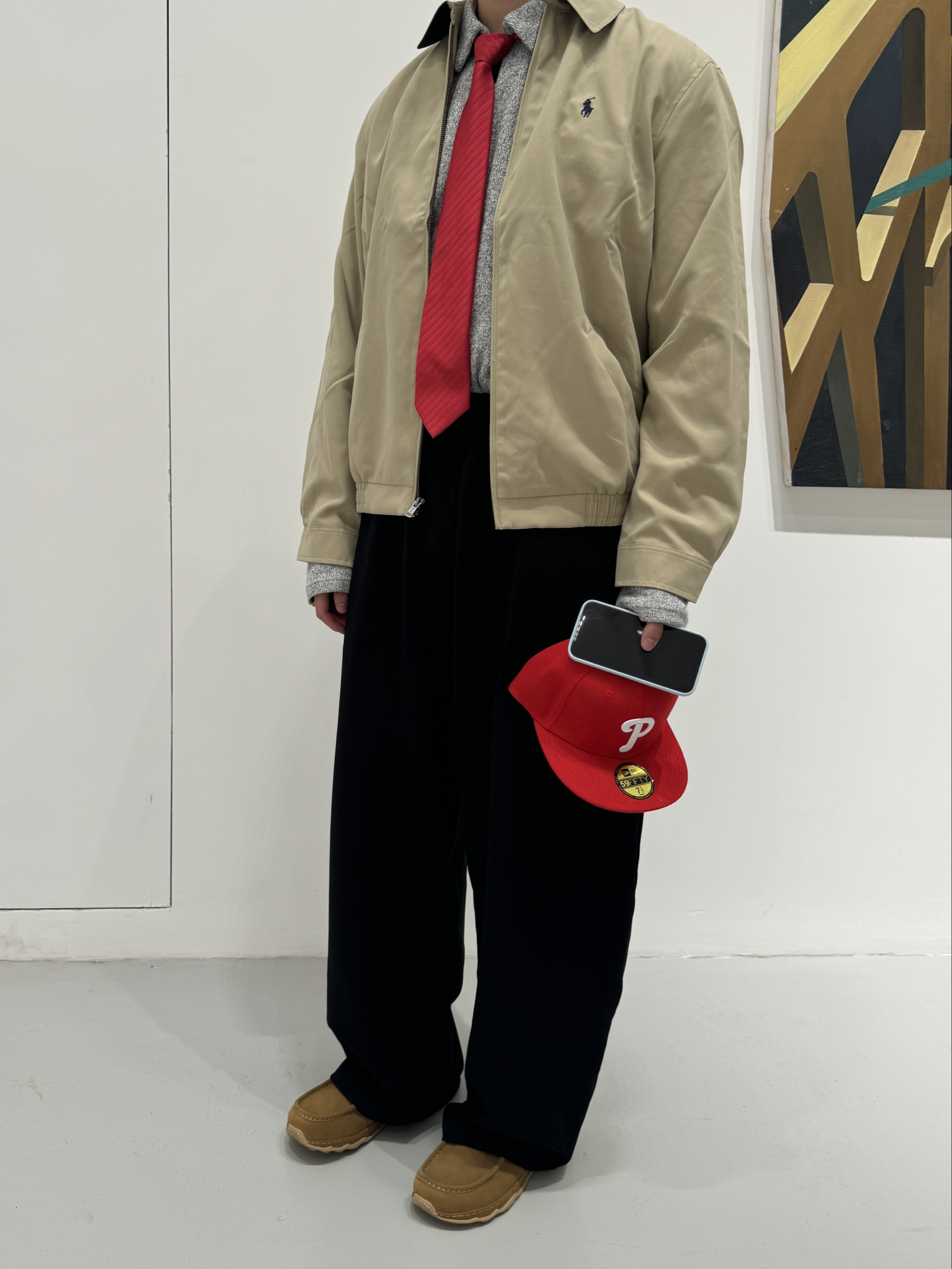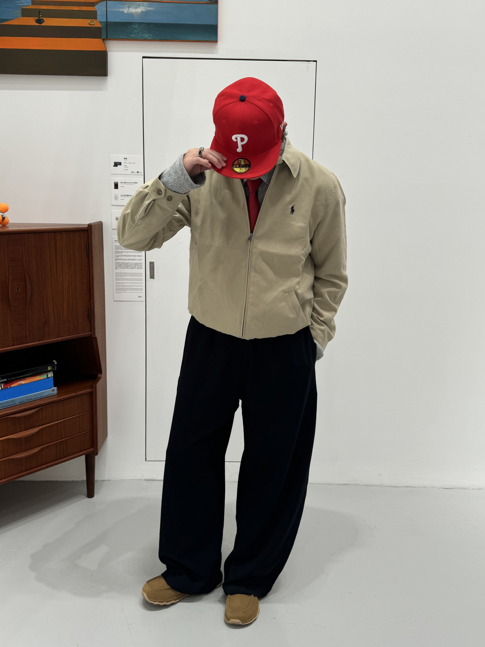 “秋冬总爱低饱和的温柔感? 今天这套「静默复古」穿搭刚好踩中冬日氛围—— 燕麦色短款夹克+炭黑色垂感裤,同色系用材质区分层次(夹克的软面+裤子的绒感),低调里藏着质感; 再用一顶亮红色棒球帽当视觉锚点,沉闷秋冬瞬间跳出松弛的复古腔调~