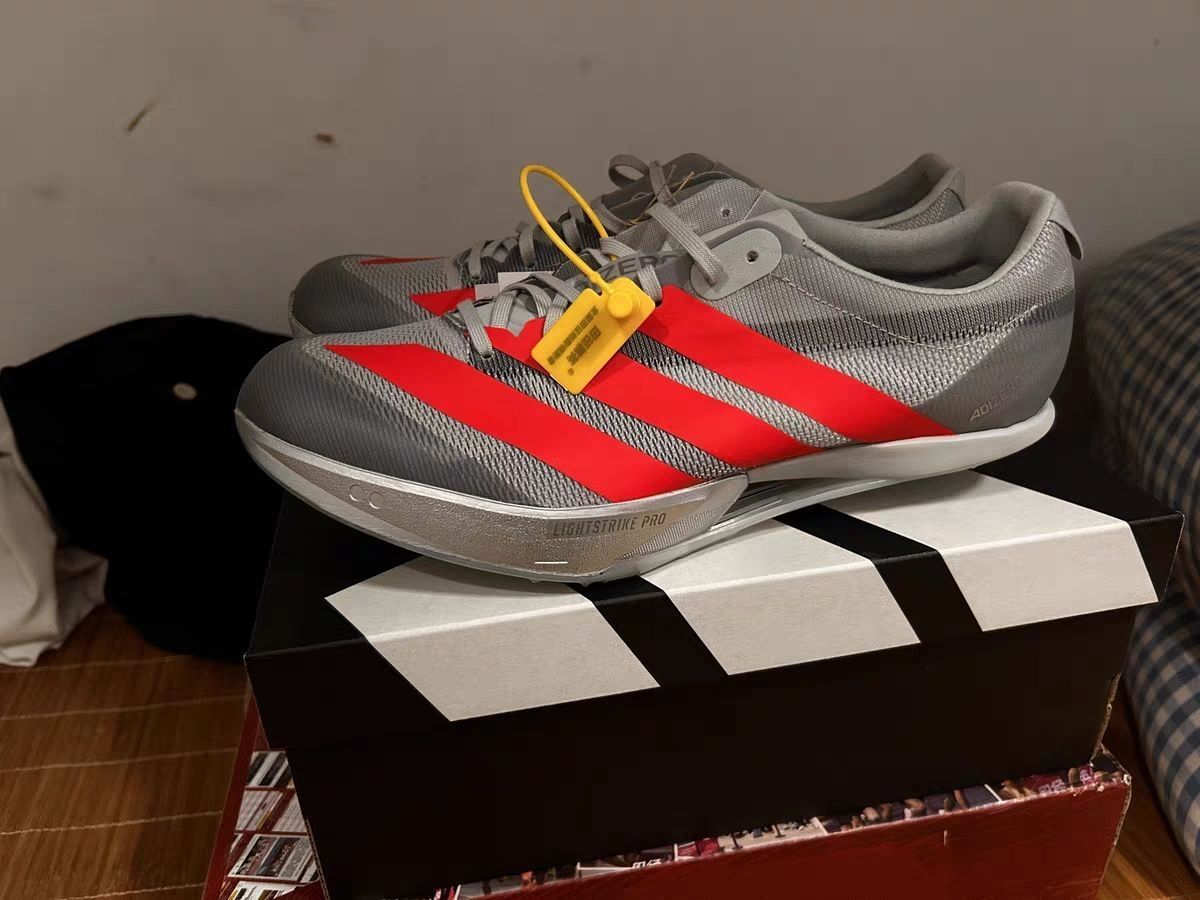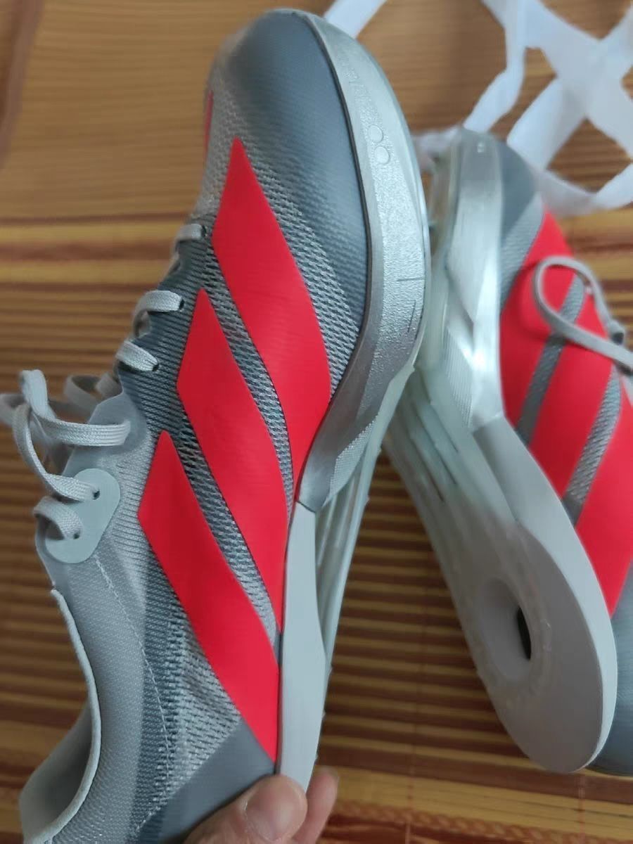 兄弟们!刚上脚这双Adidas大蝉翼四代,先夸颜值——银灰配亮红真的戳我审美,鞋型又酷又锐,前掌翘得特别激进,拿在手里就感觉“这鞋不简单”😎 优点直接拉满: 六钉+5根加强钉抓地稳得一批,镂空后底里的碳板是真东西!上脚包裹感和三代一样舒服,跑起来那叫一个“弹”——前掌厚底给的反馈巨足,滚动感和推进感直接把节奏带起来,抬腿都变轻松了,弯道重心稳得像长在跑道上🏃♂️ 缺点也得说实的: 前掌厚...
