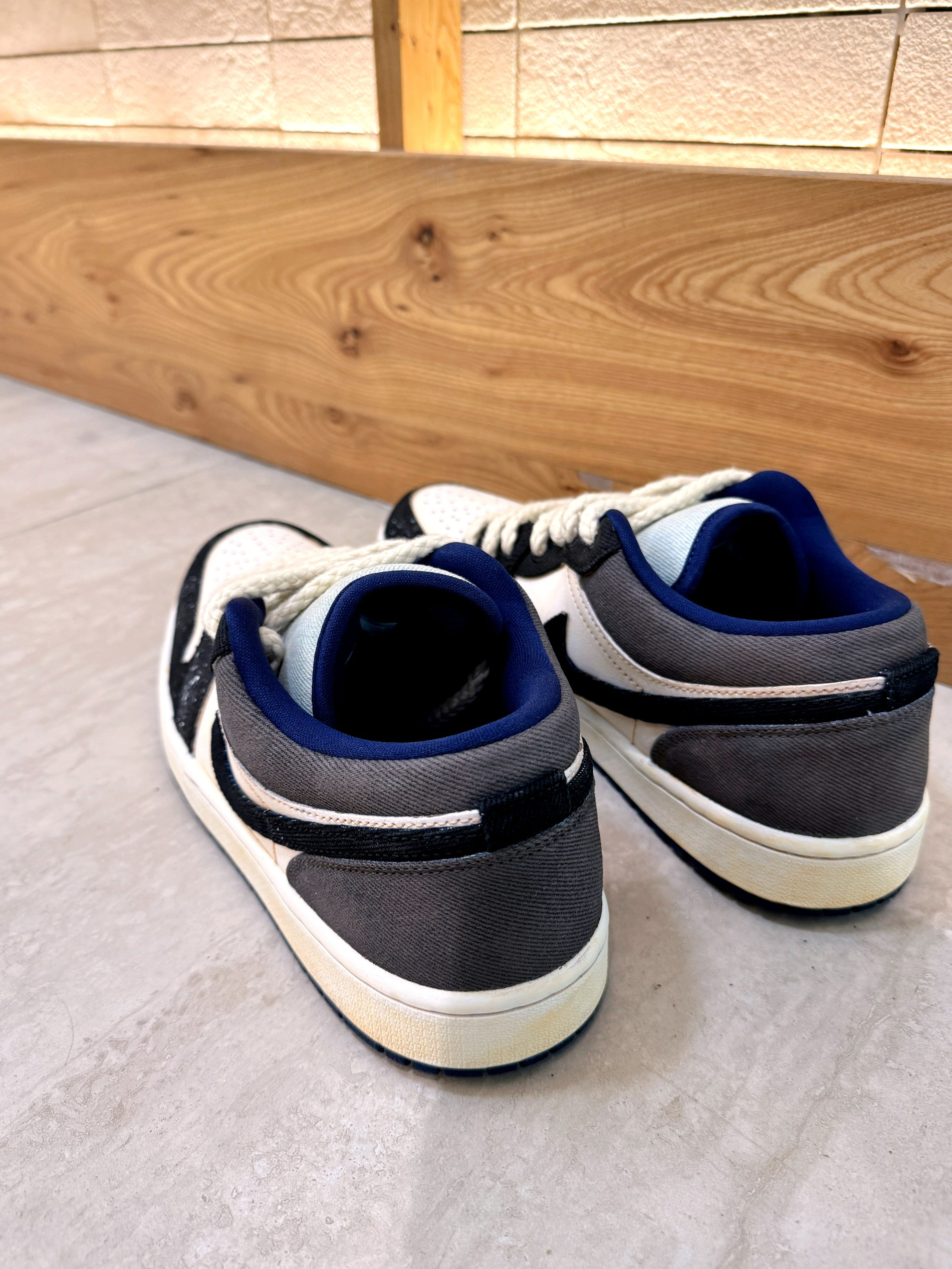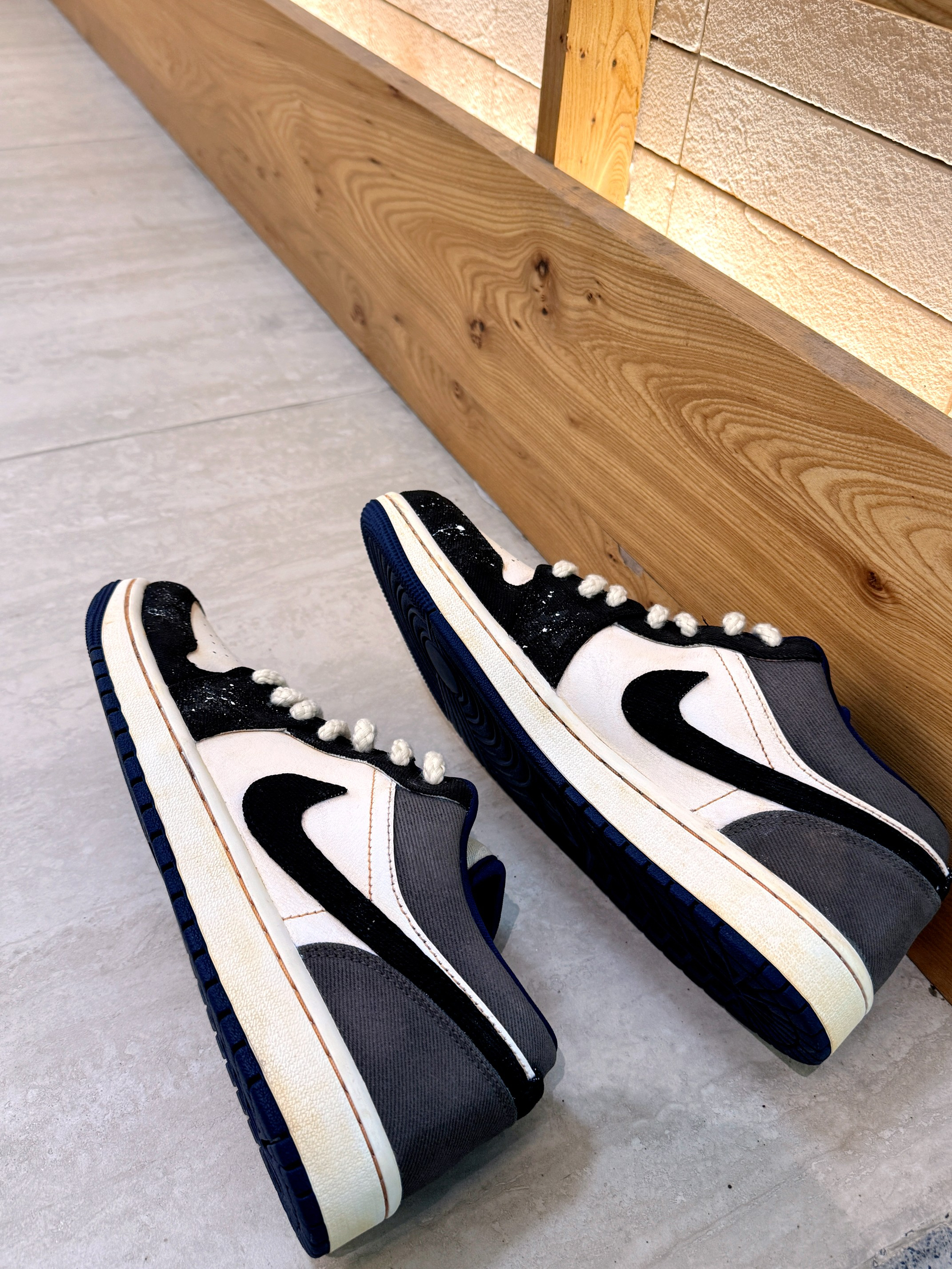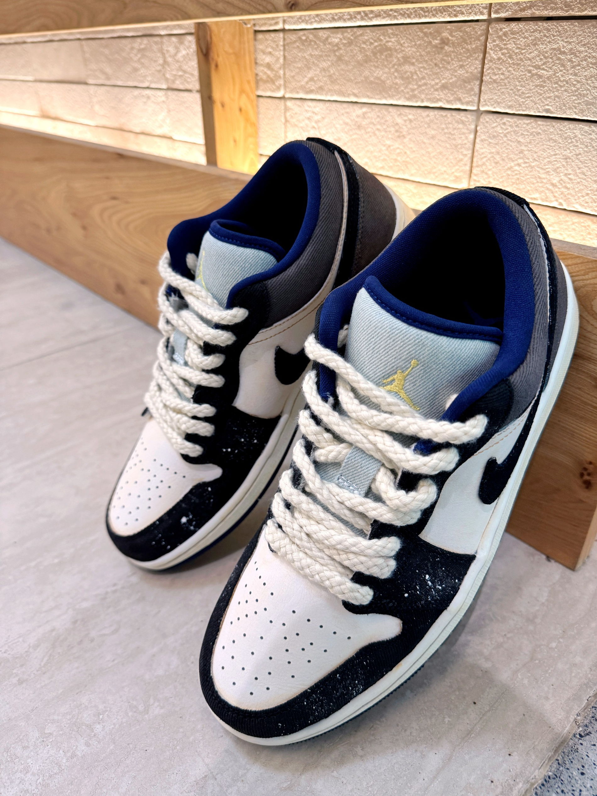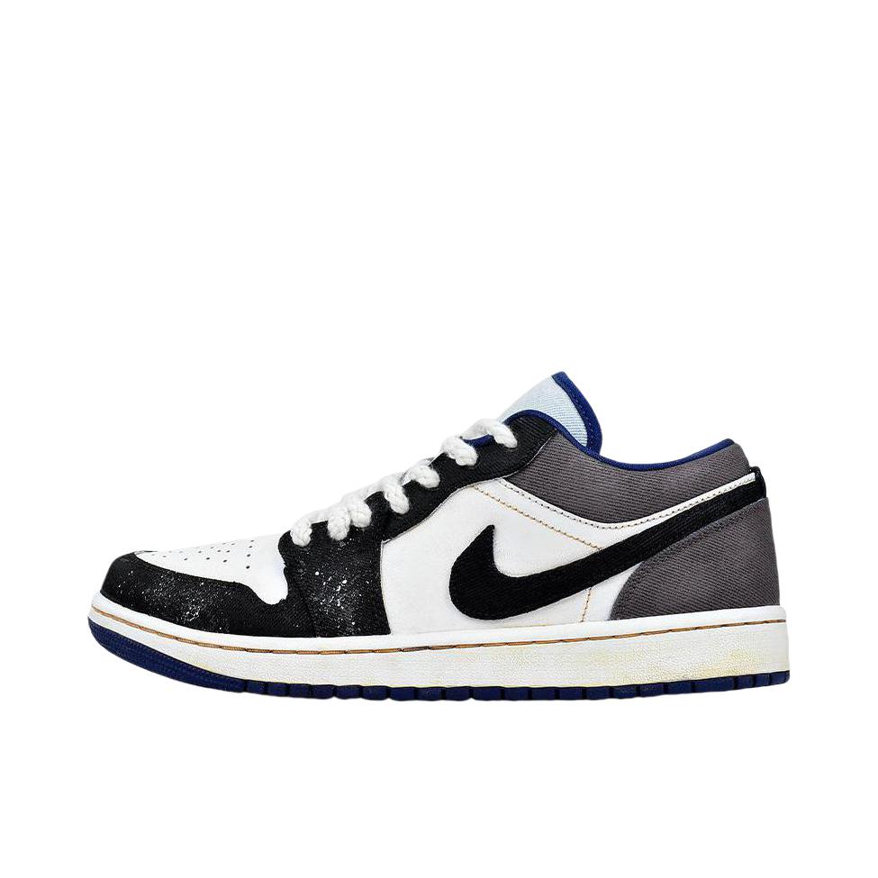 这双 AJ1 低帮,黑白灰配色经典又带泼墨细节,鞋带粗粝有质感,鞋口蓝边点睛。上脚后,鞋型贴合脚面,走路时缓震舒服,长时间走也不累。搭配裤装,不管休闲还是潮流风都能搭,出街回头率拉满,运动穿也很稳,实用又好看~