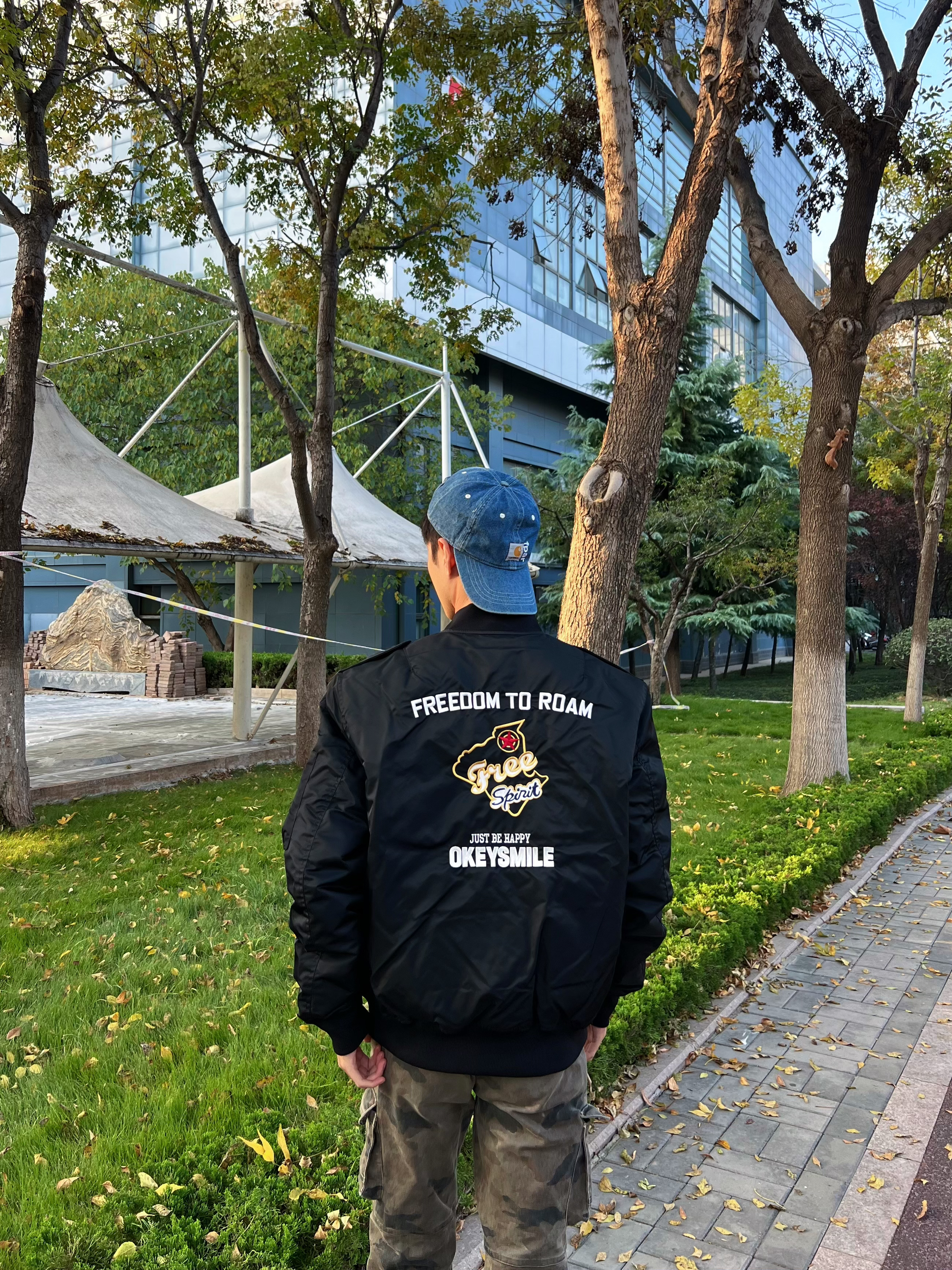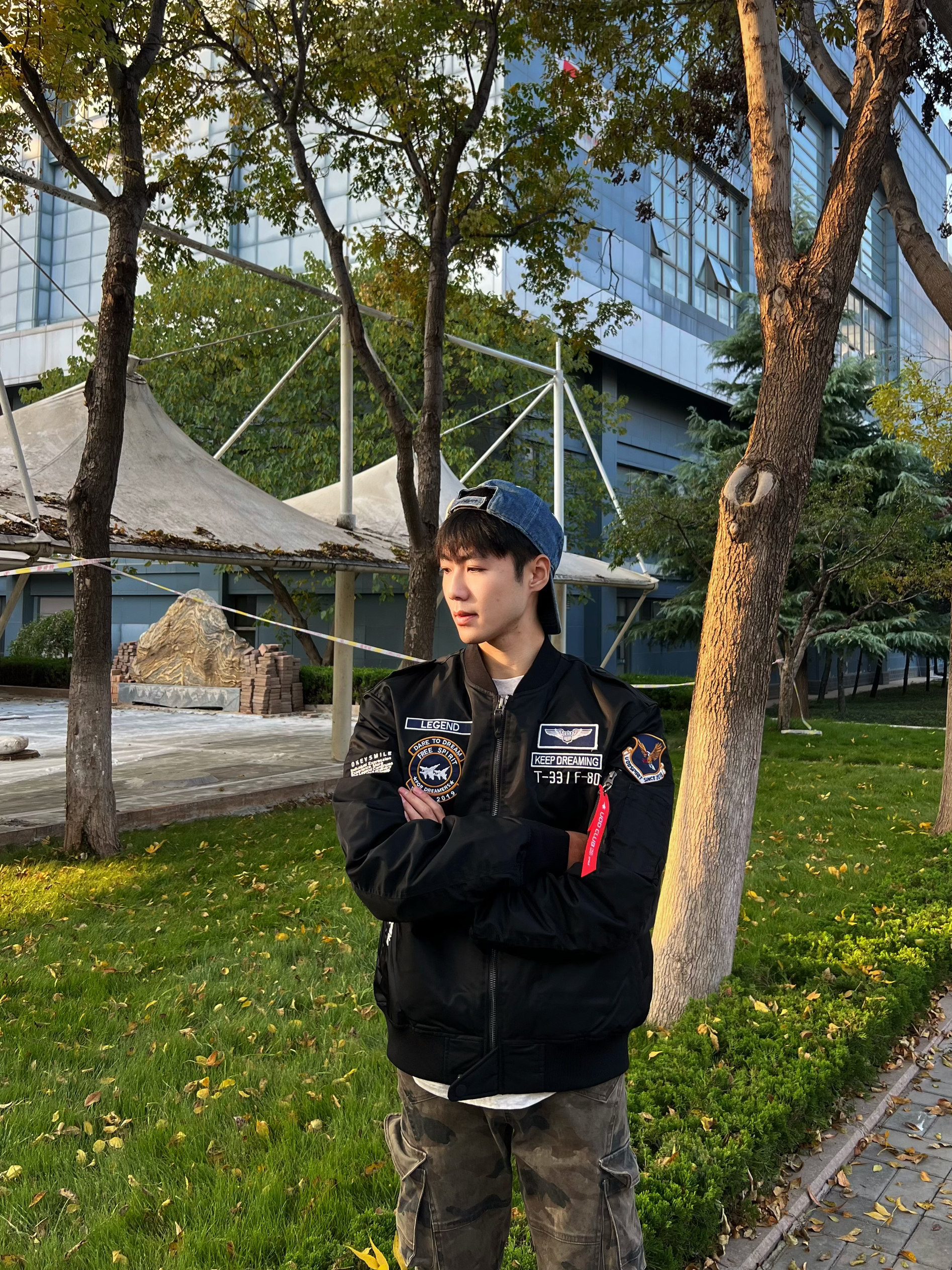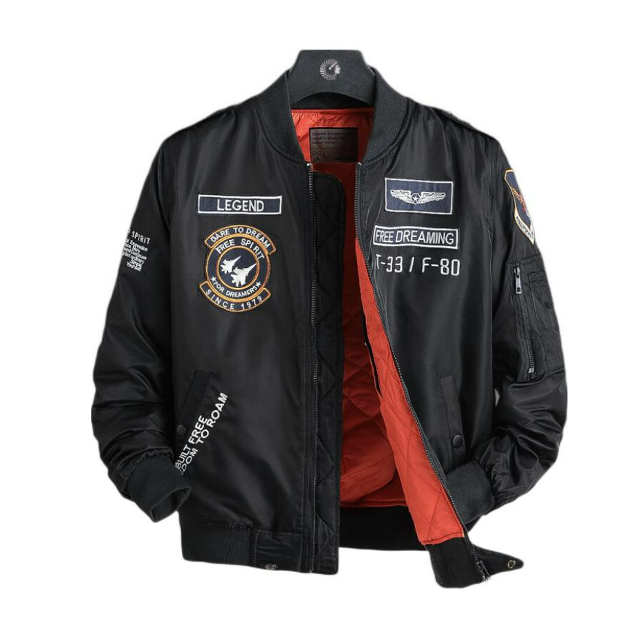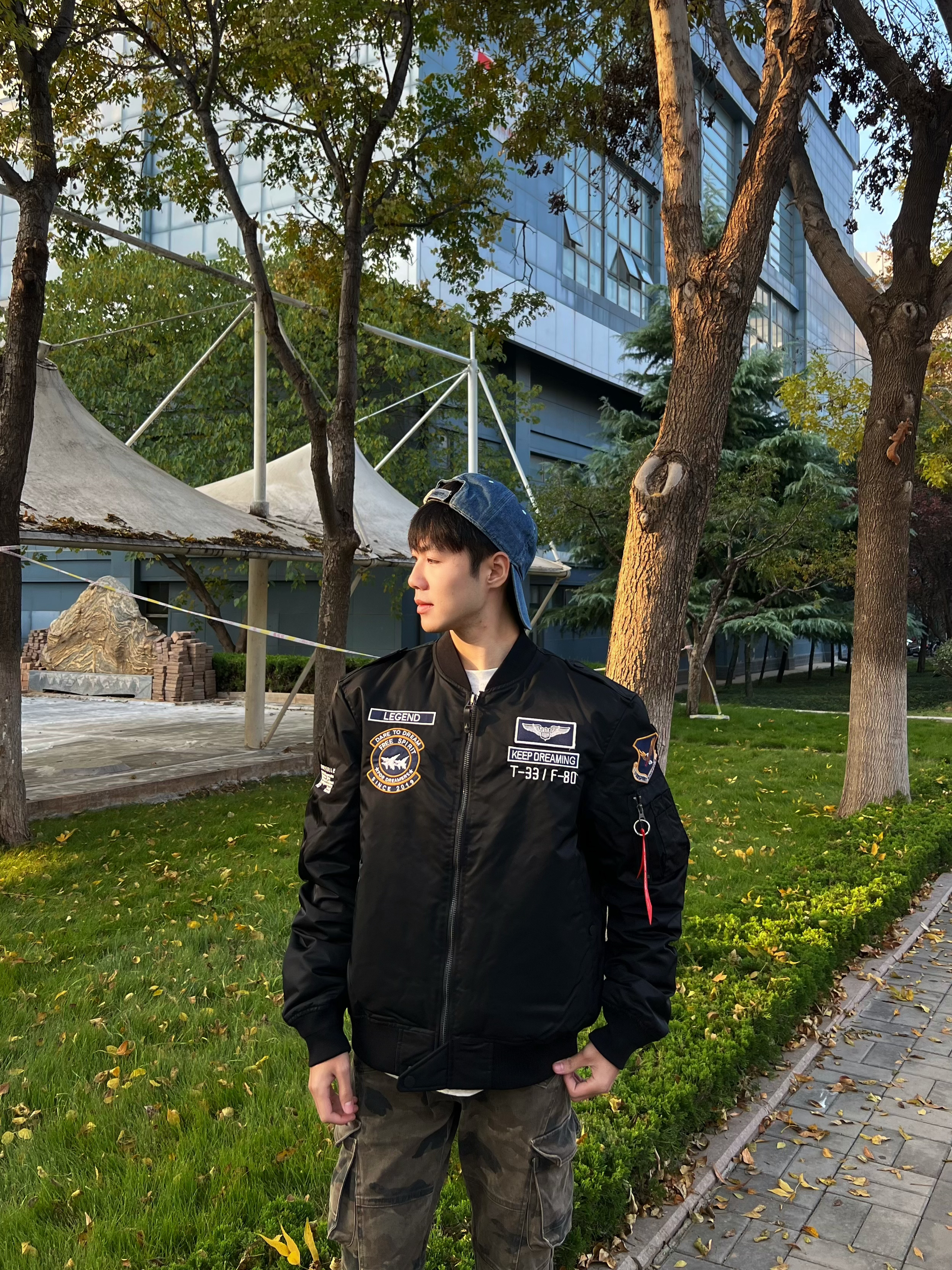 这款飞行夹克加赛车的设计 设计感十足,穿上十分帅气 肩部裁剪立体更显身材 配上迷彩裤真是一绝