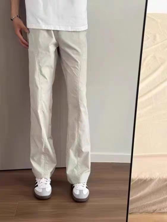 这款米白色斜切微喇冲锋裤,专为夏日打造!清凉薄款面料自带凉感,速干透气不闷热。微喇斜切设计拉长腿部线条,兼顾美式休闲与都市潮流。直筒裤型利落有型,户外出行或日常穿搭都能轻松驾驭。